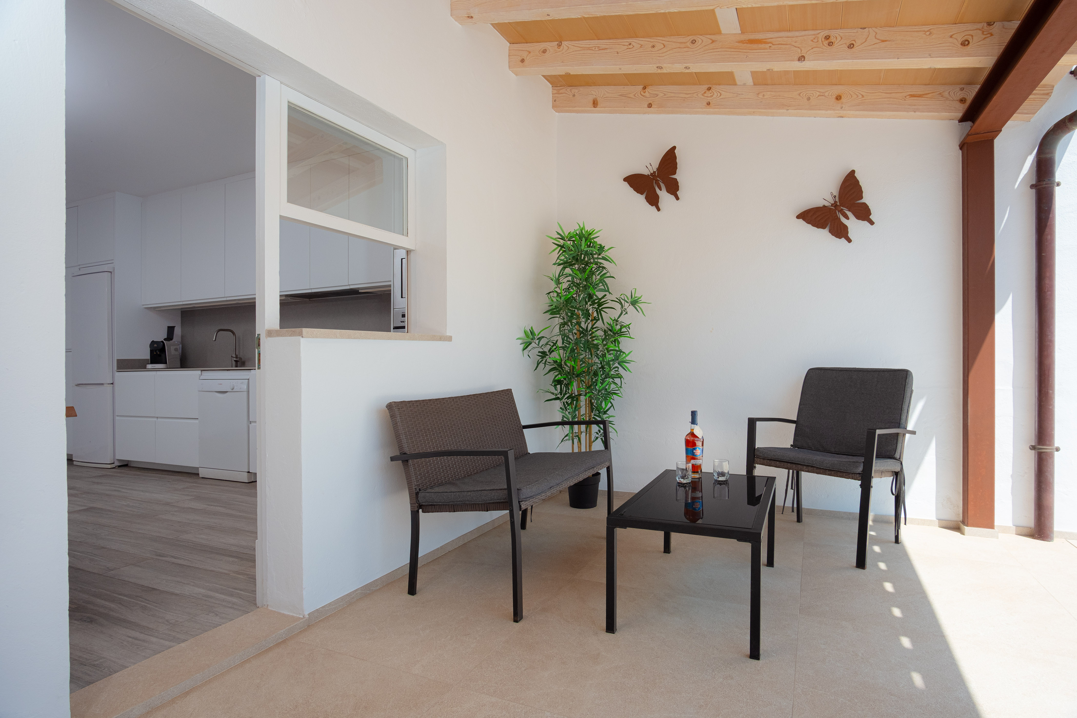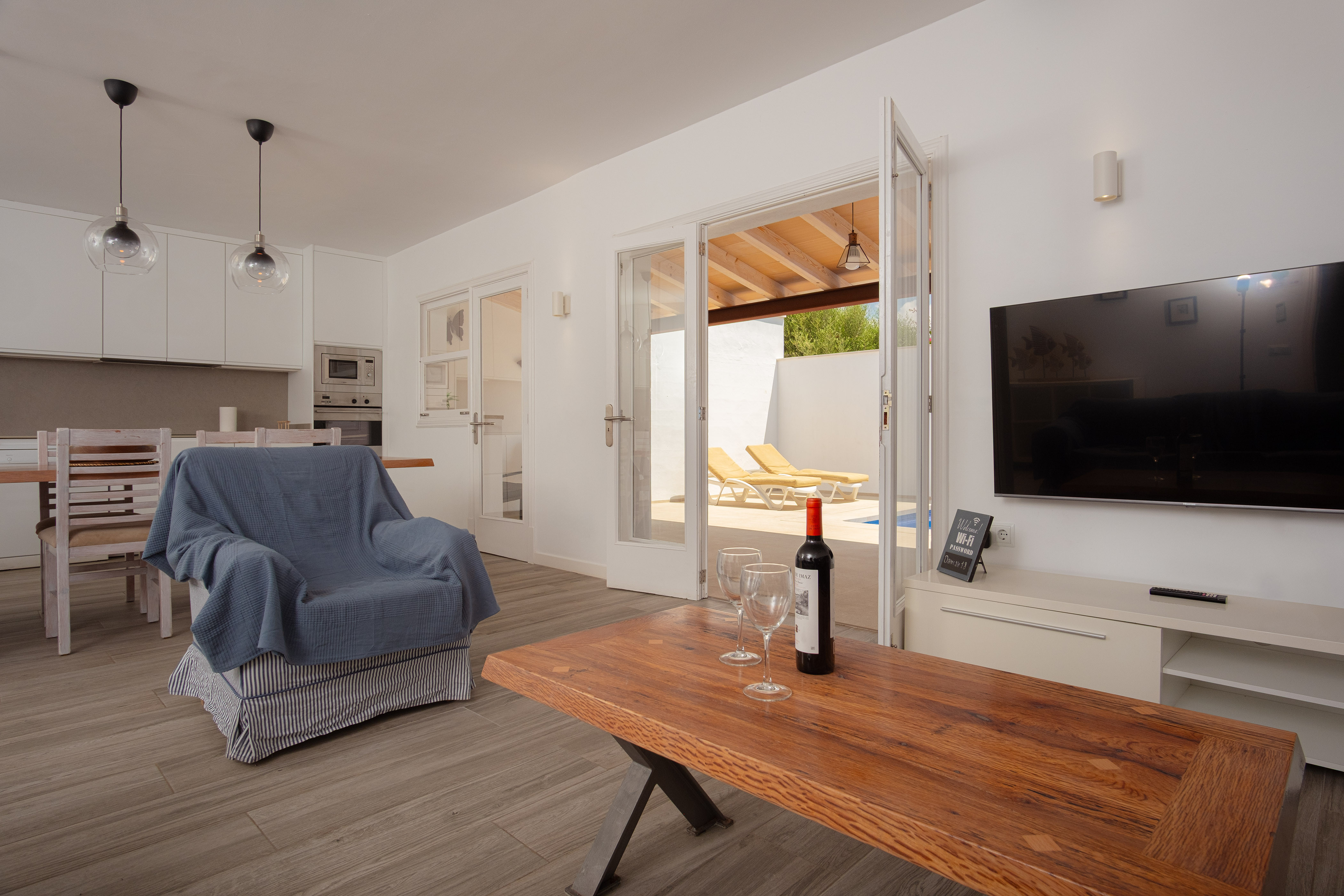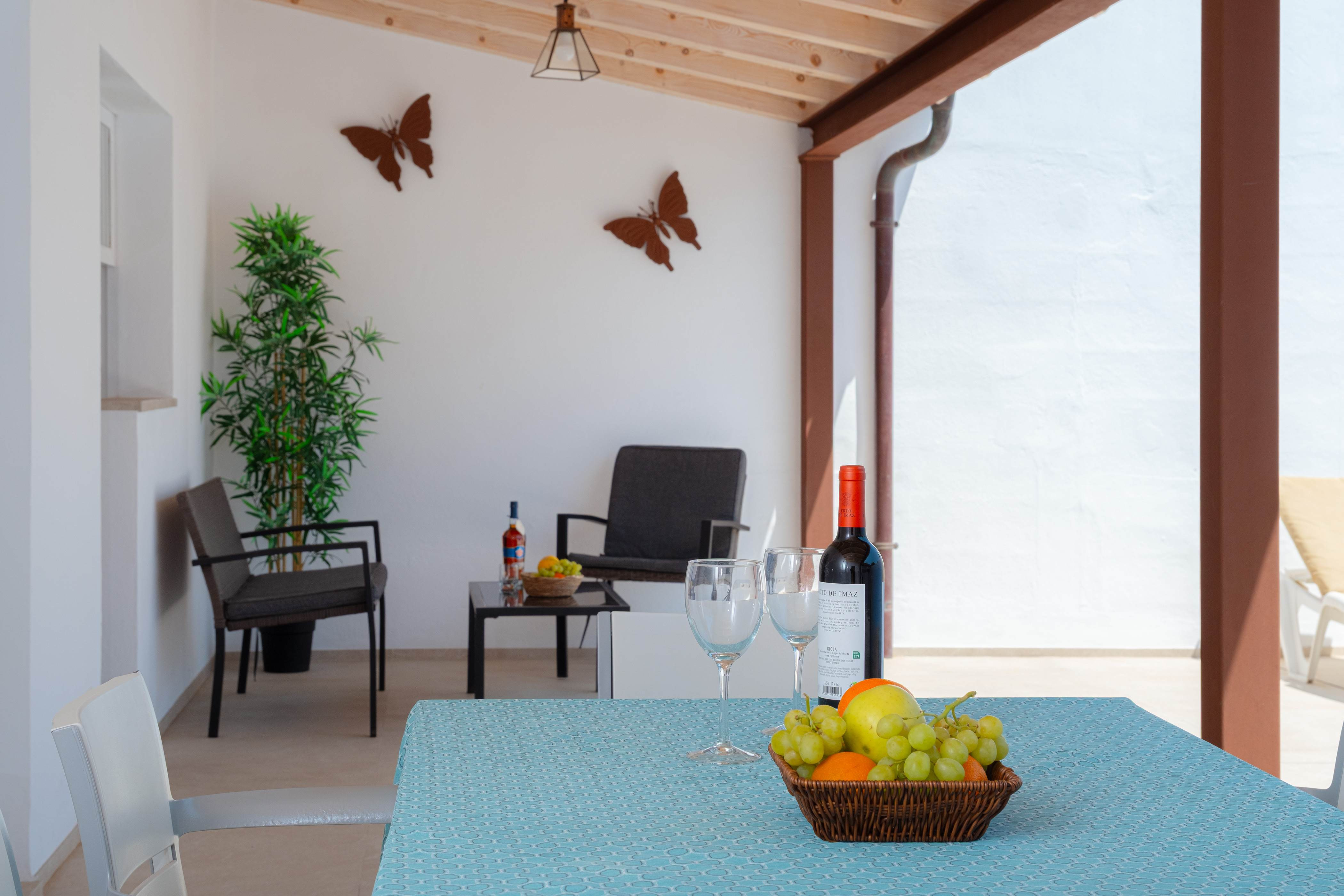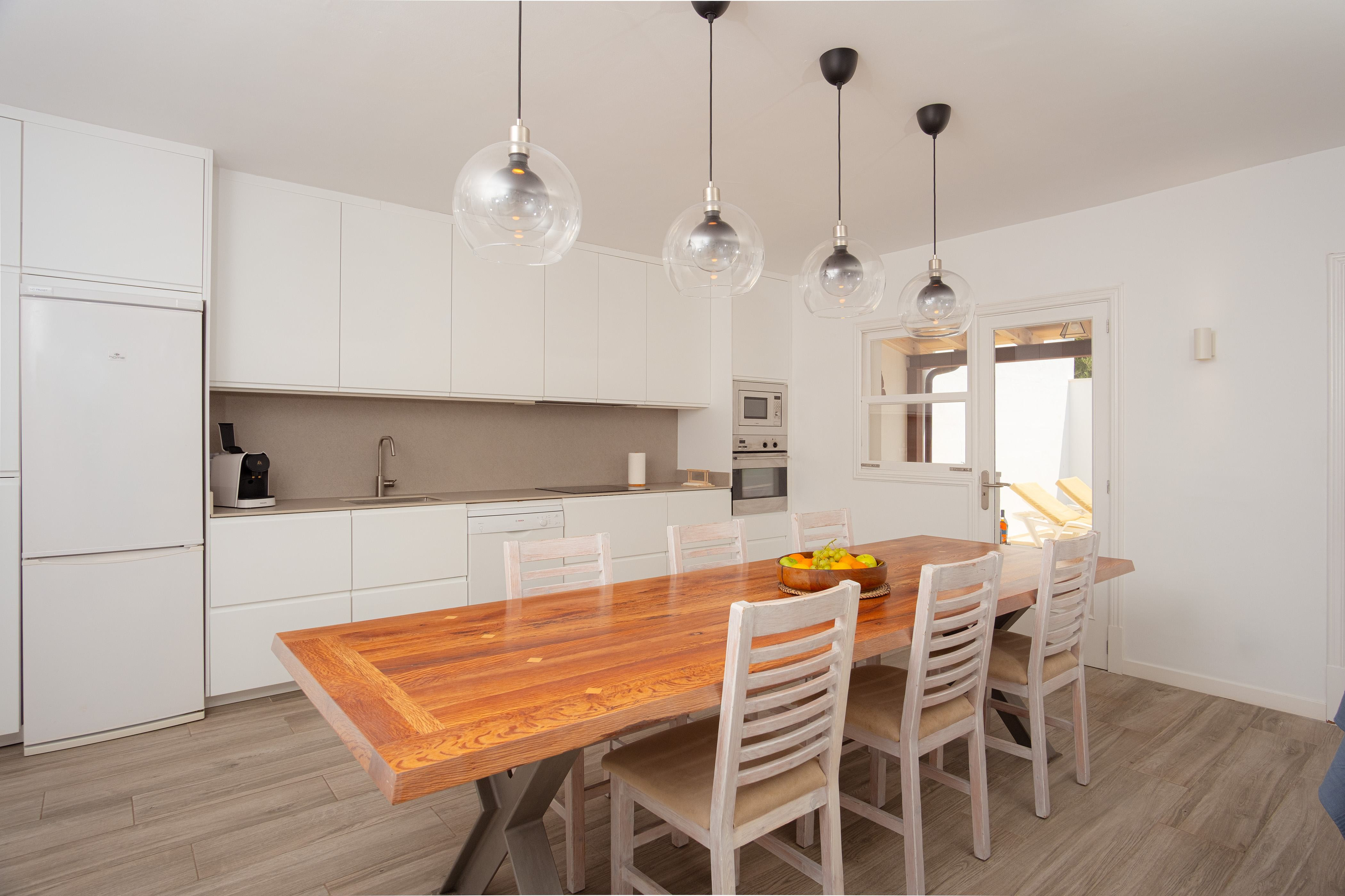 Binnen vindt u een geweldige woonkamer waar u TV-Sat kunt kijken en een dutje kunt doen terwijl u afkoelt met de airconditioning of samen luncht. De moderne en aparte keuken beschikt over een gaskookplaat en alles wat u nodig heeft om uw favoriete gerechten te bereiden. Er zijn twee badkamers met douche en drie slaapkamers in het huis. Ze zijn allemaal voorzien van een kast en een ventilator. Twee van de slaapkamers hebben een tweepersoonsbed en de laatste heeft twee aparte bedden, de laatste twee met airconditioning. Als u met uw baby reist, kunnen wij een kinderbedje en een kinderstoel klaarzetten. Op het terras vindt u de wasmachine, strijkijzer en strijkplank.