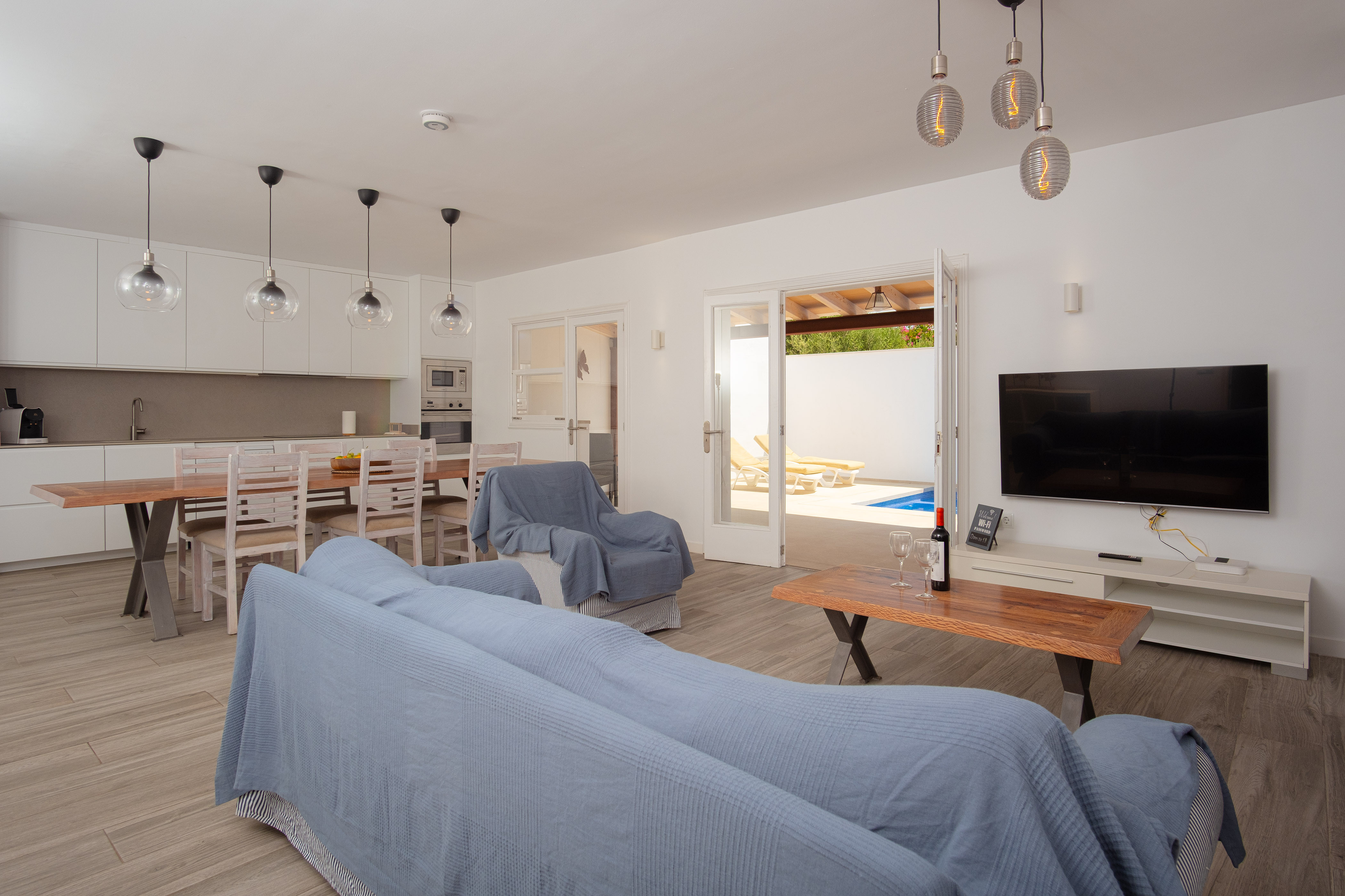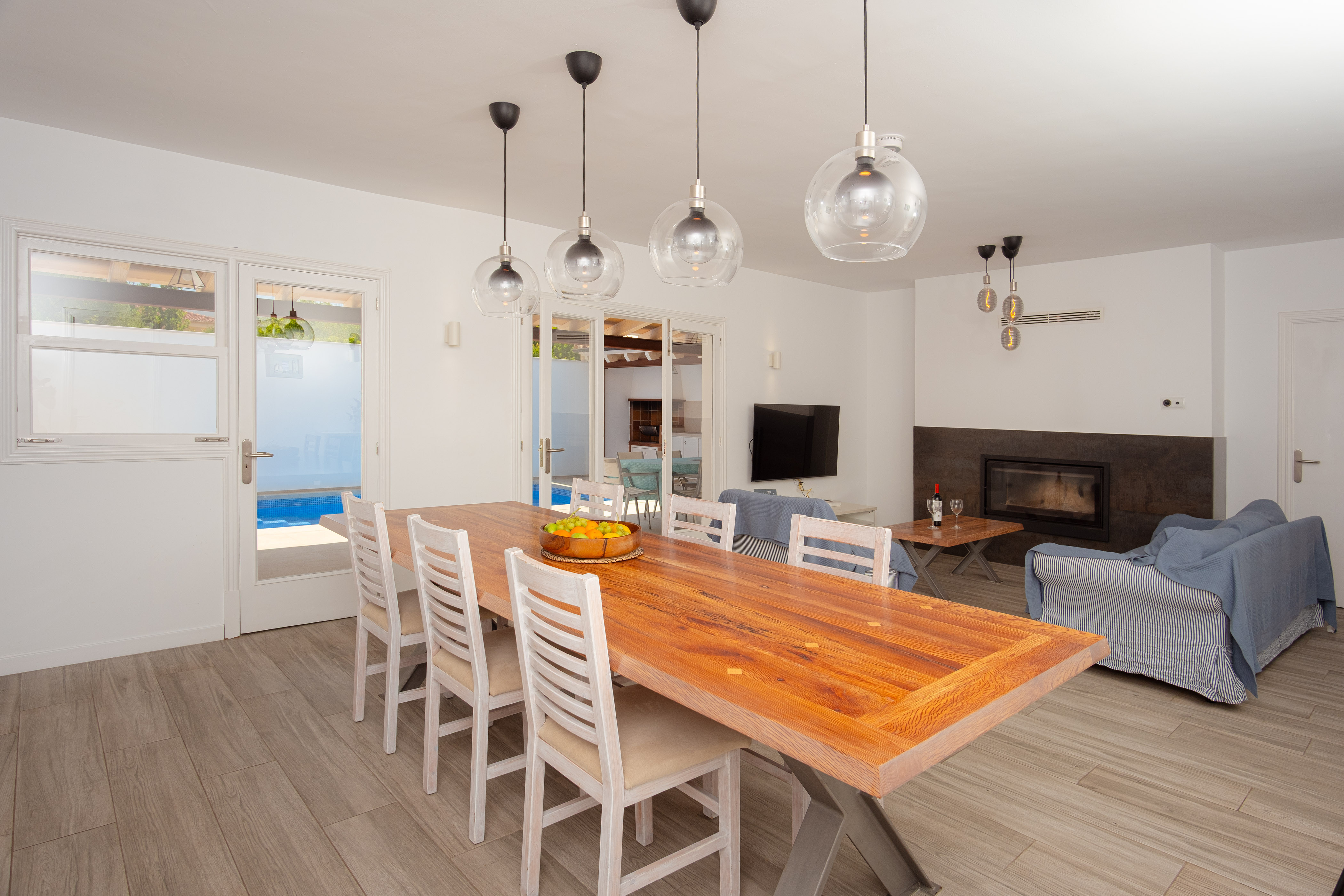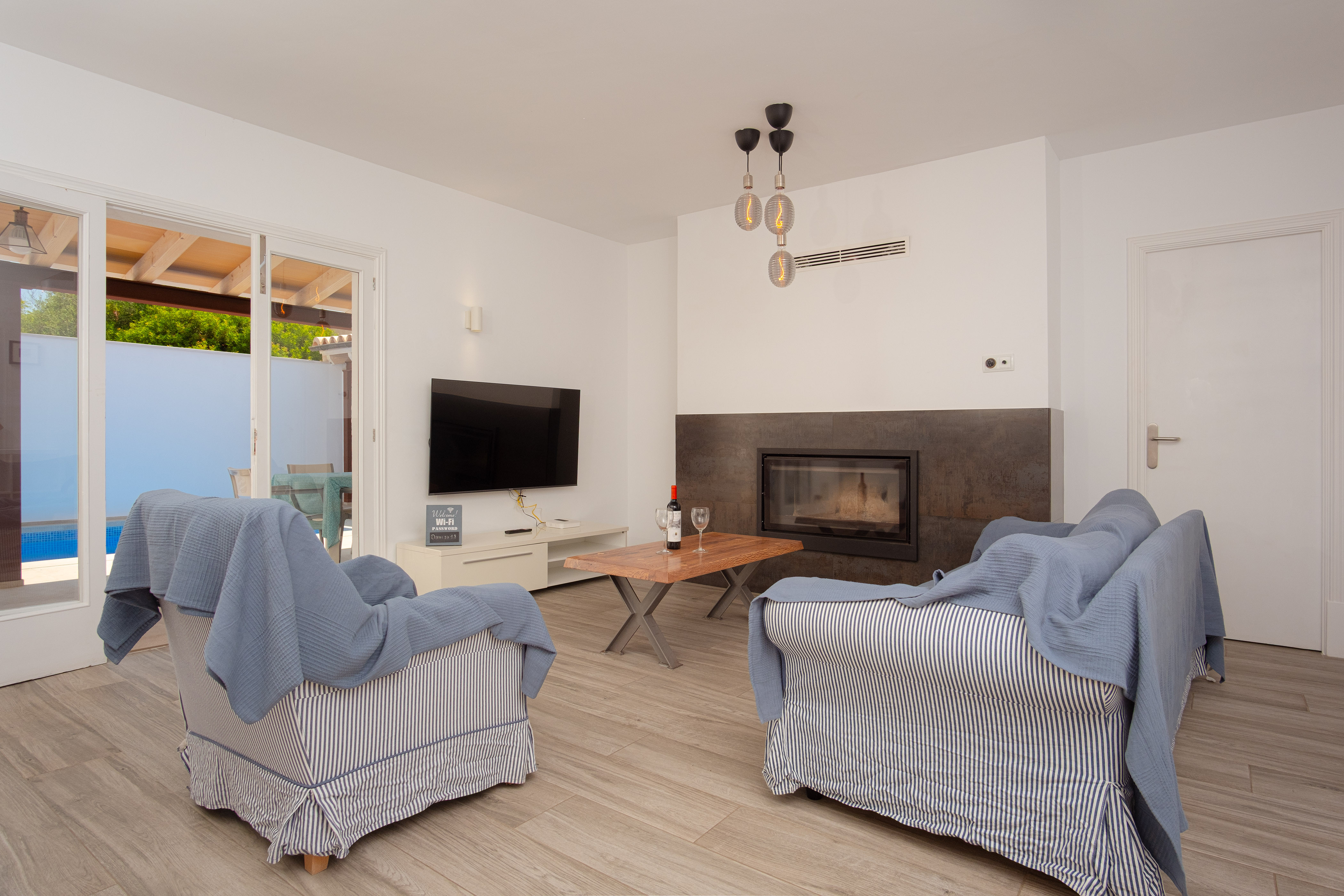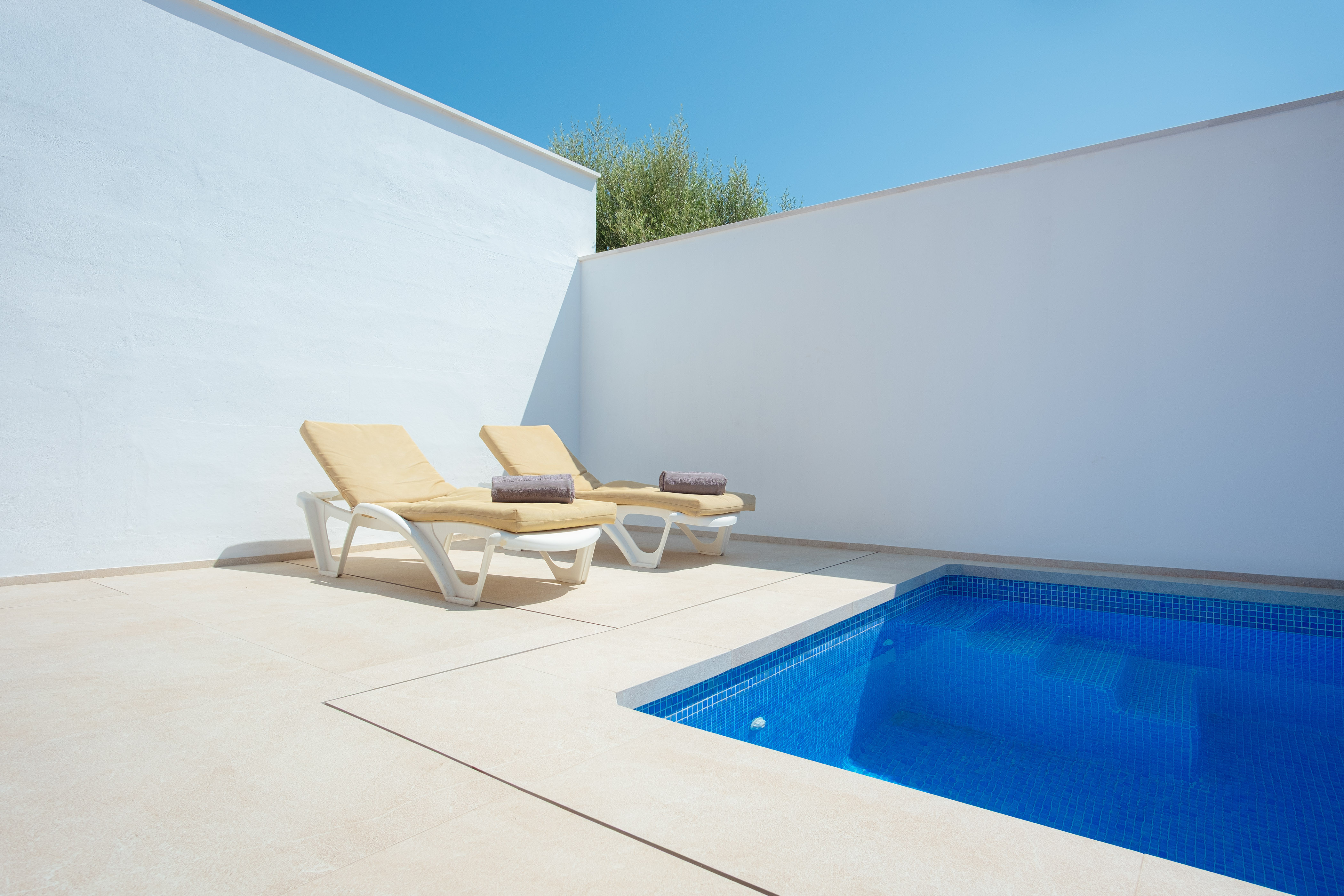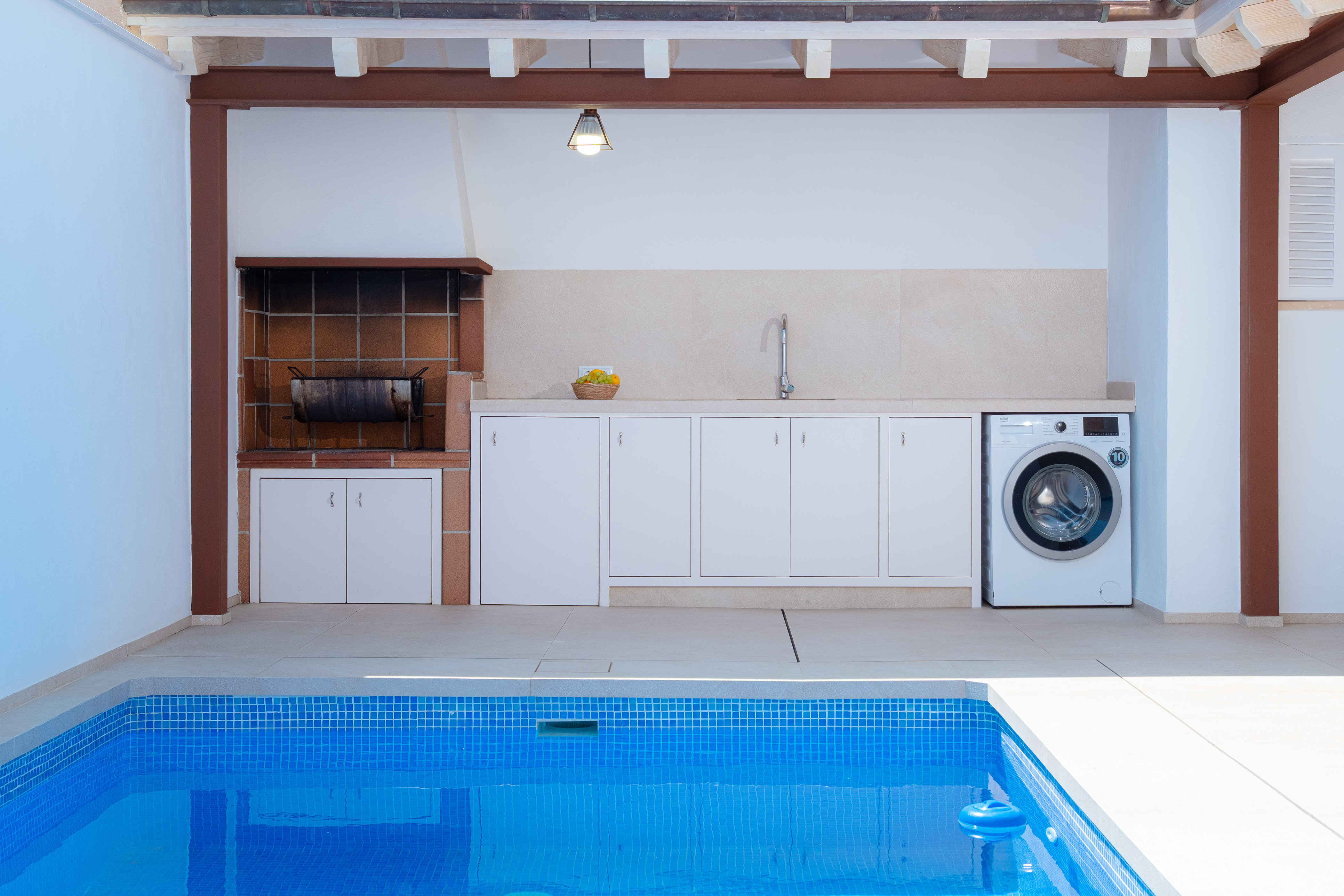 Binnen vindt u een geweldige woonkamer waar u TV-Sat kunt kijken en een dutje kunt doen terwijl u afkoelt met de airconditioning of samen luncht. De moderne en aparte keuken beschikt over een gaskookplaat en alles wat u nodig heeft om uw favoriete gerechten te bereiden. Er zijn twee badkamers met douche en drie slaapkamers in het huis. Ze zijn allemaal voorzien van een kast en een ventilator. Twee van de slaapkamers hebben een tweepersoonsbed en de laatste heeft twee aparte bedden, de laatste twee met airconditioning. Als u met uw baby reist, kunnen wij een kinderbedje en een kinderstoel klaarzetten. Op het terras vindt u de wasmachine, strijkijzer en strijkplank.