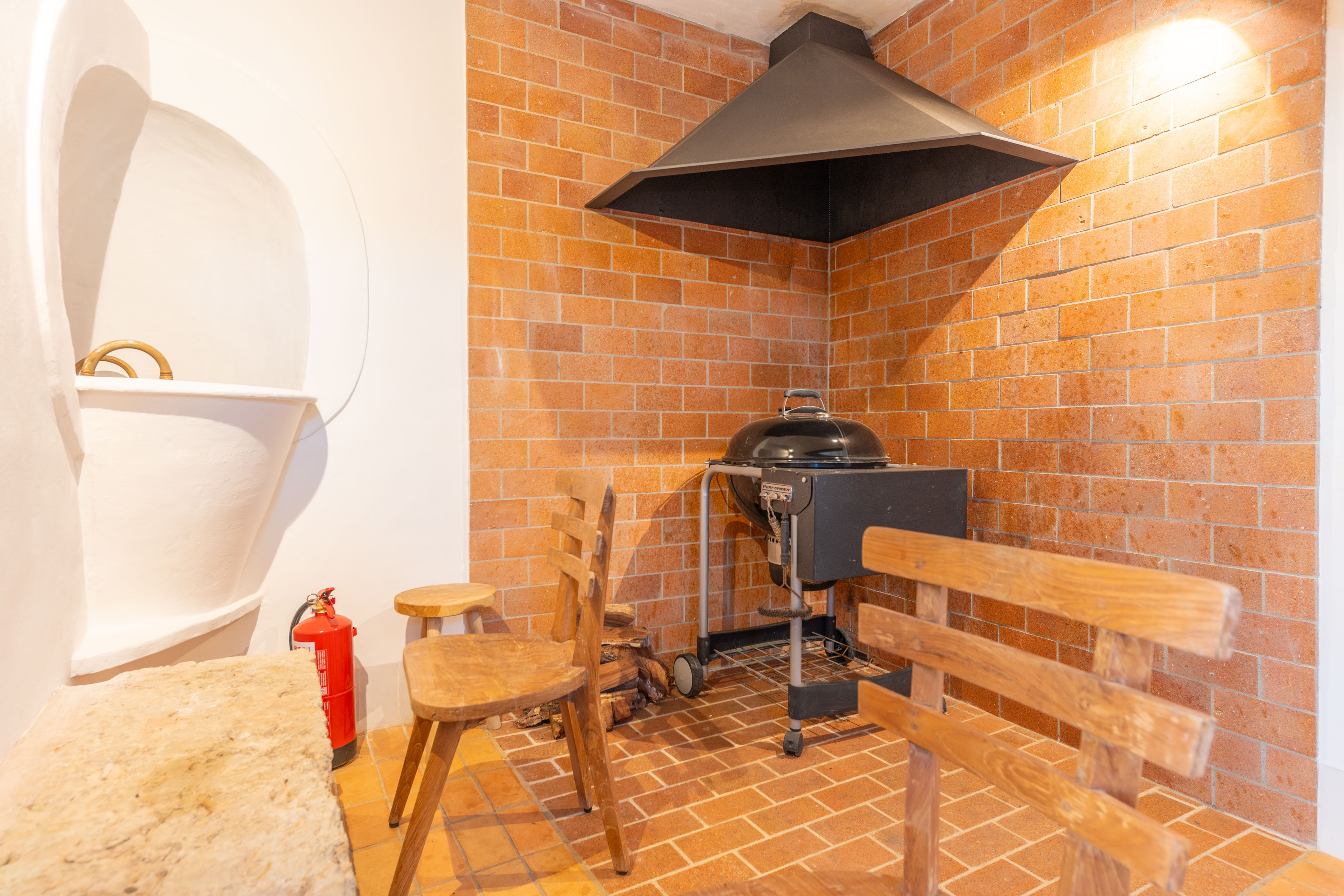 Het hoofdgebouw is verdeeld over twee verdiepingen. Op de begane grond vindt u een woonkamer-eetkamer met airconditioning, een Smart TV en een open haard voor gezellige avonden. Een grote eettafel is ideaal voor maaltijden met familie en vrienden. De onafhankelijke gaskookplaat is volledig uitgerust voor comfortabel koken en omvat ook een wasmachine en een droger. Er is ook een gastentoilet op deze verdieping.