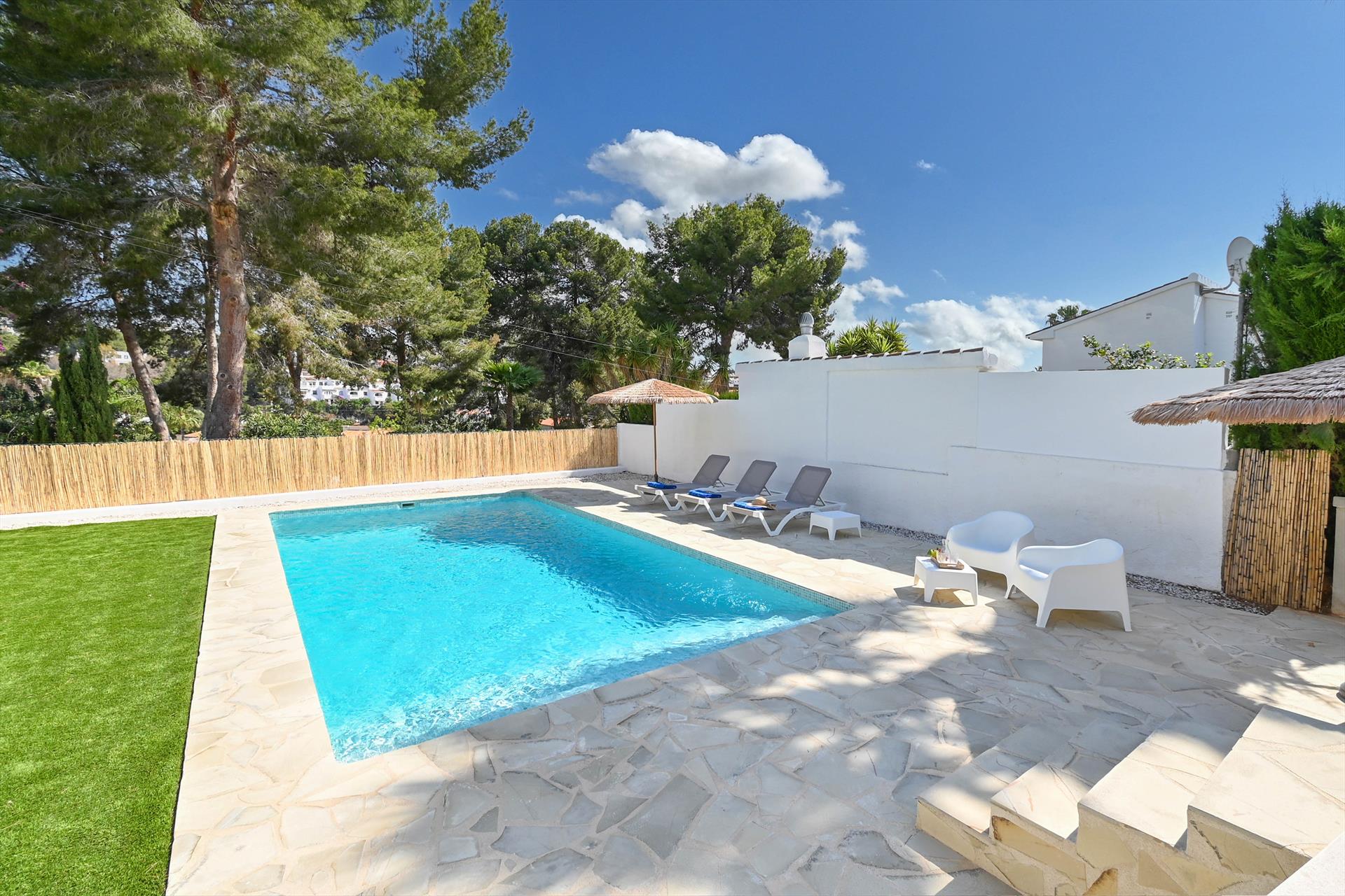 Prachtige en klassieke villa met privé zwembad in Moraira, Costa Blanca, Spanje, voor 4 personen. Het huis ligt in een kust- en woonwijk, dicht bij winkels, 1 km van het strand Playa de les Platgetes en 1 km van de Middellandse Zee.