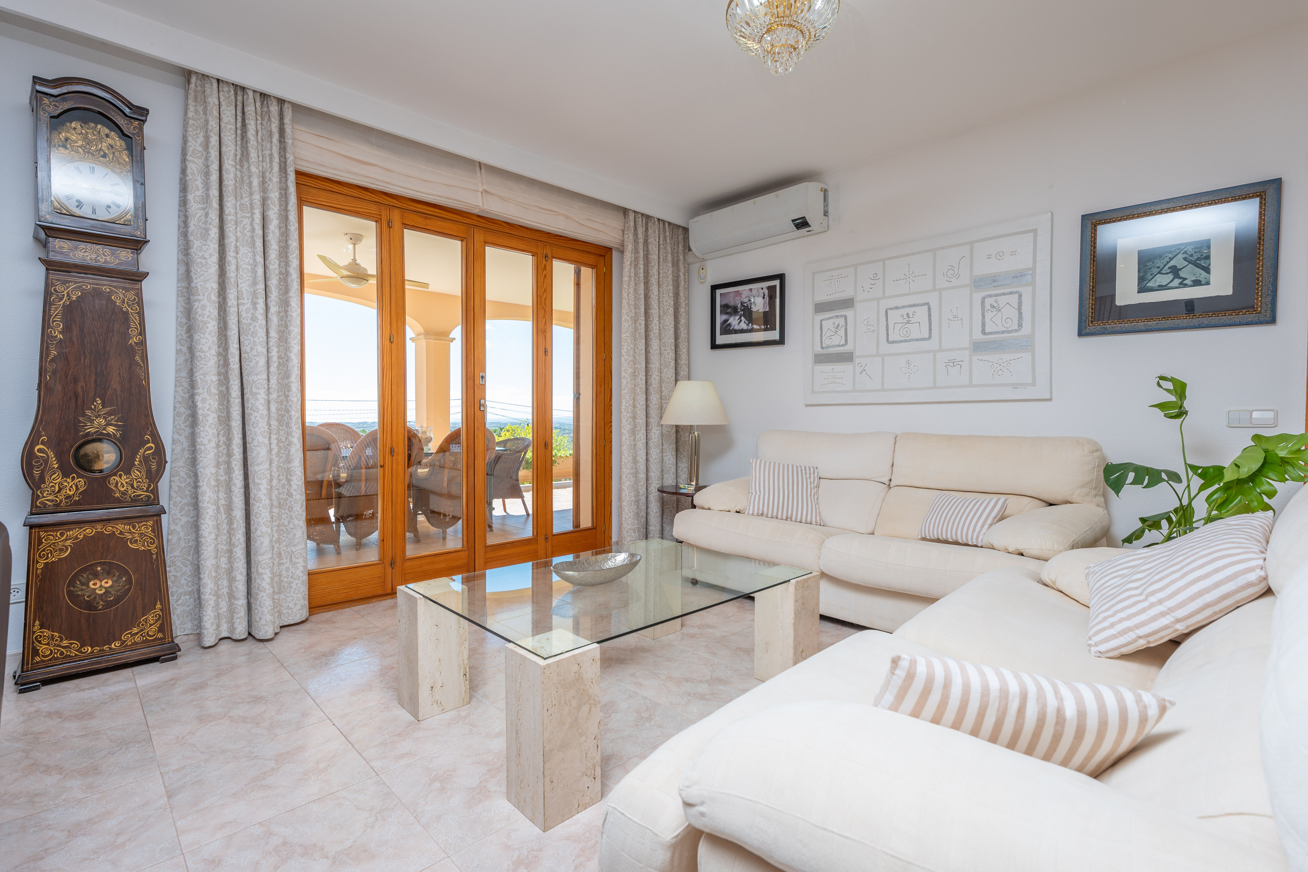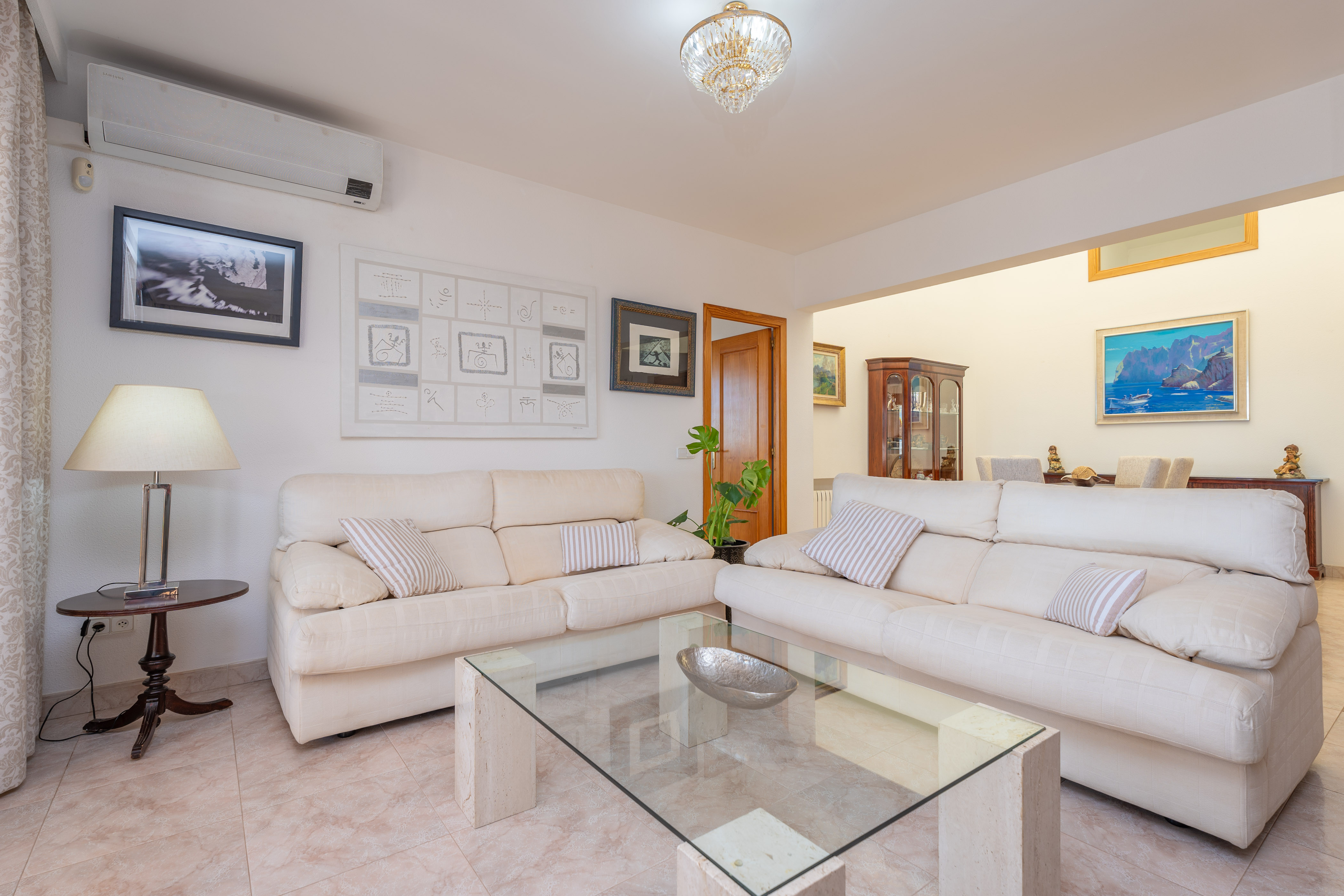 Bij binnenkomst in het uitgestrekte gelijkvloerse interieur van het pand, vindt u een comfortabele woonkamer met airconditioning. Het beschikt over twee banken voor de Smart TV, met twee extra banken in hetzelfde gebied, waardoor u en uw gasten voldoende ruimte hebben om samen te ontspannen. De woonkamer loopt naadloos over in de eetkamer, wat het gevoel van ruimte en natuurlijk licht overal versterkt. De volledig uitgeruste inductiekeuken is voorzien van alle benodigde keukengerei om maaltijden te bereiden tijdens uw verblijf, samen met nog een eethoek.