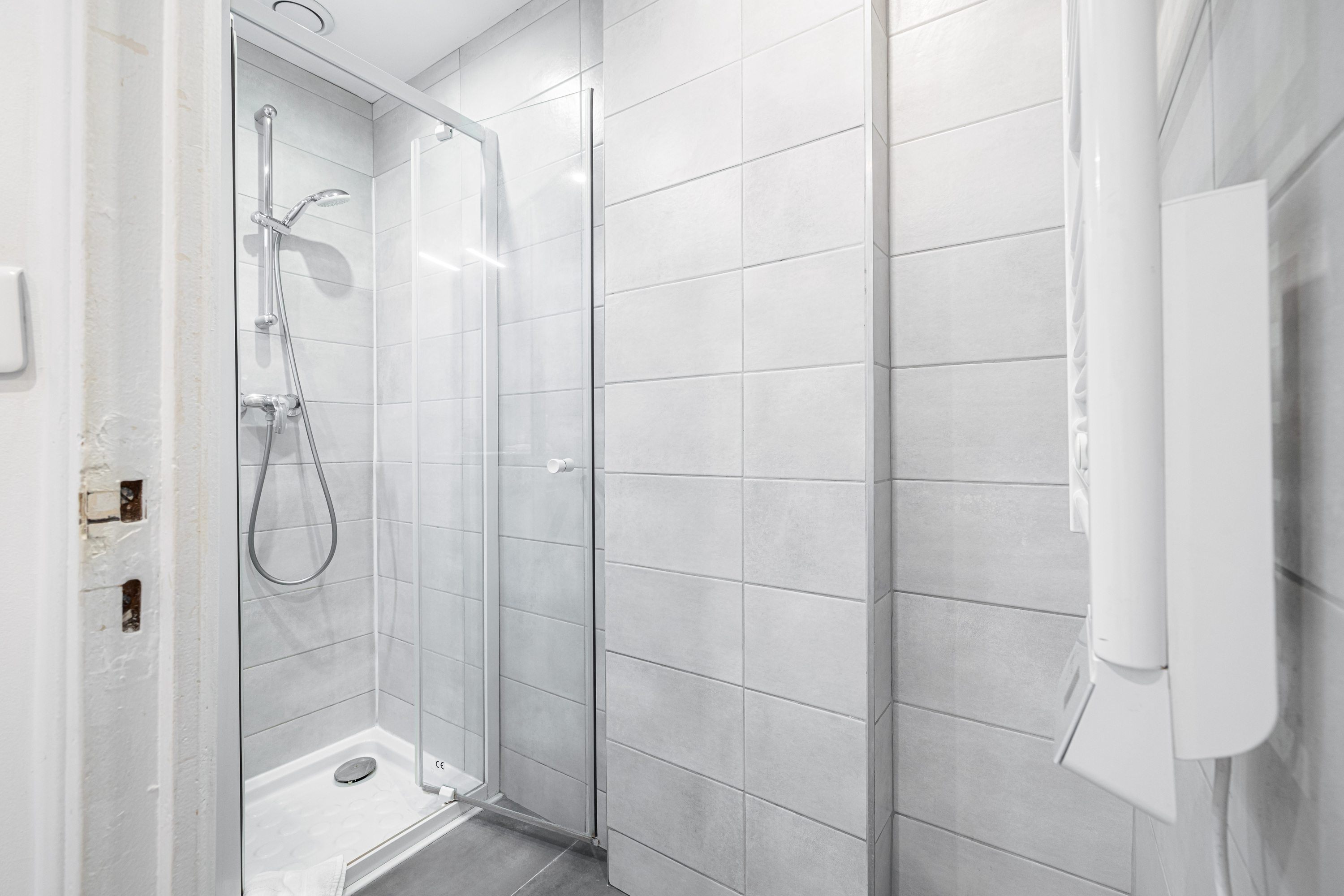 Badkamer 1: Een moderne, recent gerenoveerde badkamer met een regendouche. Het aparte toilet bevindt zich in de inkomhal.