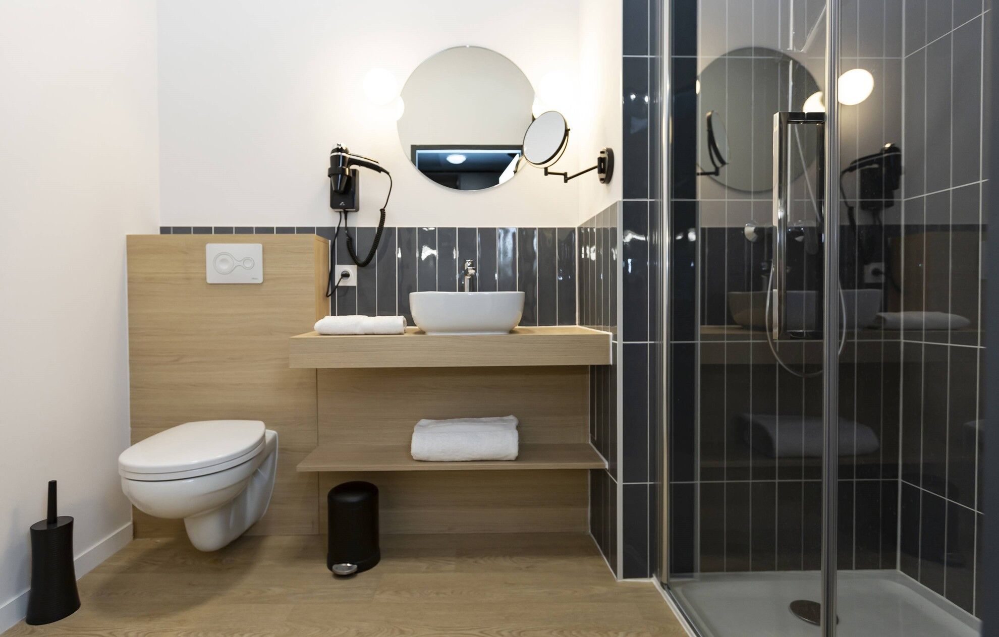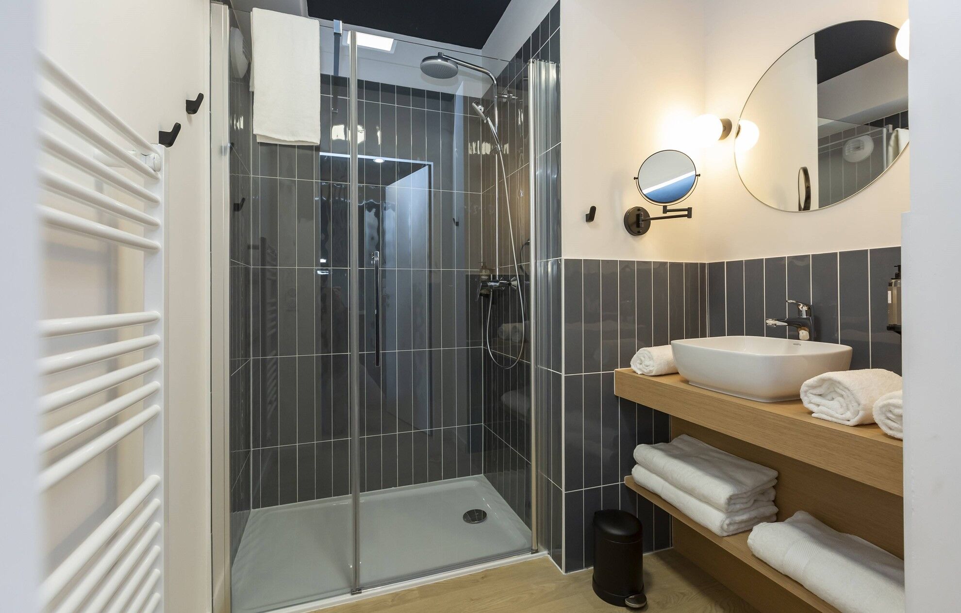 Een moderne badkamer met douche, handdoekradiator en föhn