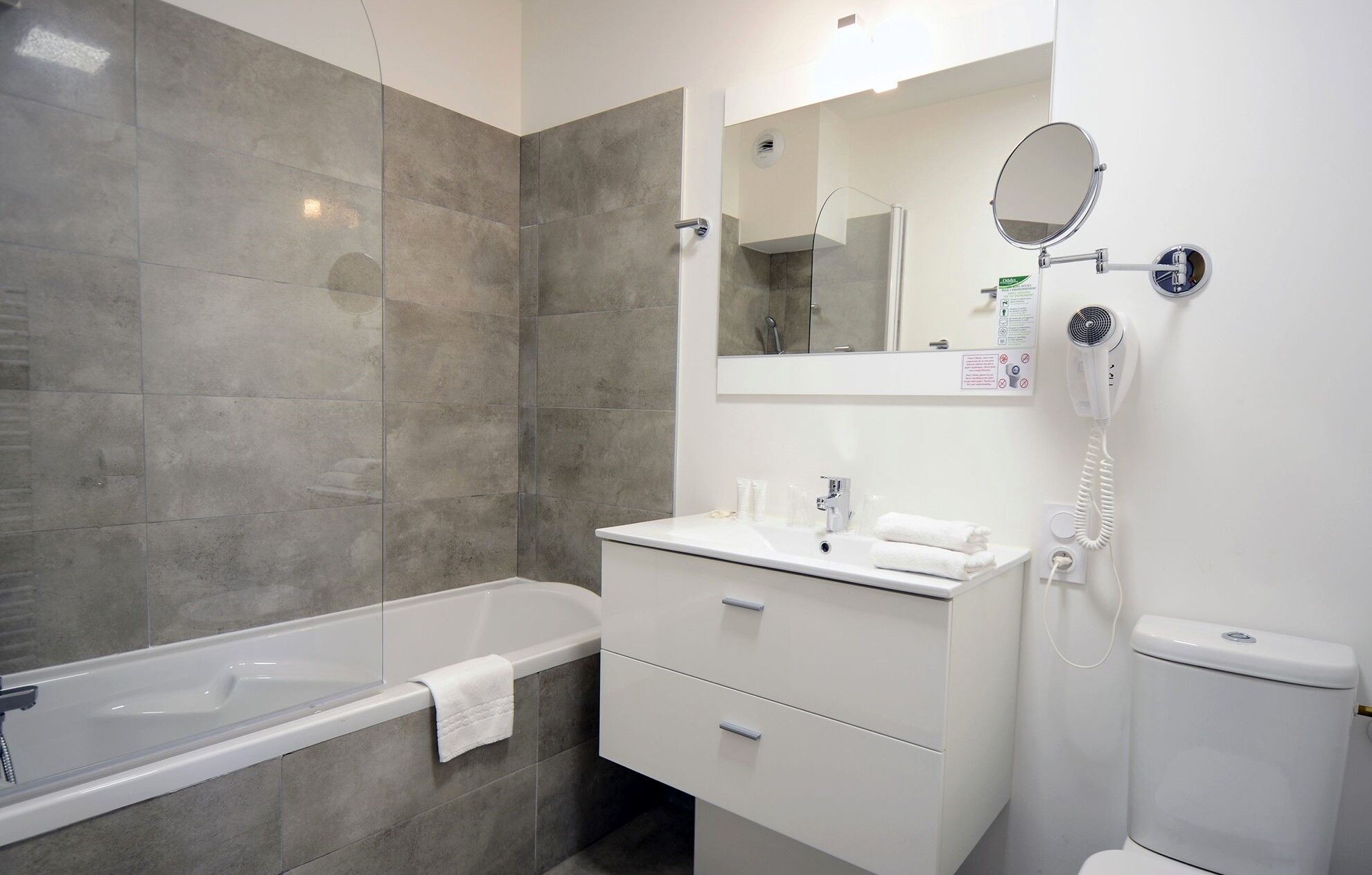 De badkamer is uitgerust met een badkuip of douche en een haardroger.