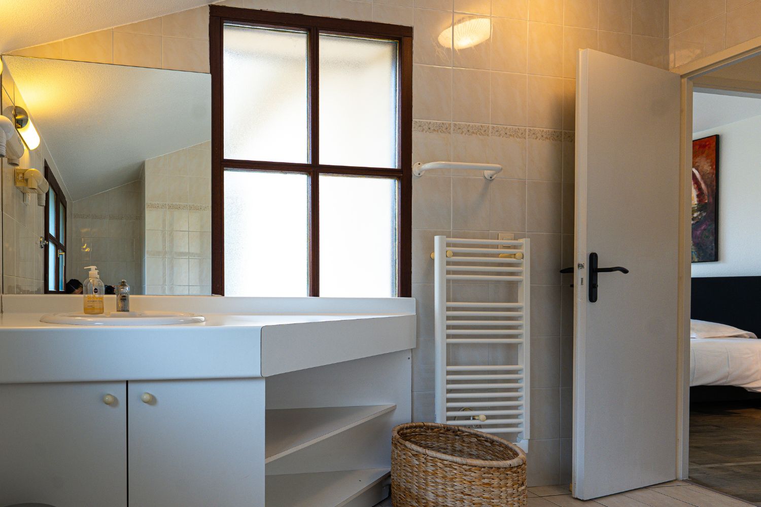 Boven zijn er twee slaapkamers, één met een tweepersoonsbed en de andere met twee eenpersoonsbedden. Eén van de slaapkamers heeft toegang tot een privébalkon. De badkamer boven heeft een bad, douche en toilet. Op de begane grond vindt u een apart toilet.