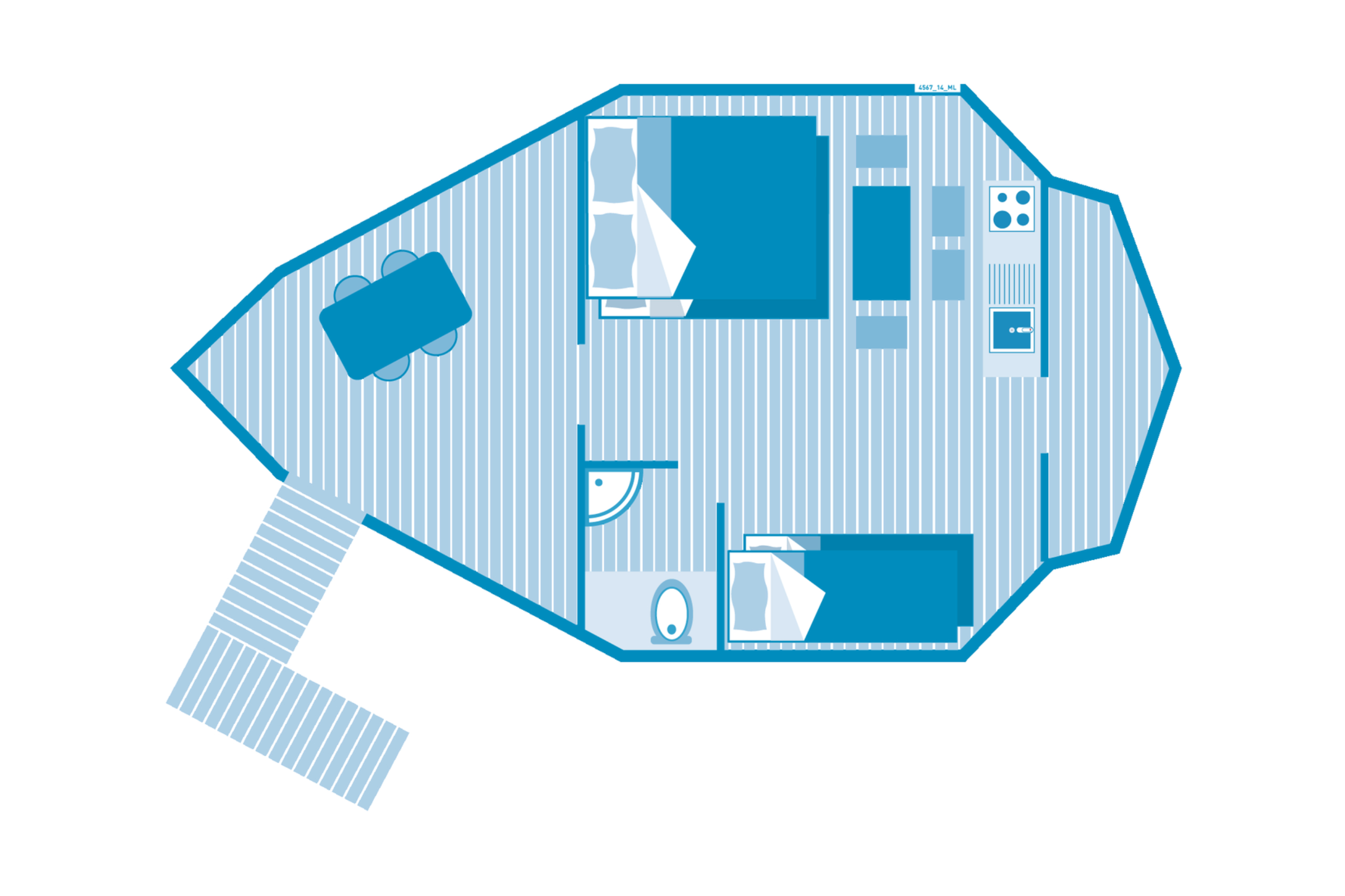 De woonkamer beschikt over een tweepersoonsbed (160 x 200 cm), een uittrekbed (80 x 190 cm) en twee stapelbedden (80 x 190 cm), evenals bankjes, een tafel en stoelen. De keuken is uitgerust met servies, keukenbenodigdheden, een waterkoker, een elektrisch koffiezetapparaat, een gootsteen, vier gaspitten en een tafelmodelkoelkast. De badkamer heeft een douche, wastafel en toilet.