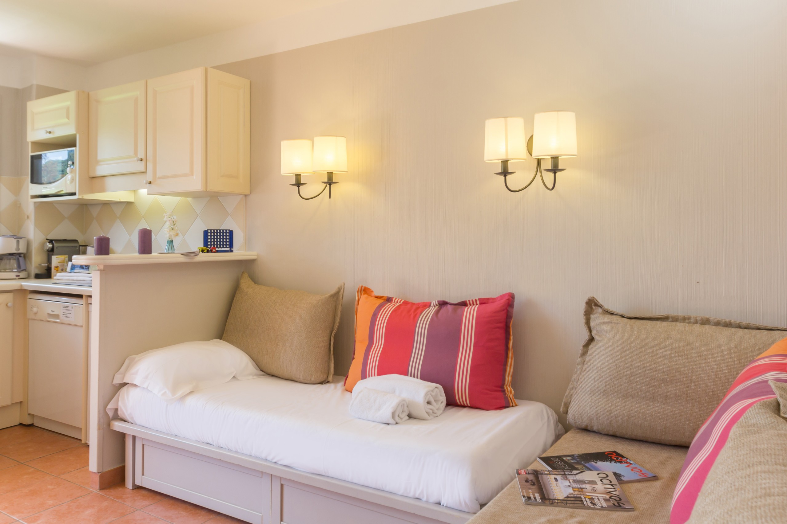 Deze prachtige residentie bestaat uit kleine gebouwen met kleurrijke luiken en Zuid-Franse architectuur, waardoor je meteen wordt ondergedompeld in een wereld van ontspanning. Hier merkt u niet dat de tijd verstrijkt, omdat het zo aangenaam is om door het park van 5 hectare te dwalen, beplant met mediterrane bomen en bloemen. U vindt er een coconachtig appartement, met zorg ingericht en in zachte tinten die een rustige, warme sfeer aan uw interieur geven.