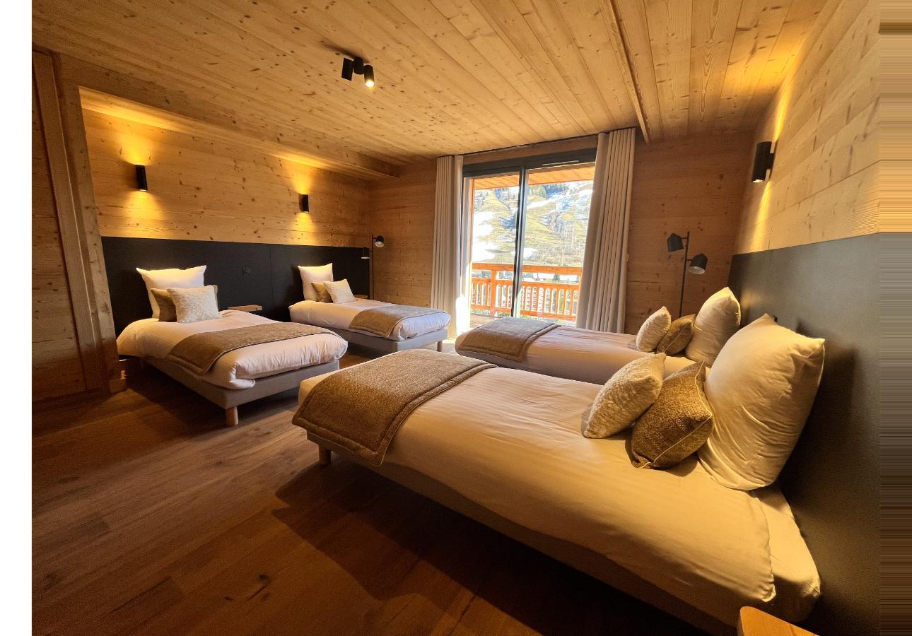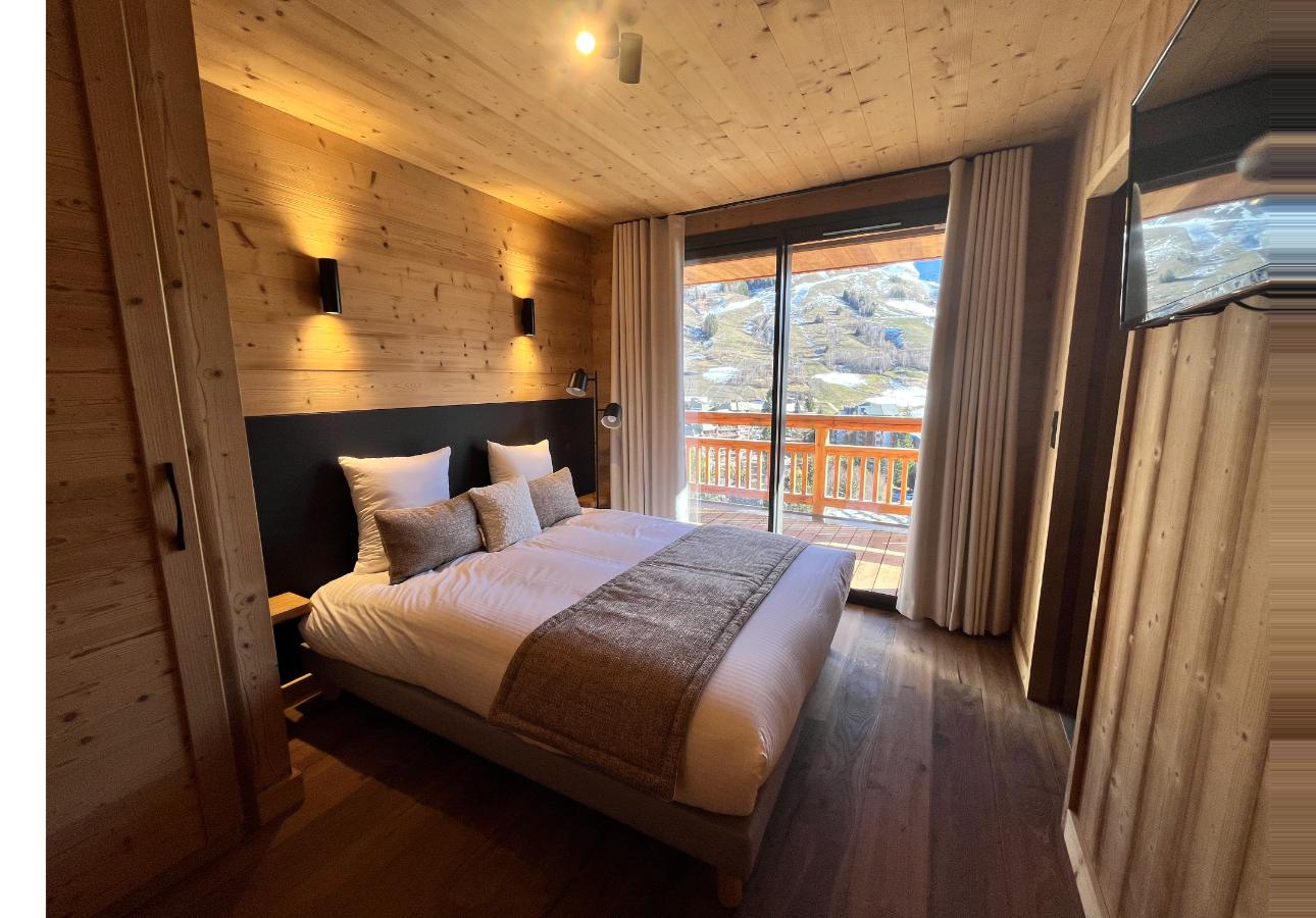 Ervaar het comfort en de charme van Chalet L'Ours Polaire, gelegen in het hart van de Alpen. Dit ruime chalet van 240 m² biedt plaats aan maximaal 14 personen, met zes ruime slaapkamers, perfect voor gezinnen of groepen vrienden. Elke kamer is uitgerust met een tv en een eigen badkamer met douche en toilet. De gezellige woonkamer, met open haard, opent naar een panoramisch terras waar je kunt ontspannen in de jacuzzi. De volledig uitgeruste keuken zorgt ervoor dat je alles hebt wat je nodig hebt voor een onvergetelijk verblijf.