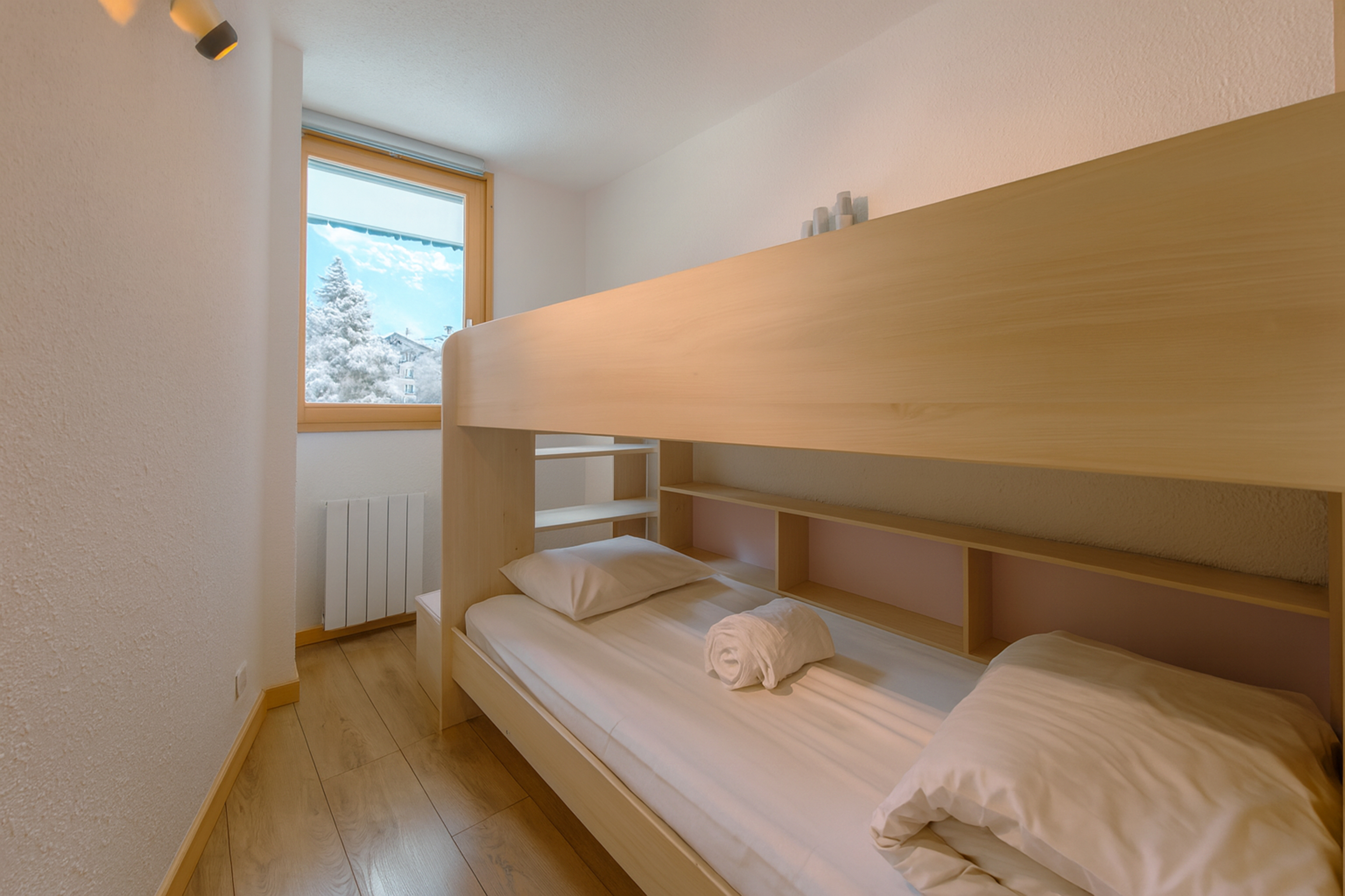 Slaapkamer 1: Een lichte en luchtige kindvriendelijke kamer, ingericht met een stapelbed en een kast.