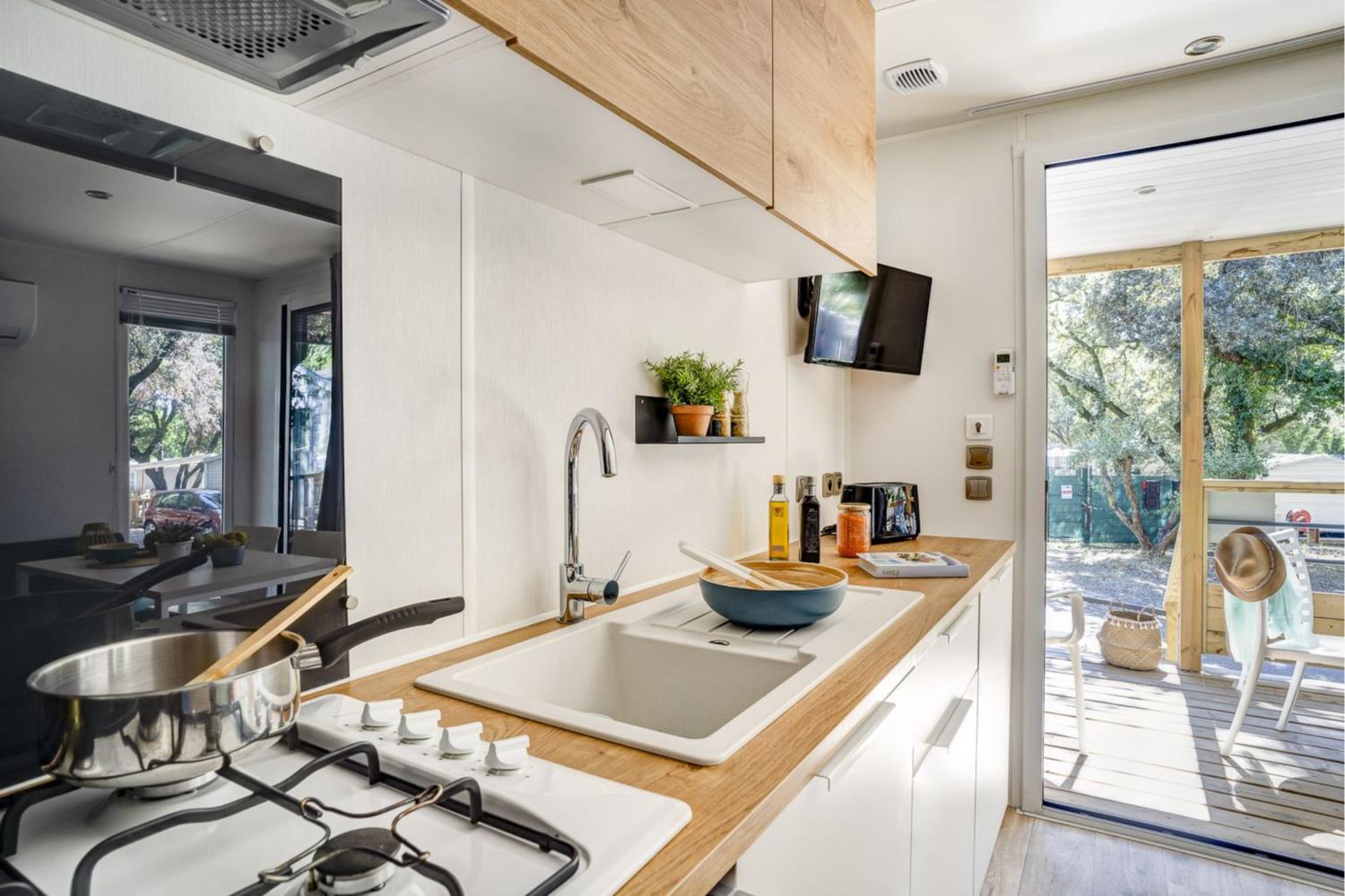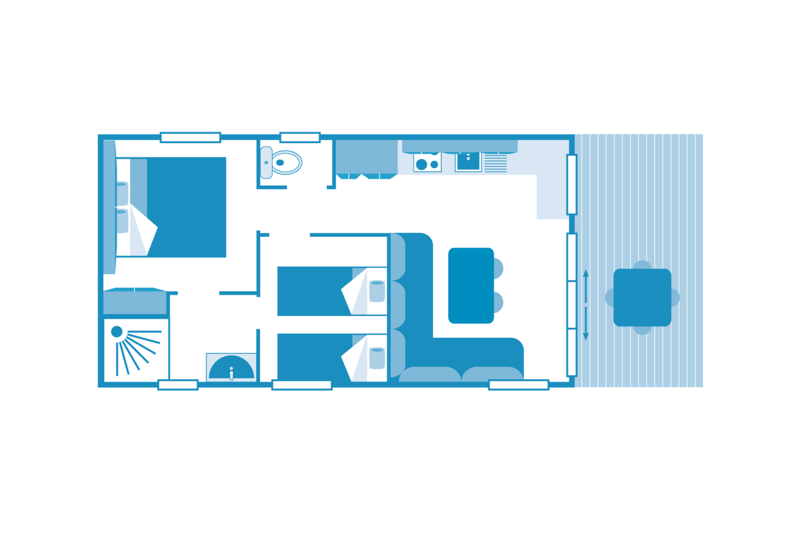 Stap binnen in een lichte, moderne accommodatie die is ontworpen met uw comfort en ontspanning in gedachten. De woonruimte met airconditioning beschikt over een gezellige zitbank, een eettafel met stoelen, een televisie en verwarming, waardoor het de perfecte plek is om tot rust te komen na een dag vol ontdekkingen.