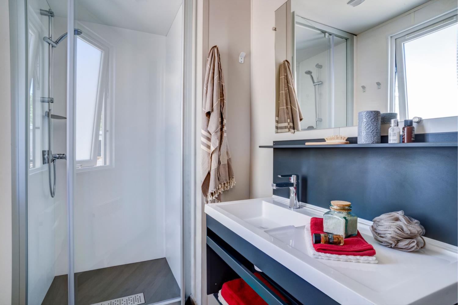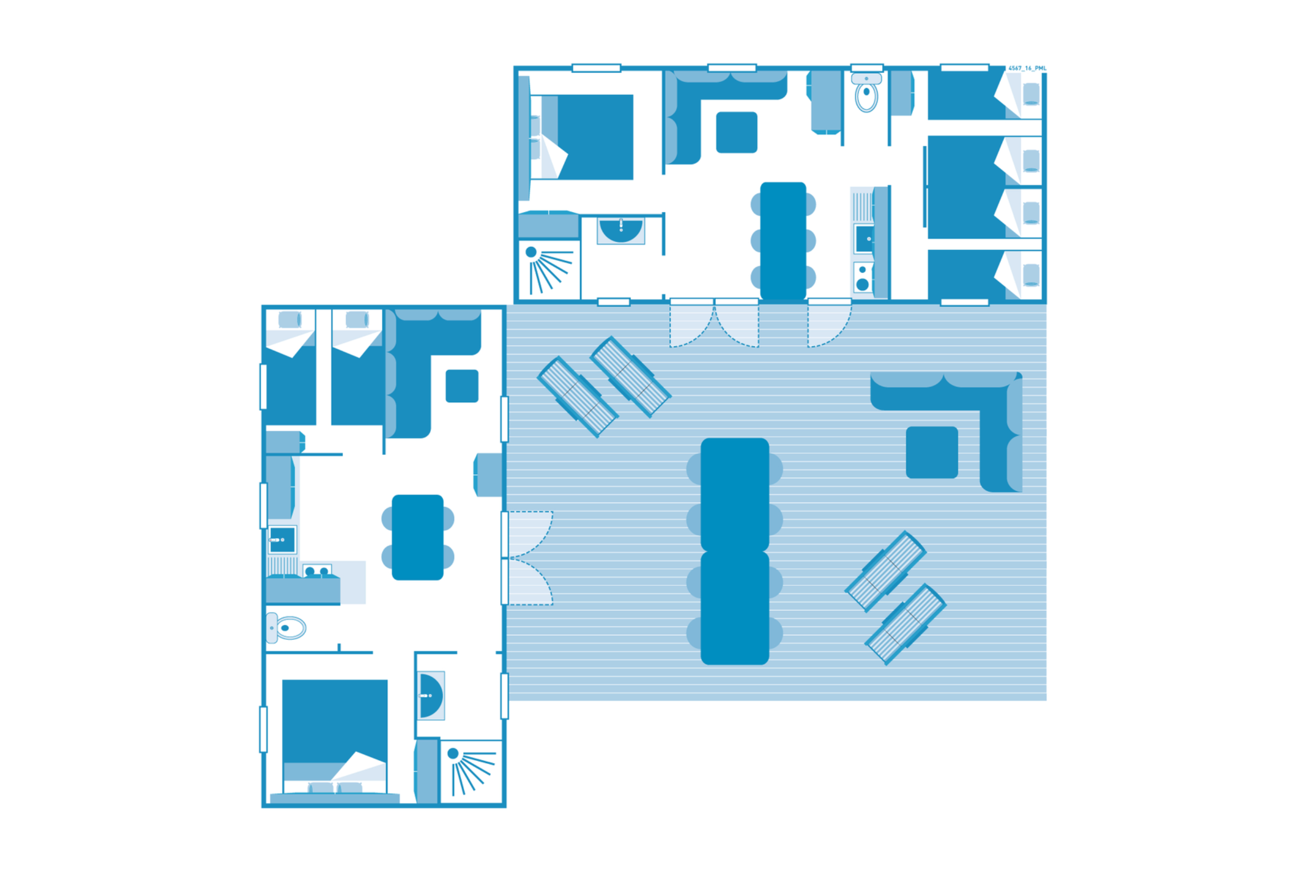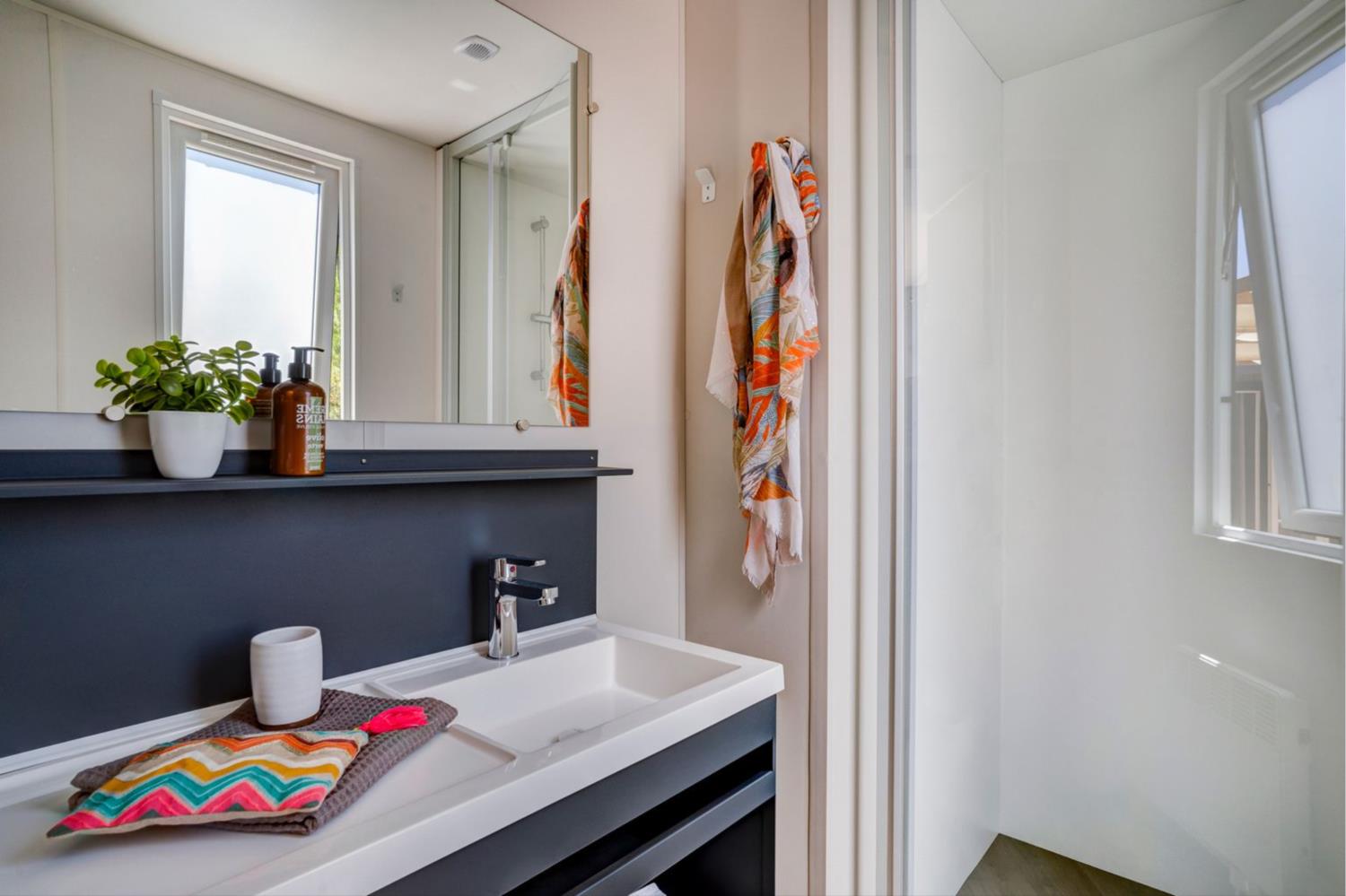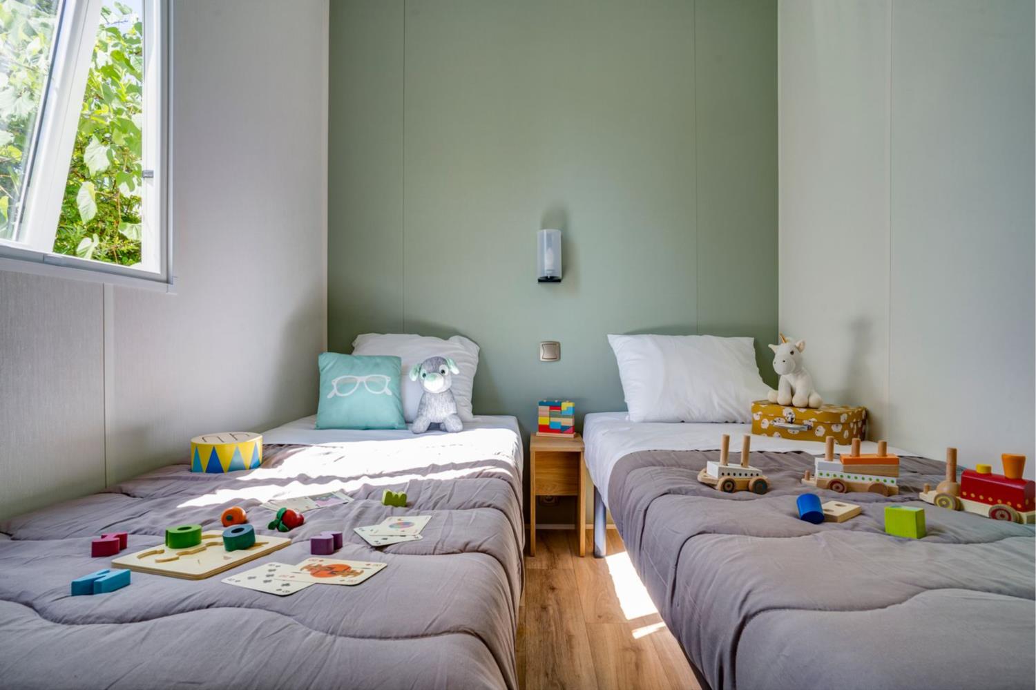 Deze module beschikt over twee slaapkamers: één met een tweepersoonsbed (160 × 200 cm) en kledingkast, en één met twee eenpersoonsbedden (80 × 190 cm) en kledingkast. De badkamer heeft een douche, wastafel en verwarming, aangevuld met een apart toilet.