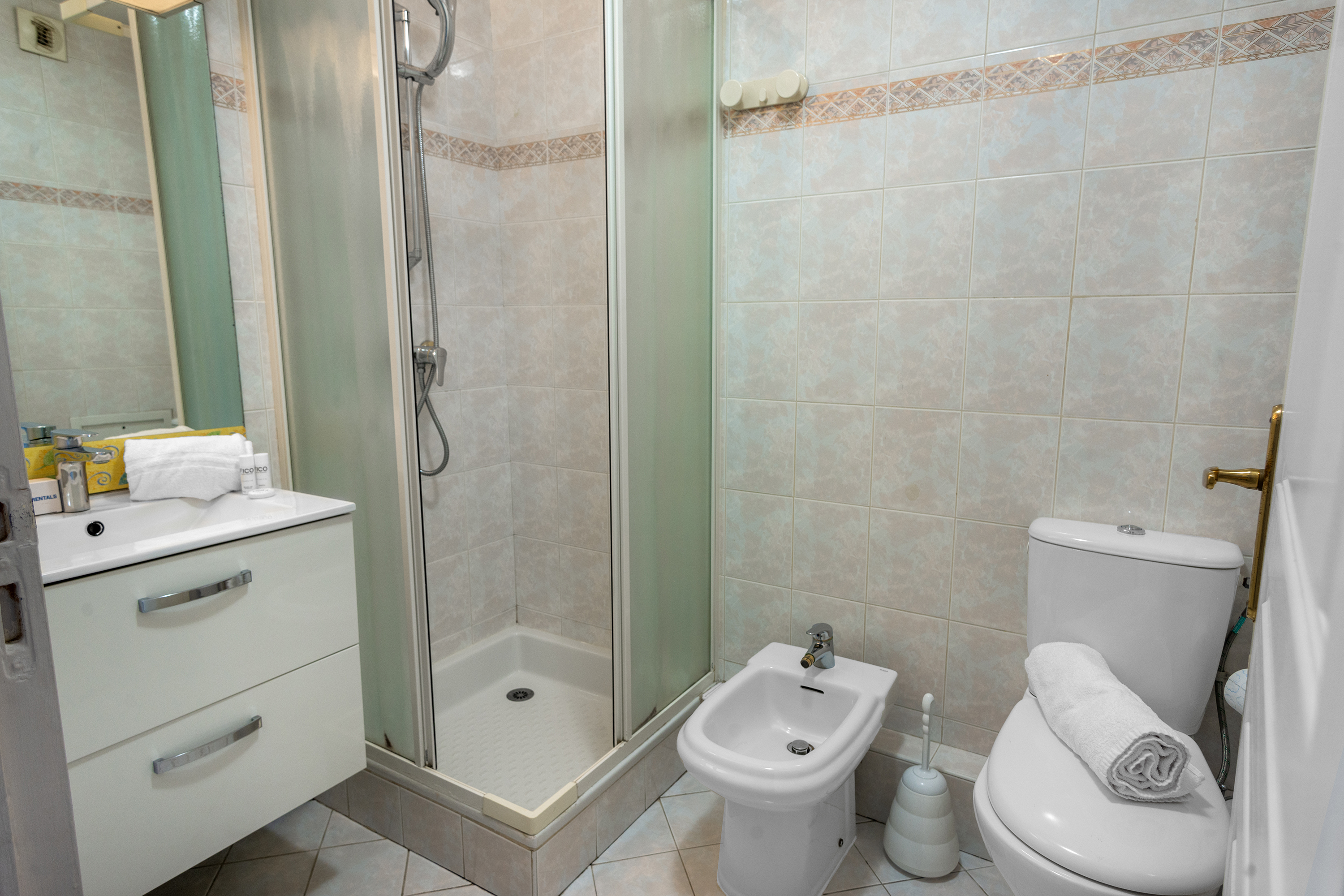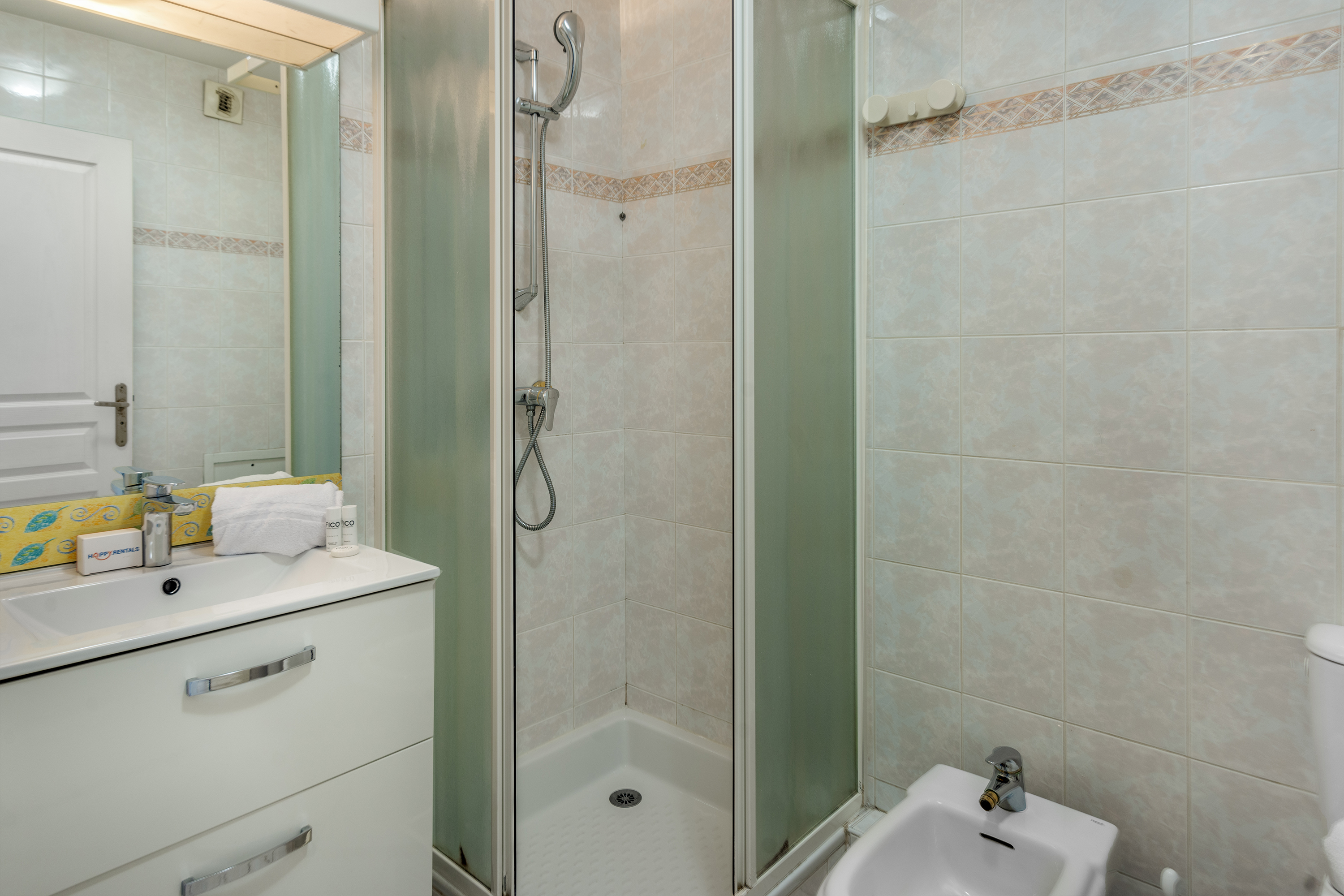 De elegante badkamer is uitgerust met een douche, wastafel, bidet en toilet