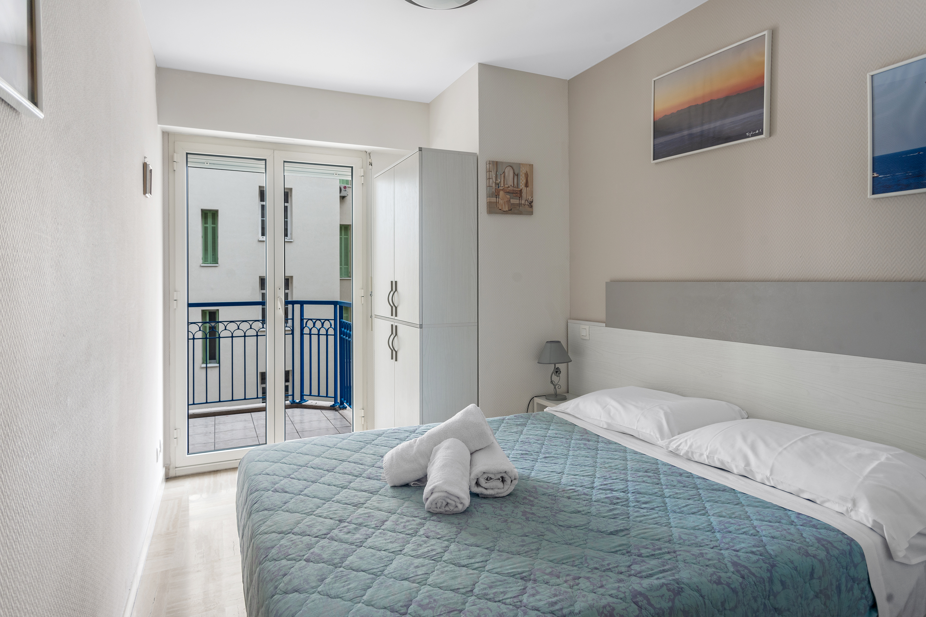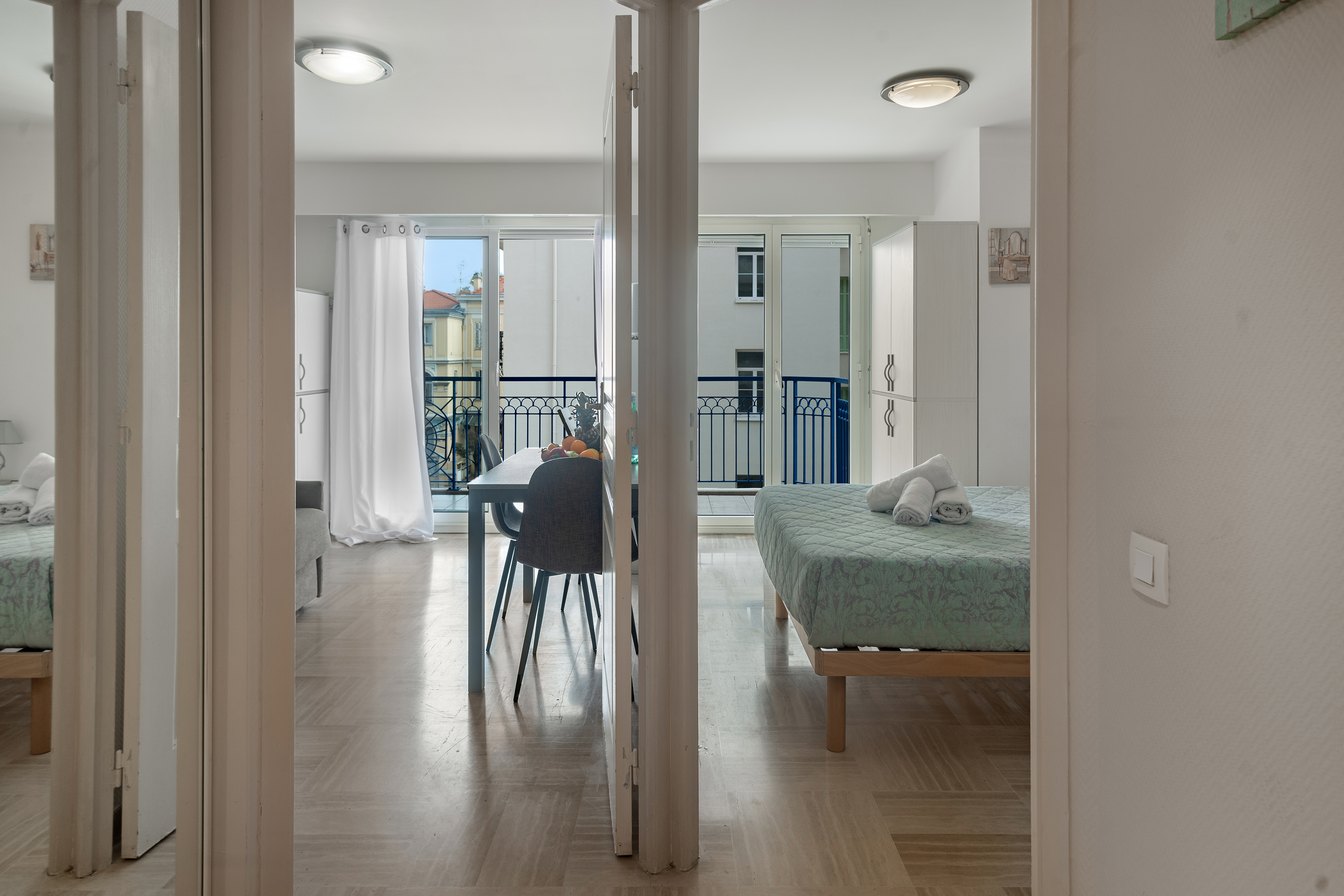 Het appartement is licht dankzij grote glazen schuifdeuren, die vanuit de woonkamer en de slaapkamer naar een prachtig balkon leiden. Het balkon is ingericht met een slimme eettafel en stoelen, zodat gasten in alle privacy kunnen zonnebaden.
