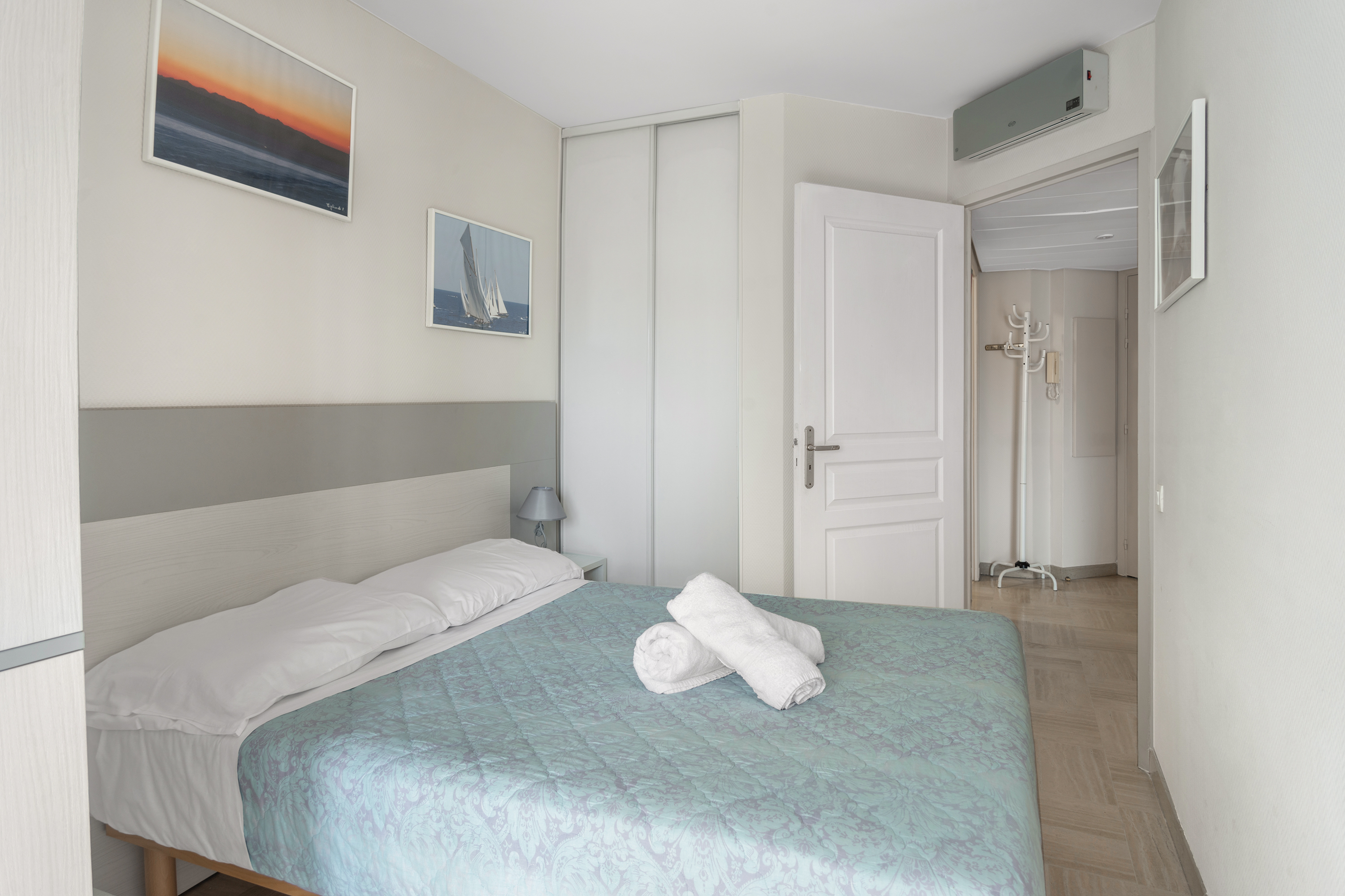 Slaapkamer: De zonnige hoofdslaapkamer, die uitkomt op het terras, heeft een tweepersoonsbed en een kledingkast.