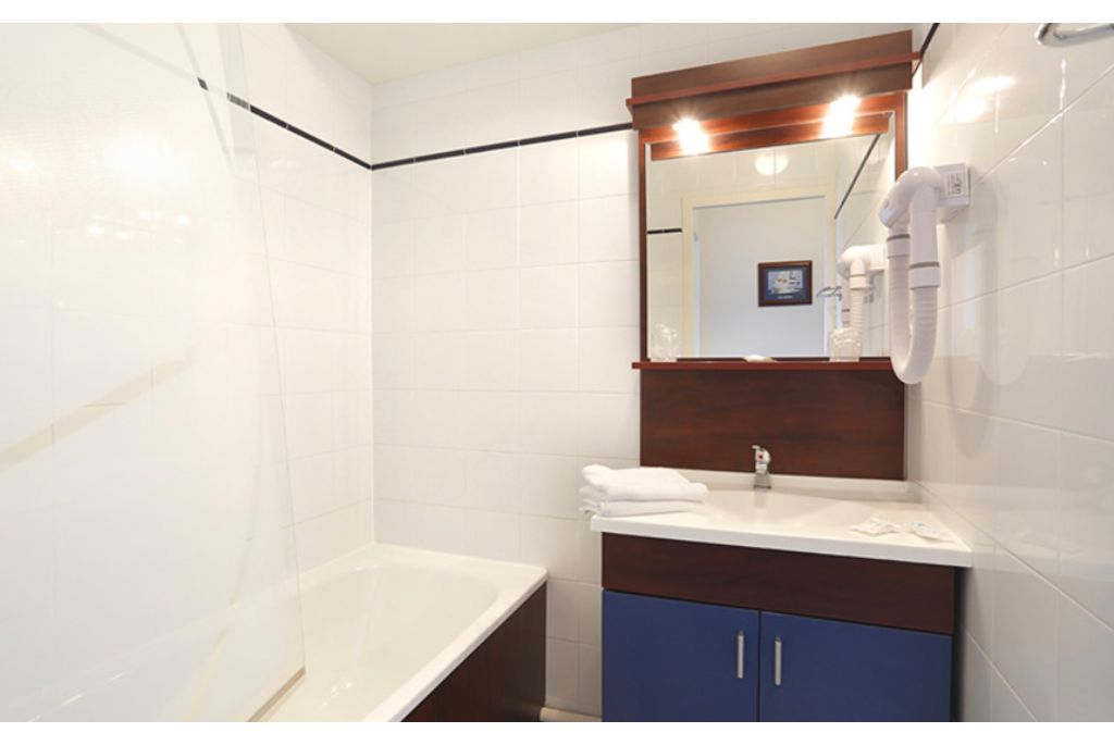 Badkamer met bad, wastafel, toilet en haardroger 9m² terras met tuinmeubilair
