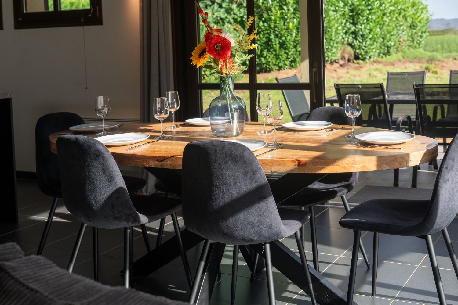 Grote glazen deuren openen naar een overdekt terras, waar u luxe tuinmeubilair en ligstoelen vindt – perfect om tot rust te komen. De royale tuin biedt een prachtige ruimte voor kinderen om te spelen.