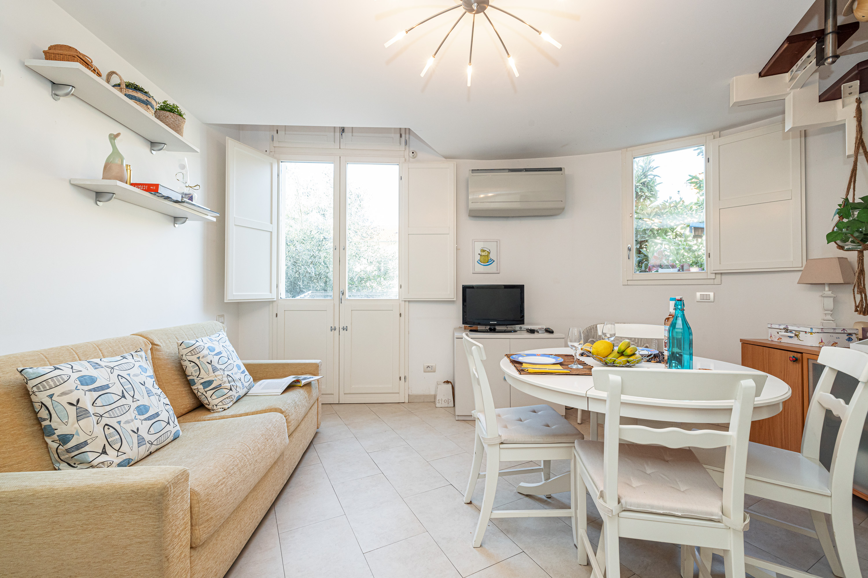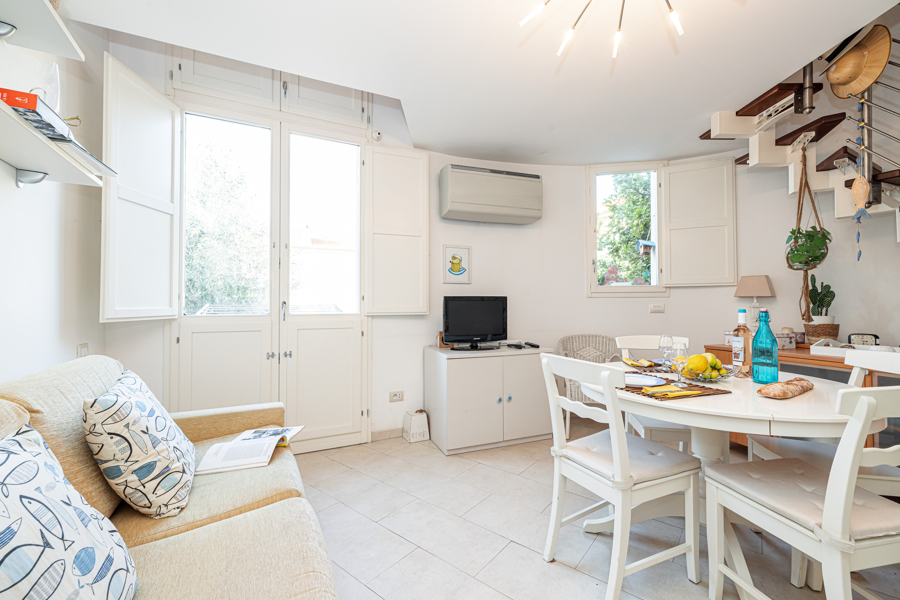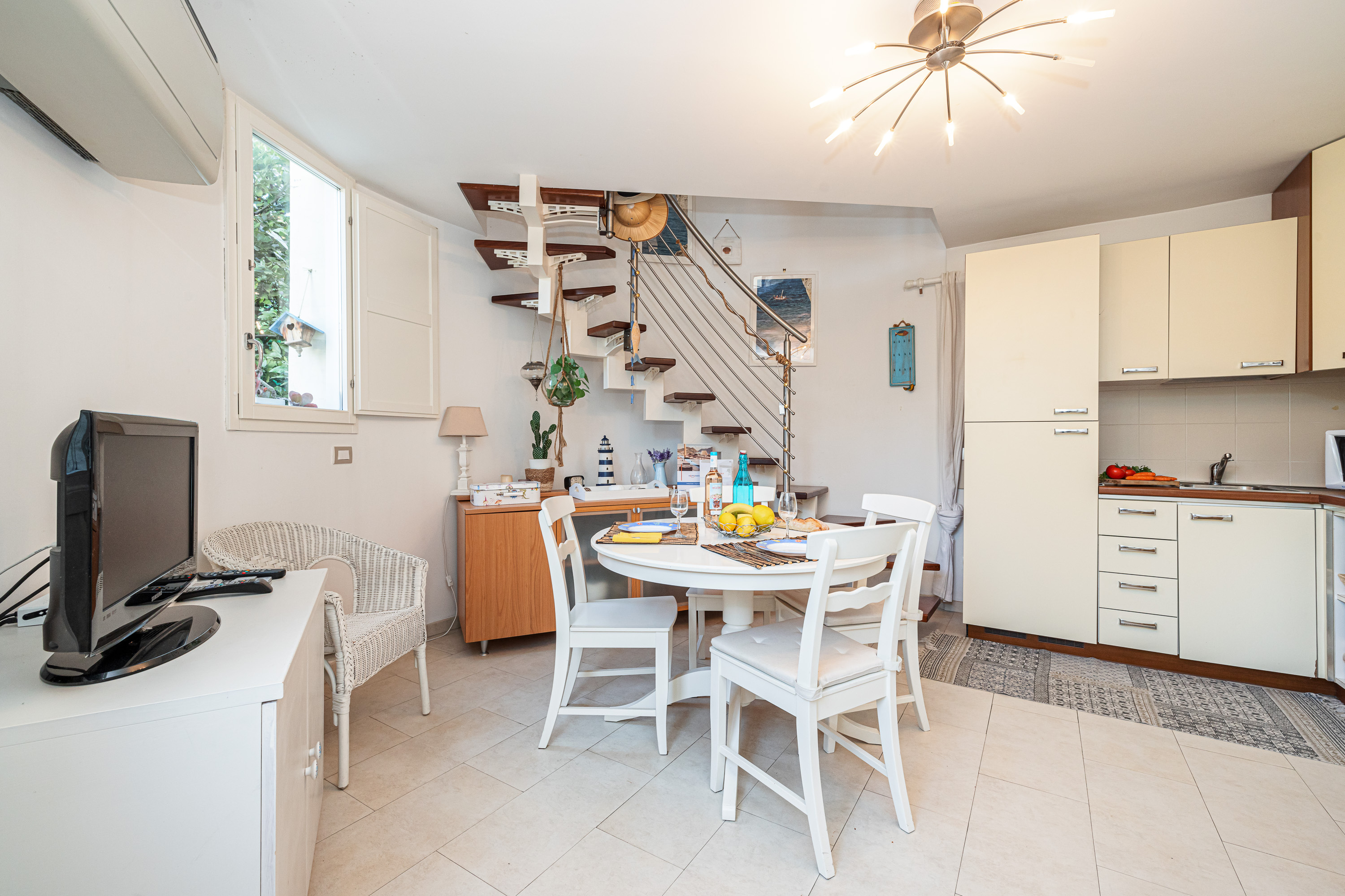40 m² ruimte verdeeld over 2 verdiepingen met een tweepersoonsslaapkamer en badkamer op de 1ste verdieping, woonkamer en keuken op de begane grond met een slaapbank.
