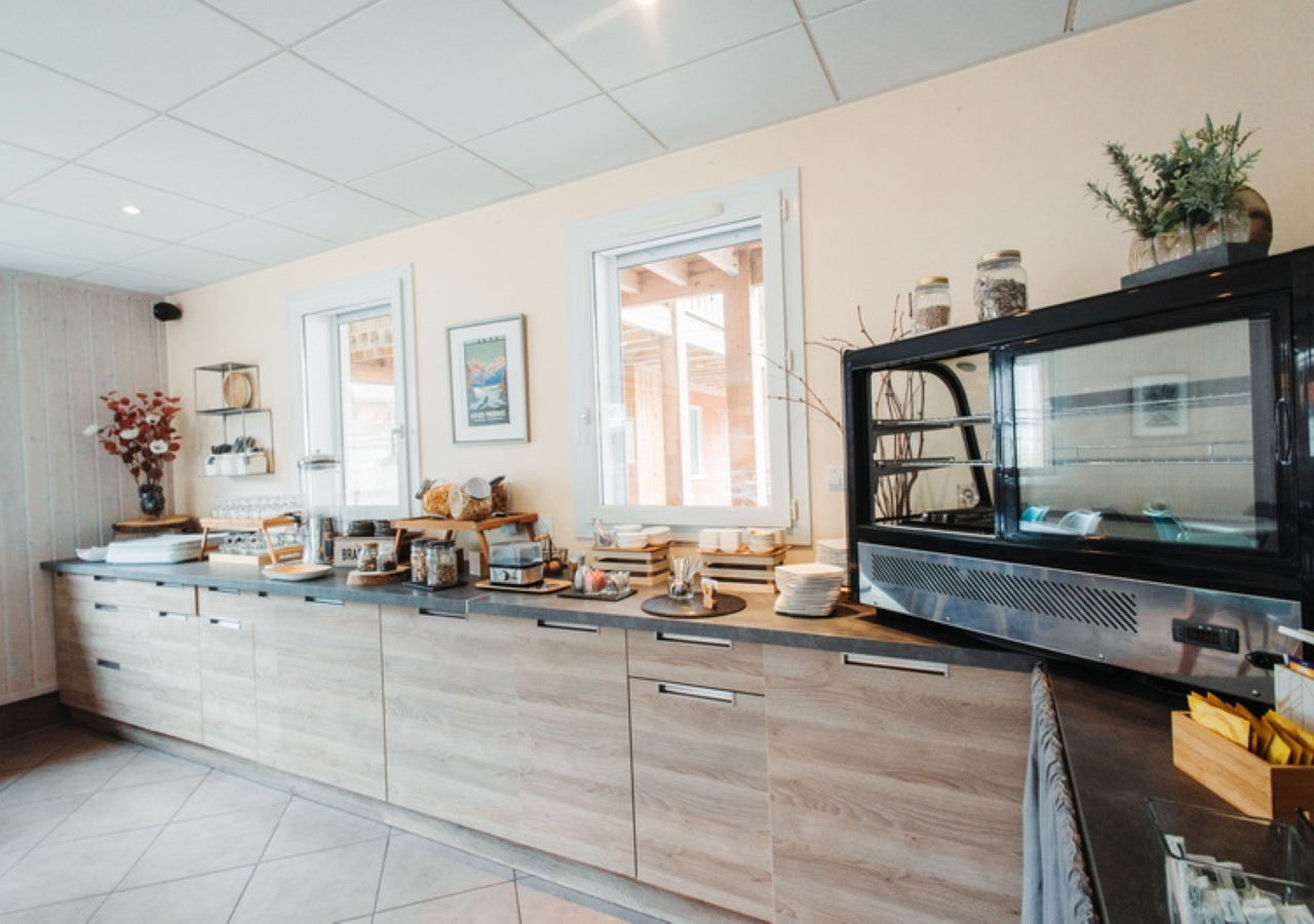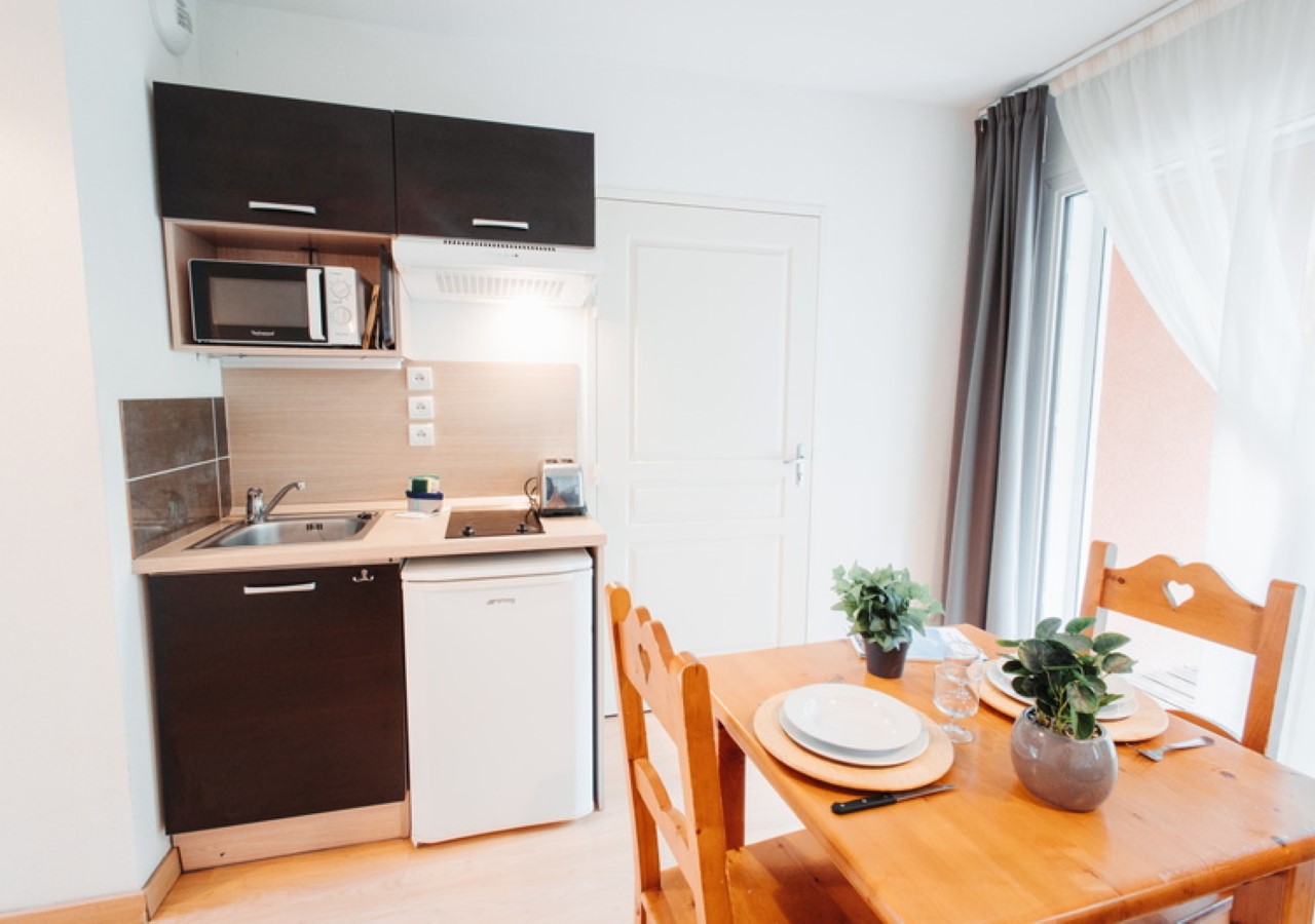 Kitchenette met kleine koelkast, elektrische kookplaten, magnetron en filterkoffiezetapparaat