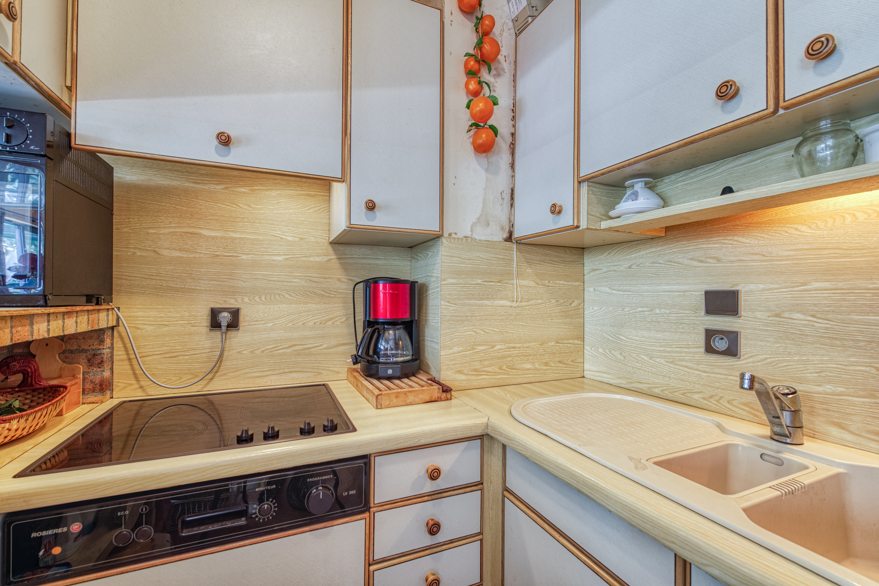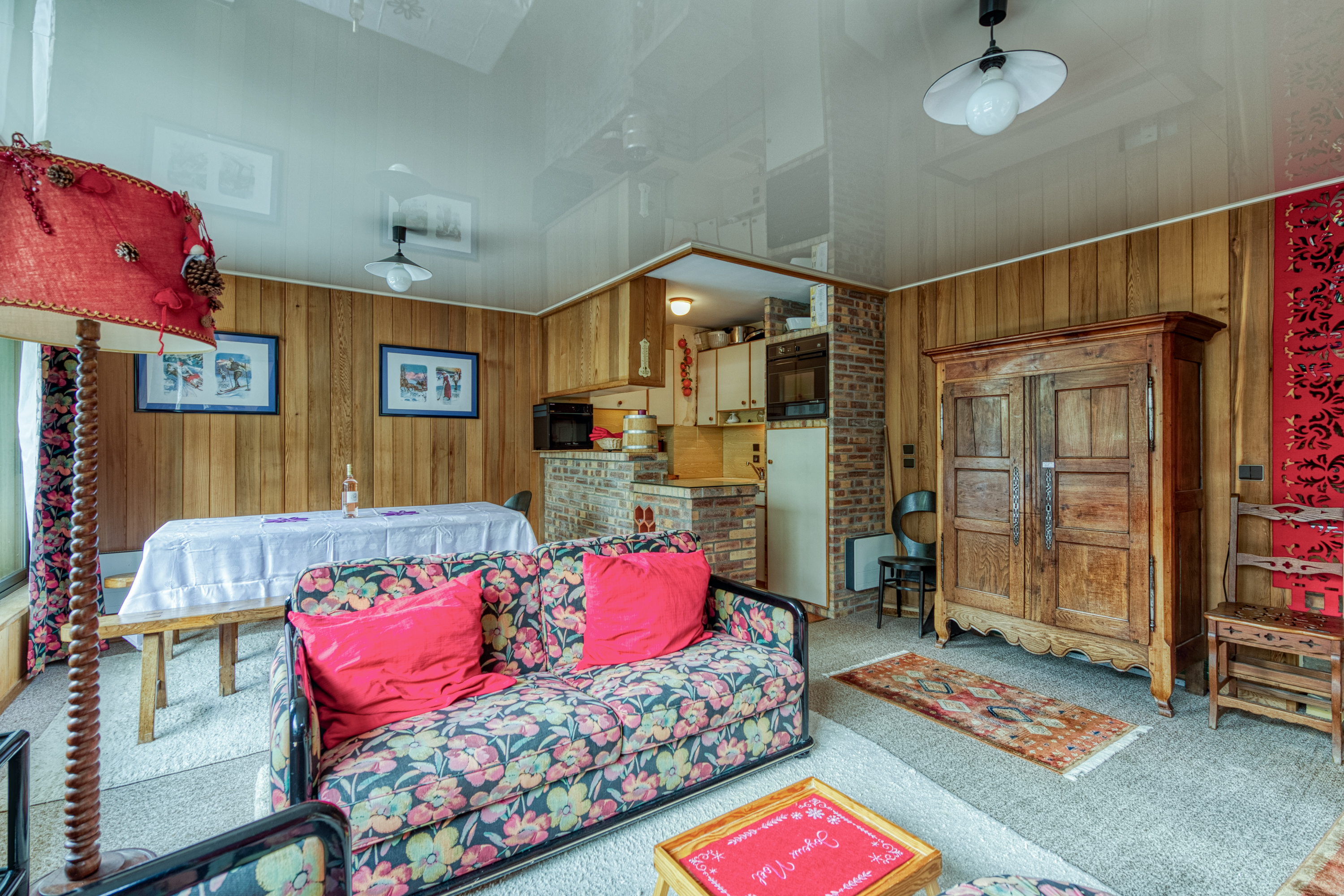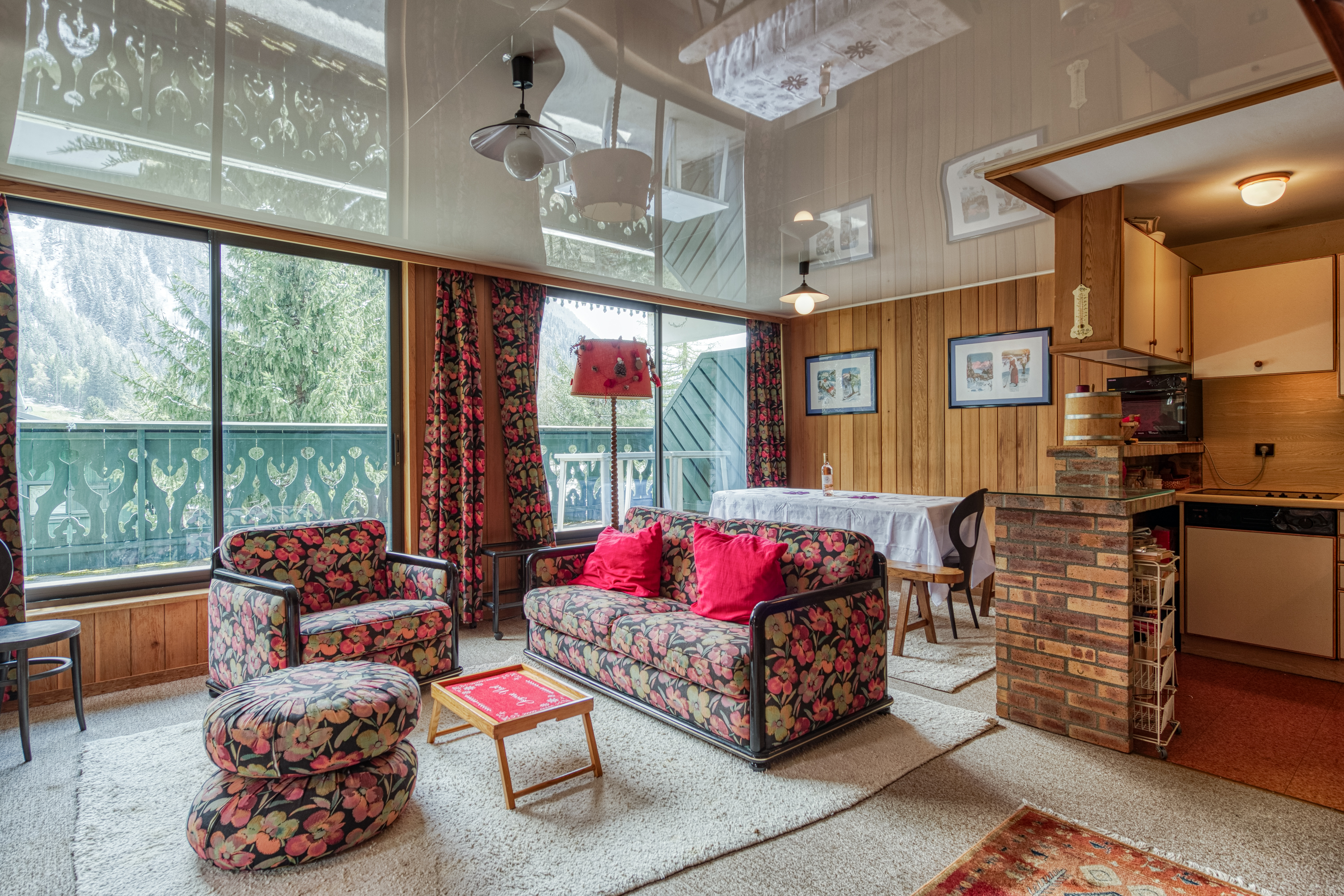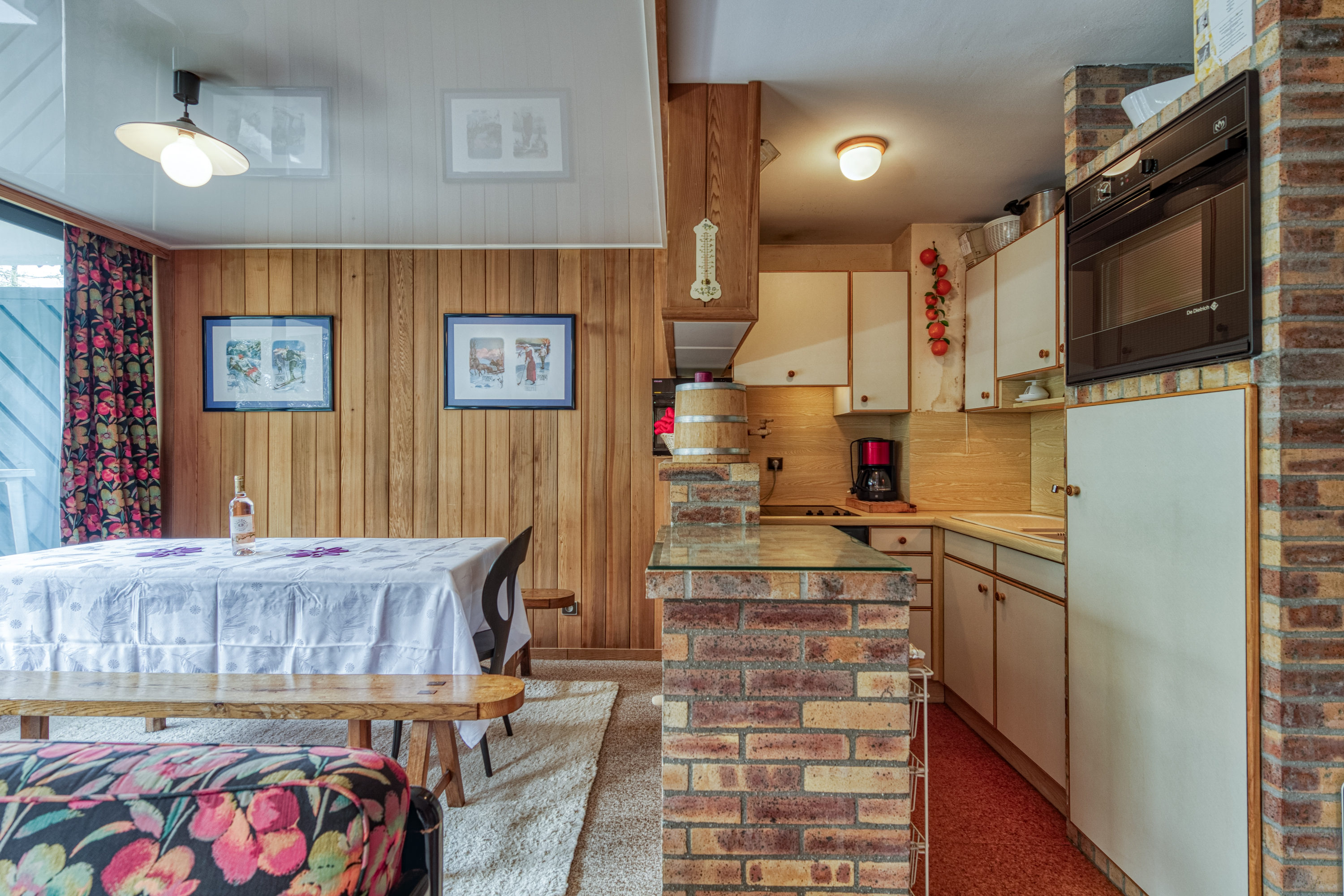 Het appartement is vol licht dankzij de grote Franse ramen langs de lengte van de woonkamer. Deze openen naar een privébalkon met uitzicht op het bos en de bergen. Binnen is de inrichting gezellig en alpien, met houten muren en zichtbare bakstenen elementen. Er zijn 2 comfortabele banken, fauteuils en een houtkachel. De eethoek, met een tafel voor 6 personen, bevindt zich naast de open keuken, die door een bakstenen ontbijtbar van de woonkamer is gescheiden. De keuken is goed uitgerust met een kookplaat, oven, magnetron, koelkast/vriezer, broodrooster en koffiezetapparaat.