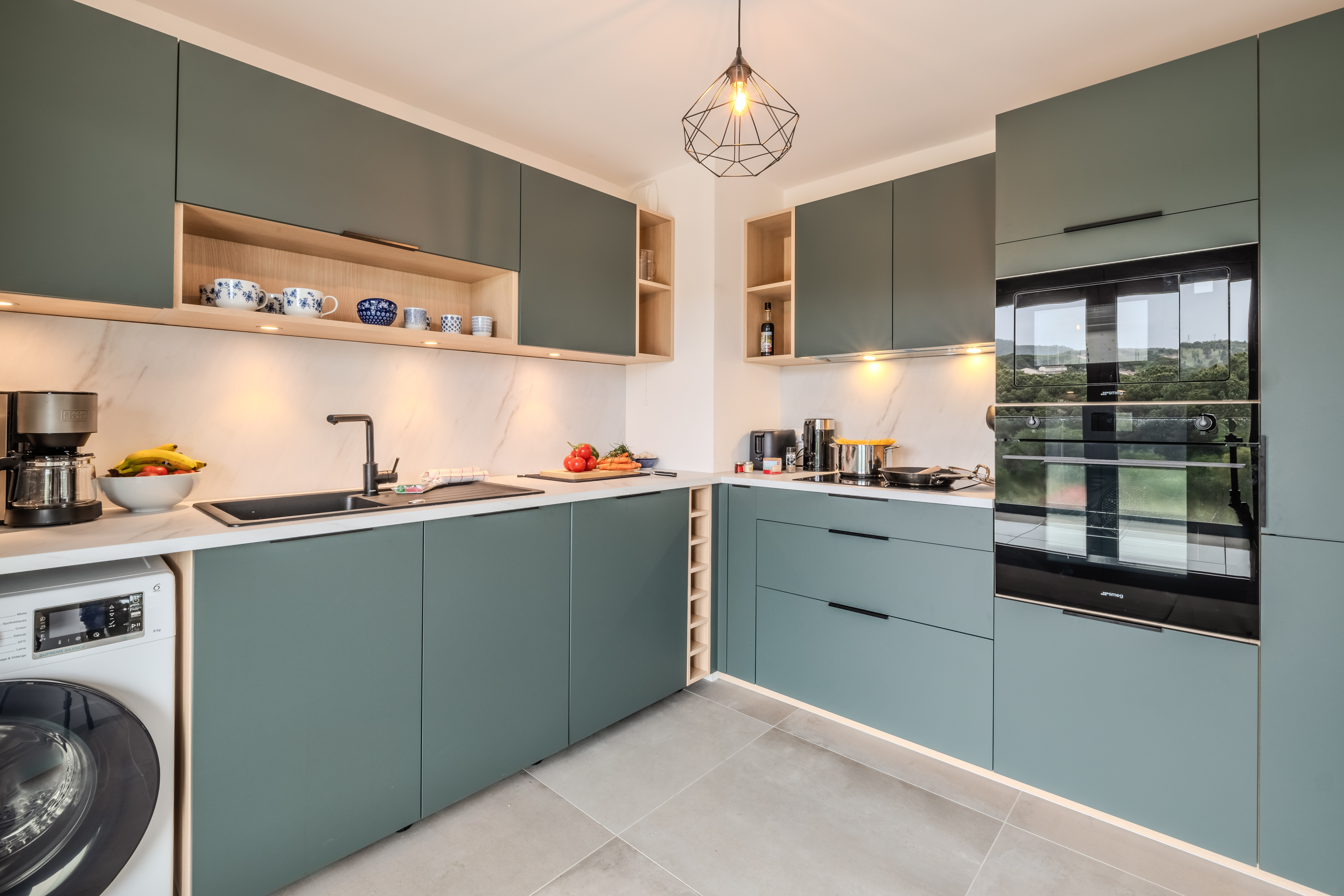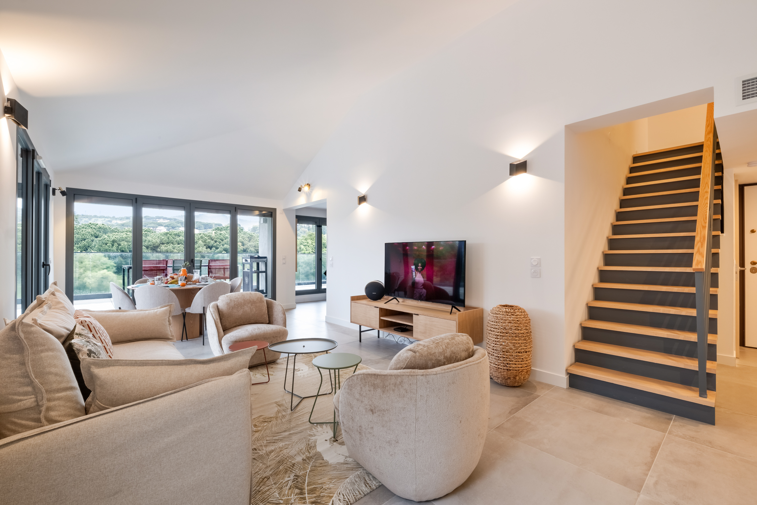 Dit moderne duplexappartement van 95 m² beschikt over lichte en ruime woonruimtes, geaccentueerd door een kathedraalplafond en grote ramen die de ruimte overspoelen met natuurlijk licht. Het appartement beschikt over een moderne, volledig uitgeruste keuken, een grote woonkamer die elegant is ingericht met een slaapbank, smart-tv en een eettafel voor zes personen. De drie slaapkamers, verdeeld over twee verdiepingen, bieden comfortabel plaats aan maximaal acht gasten. Het appartement beschikt ook over een prachtig L-vormig terras van 40 m² op het zuiden/westen, met een prachtig uitzicht op het omliggende landschap.