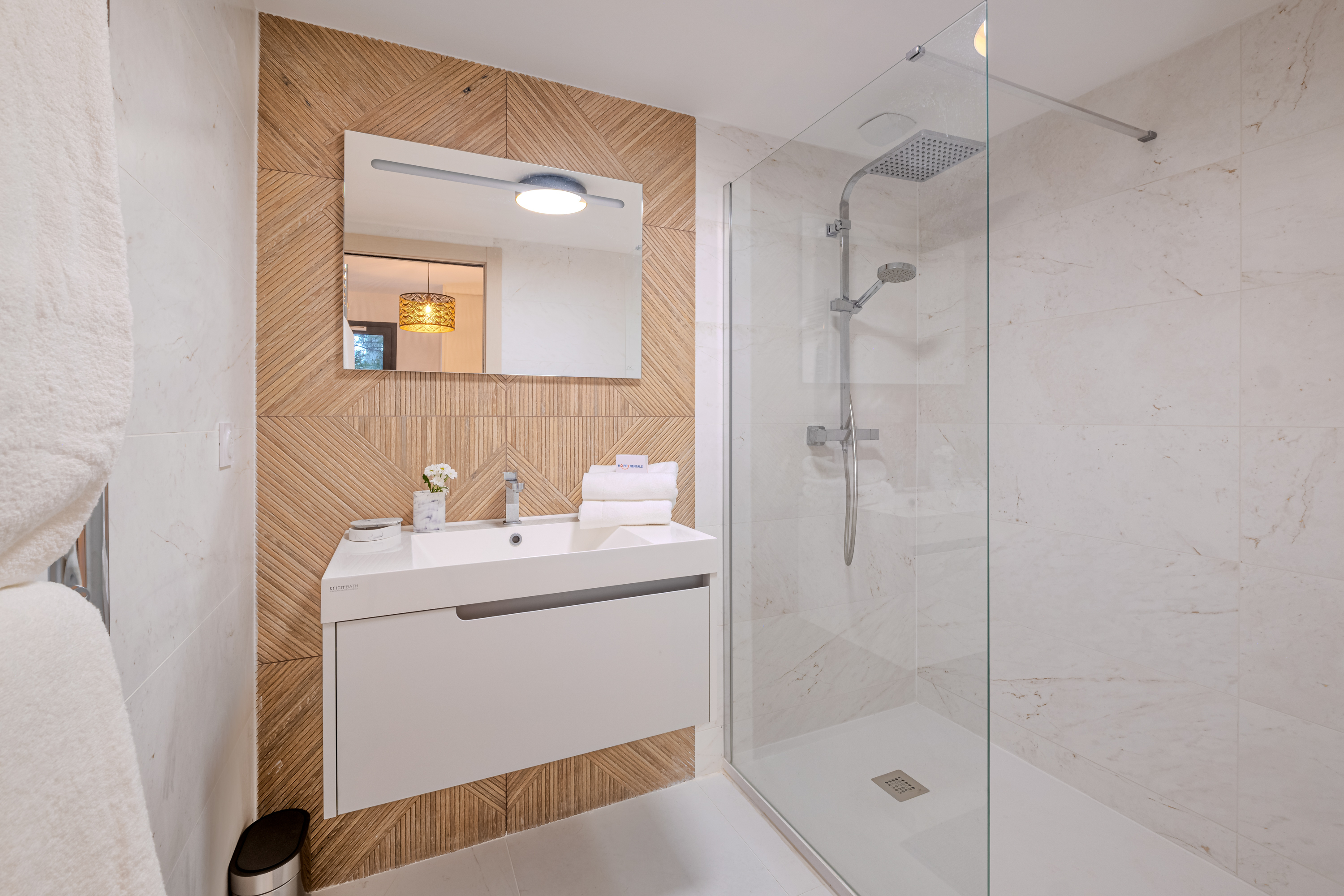 Badkamer: De badkamer in de hoofdslaapkamer heeft een douche en wastafel.