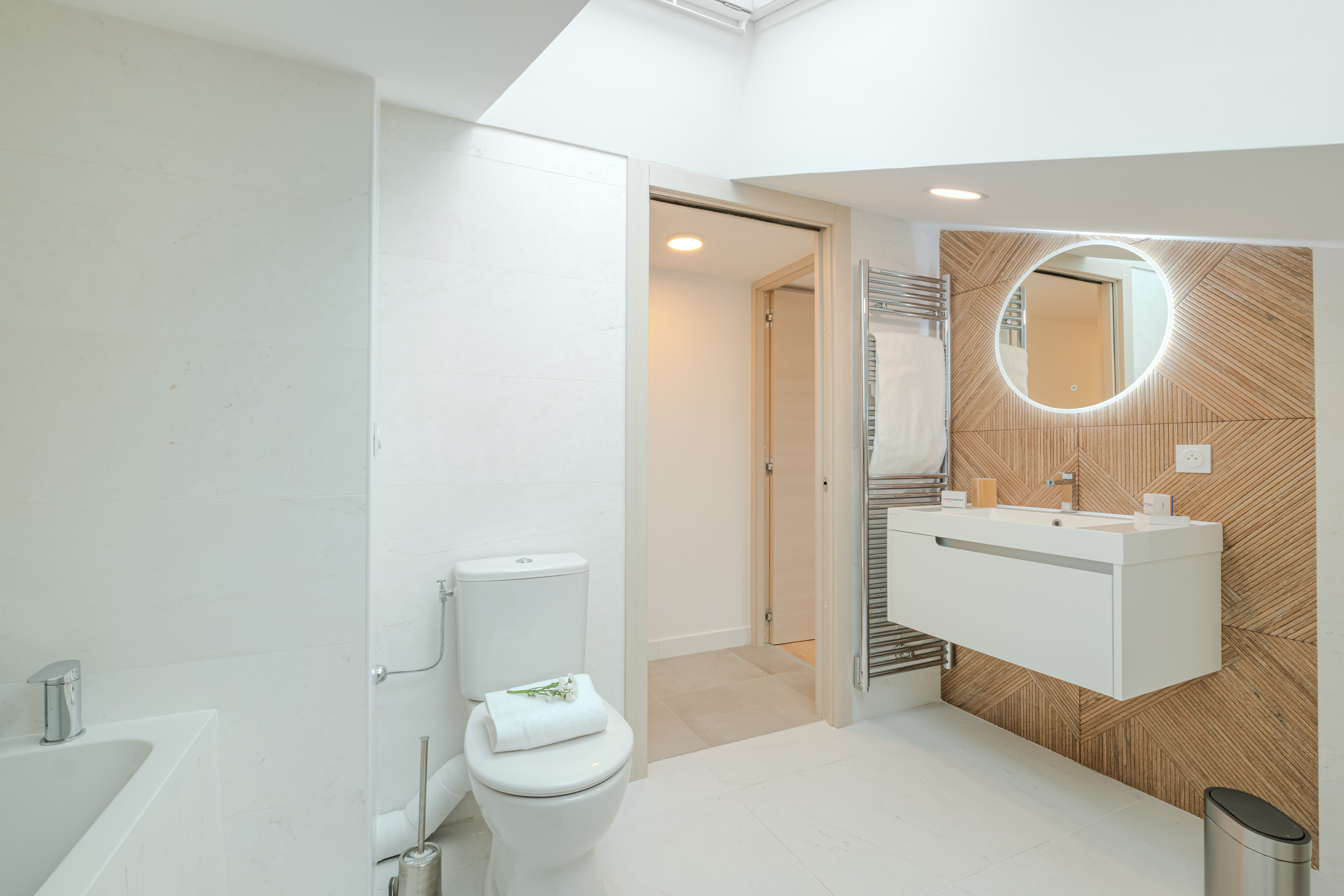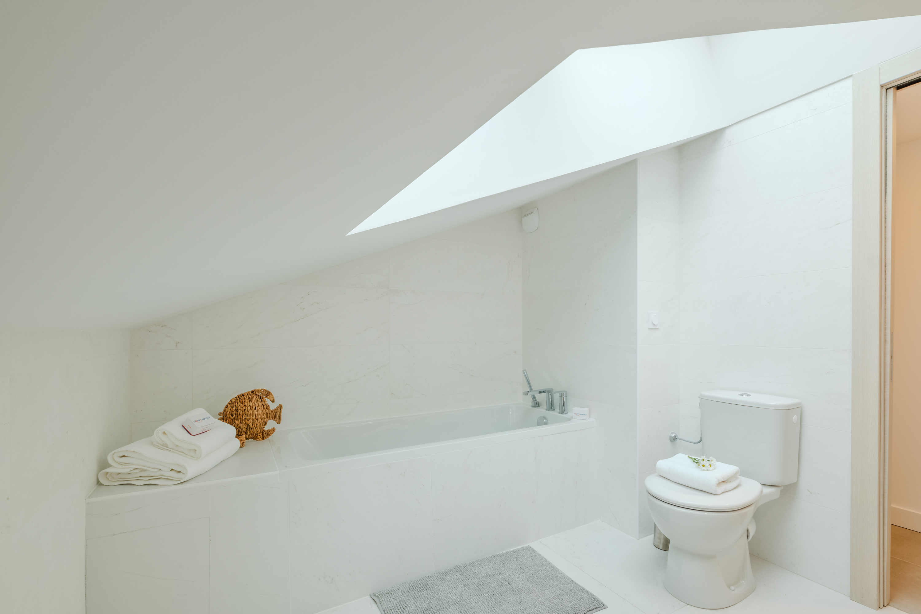 Badkamer boven: De badkamer is uitgerust met een bad, wastafel en toilet.