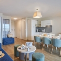 - Een uitgeruste kitchenette met koelkast, kookplaat, magnetron, vaatwasser en capsule koffiezetapparaat.