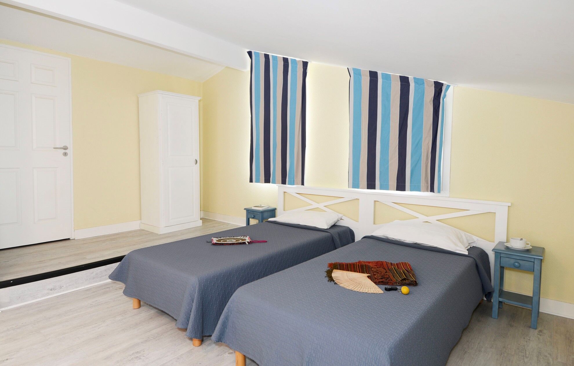 - De eerste slaapkamer heeft een tweepersoonsbed, terwijl de tweede slaapkamer twee eenpersoonsbedden bevat.