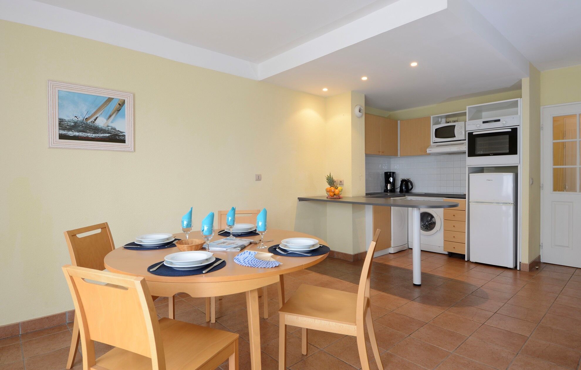 - De keuken is voorzien van elektrische kookplaten, een koelkast, een oven, een magnetron, een vaatwasser en een wasmachine.