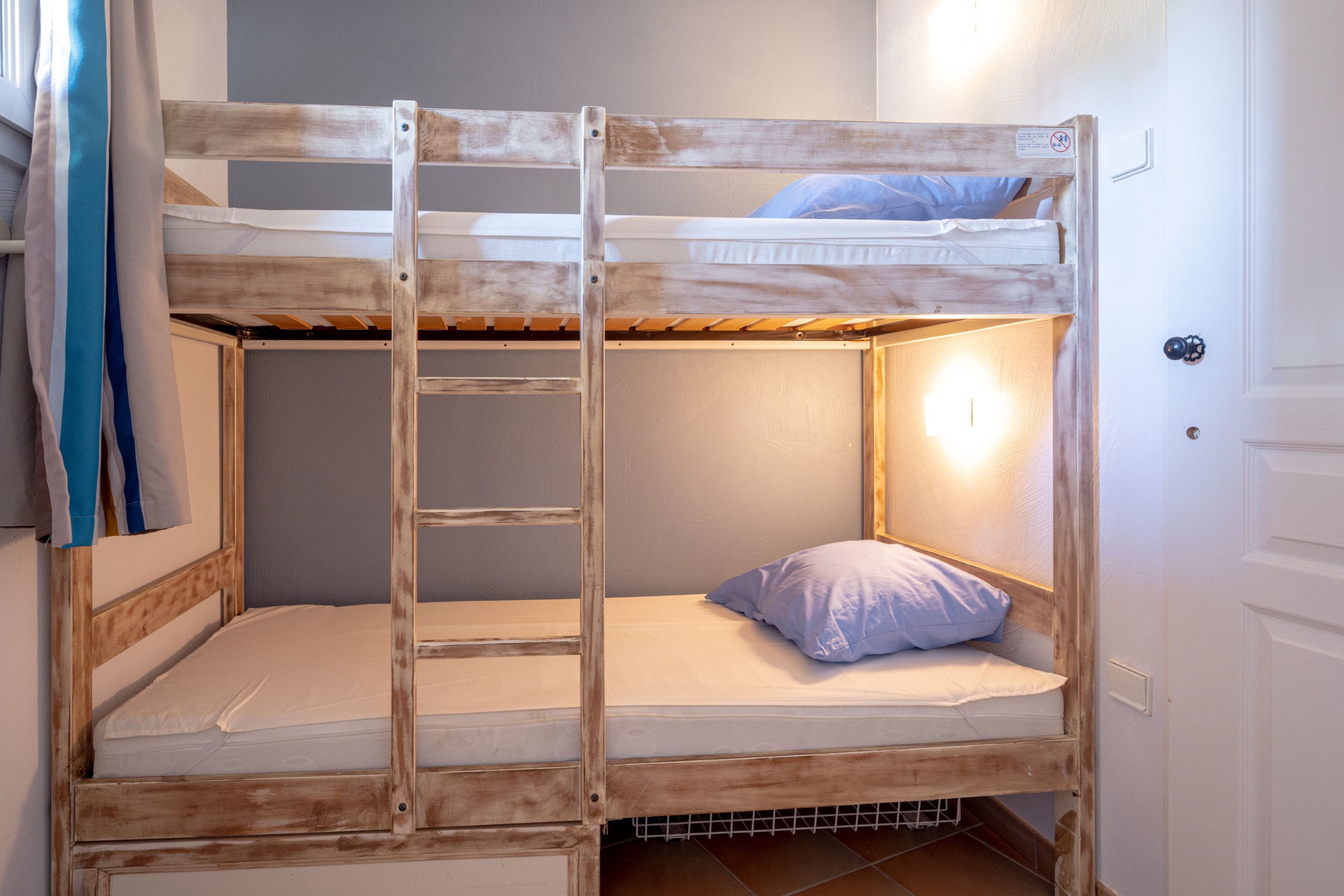 - Woonruimte met 2 slaapbanken (waarvan één met uitschuifbaar bed, ideaal voor kinderen) en een slaapnis met stapelbedden (aanbevolen voor kinderen)
