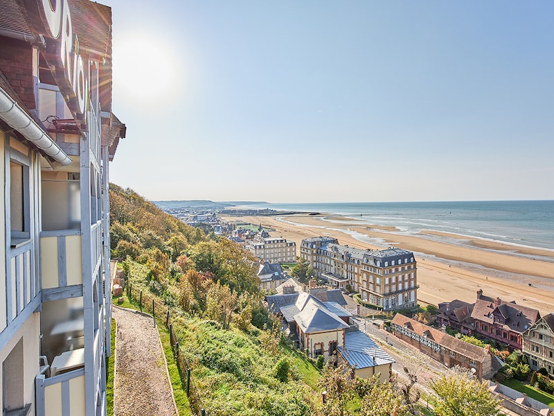 De locatie van de residentie is adembenemend, gelegen op een heuvel met ononderbroken uitzicht op de zee en de Côte Fleurie, omringd door serene, rustige landschappen. Les Tamaris, dicht bij Trouville, heeft een Normandische architectuur met pastelkleurige gevelbekleding, omgeven door een grote privétuin. Binnen zijn de studio’s van 25 m² ontworpen voor comfort, met een volledig uitgeruste kitchenette die uitkomt op de woonkamer. Elk appartement heeft een eigen balkon, perfect om te zonnebaden of te dineren met uitzicht, en sommige bieden zelfs direct uitzicht op zee.