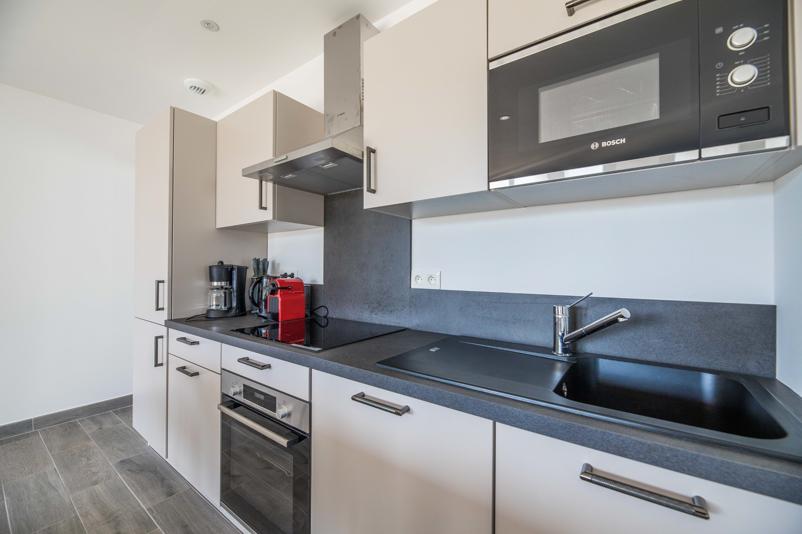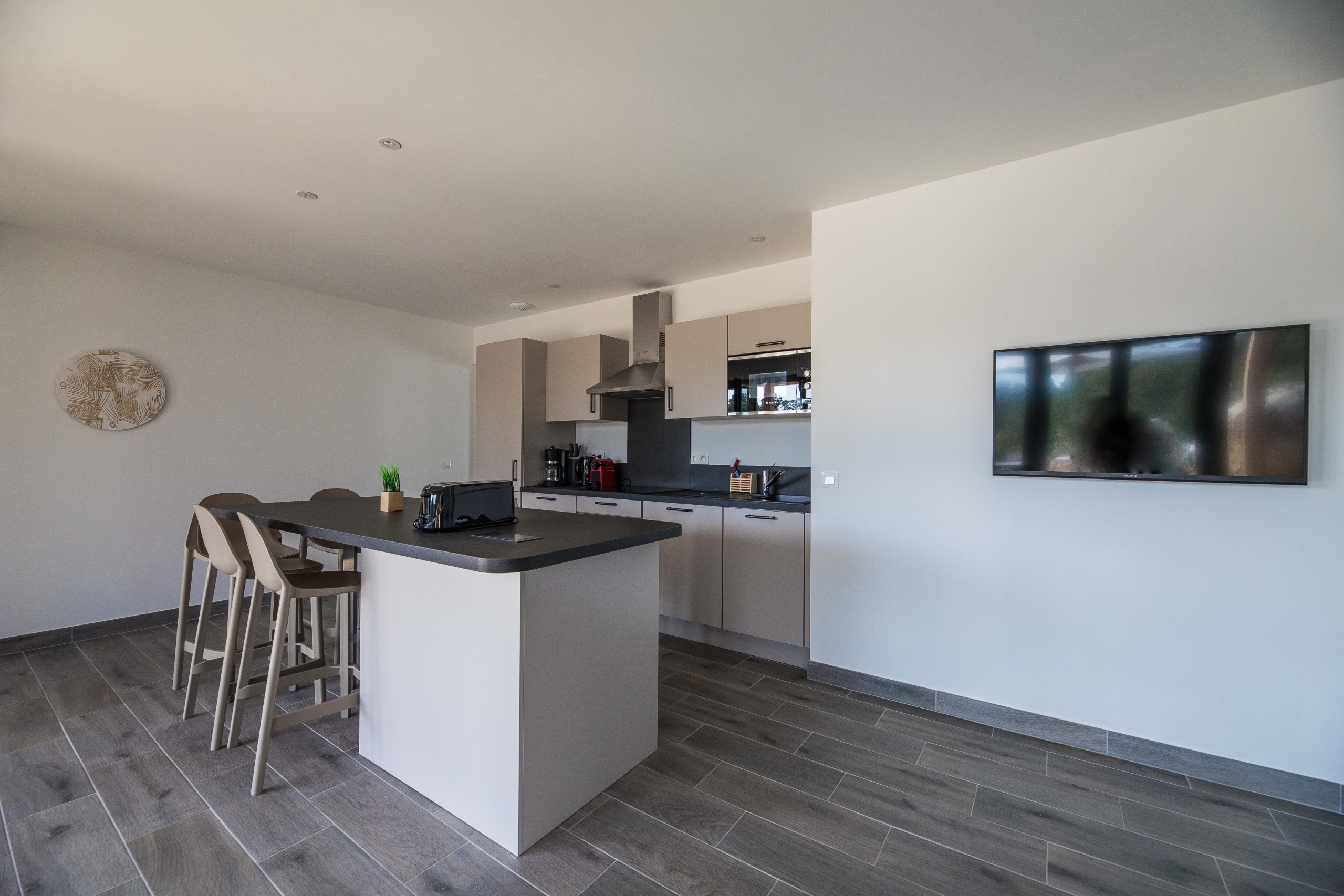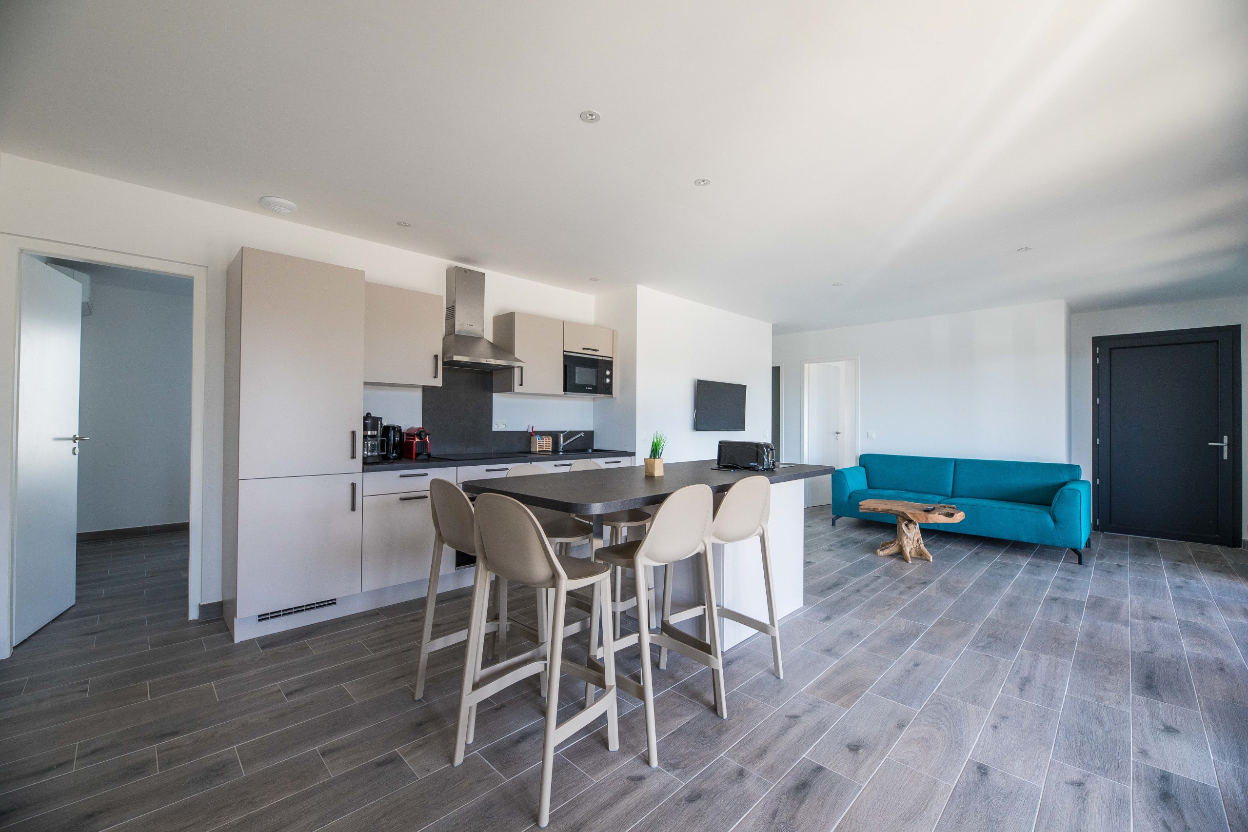 - Keuken: Uitgeruste open kitchenette (geïntegreerd met de woonruimte)