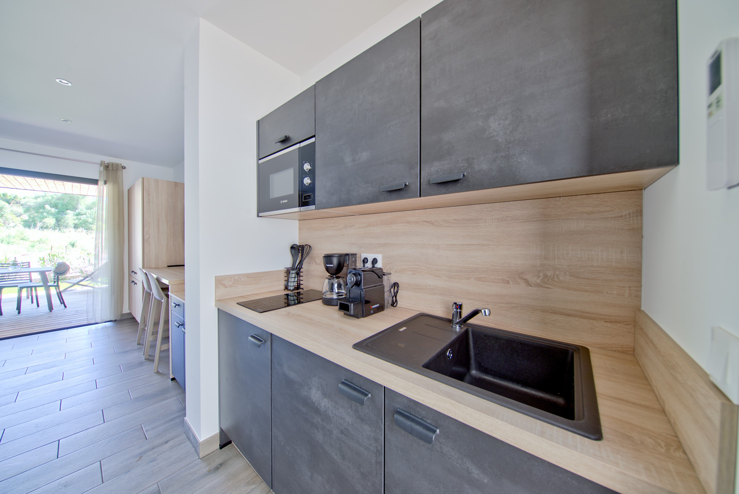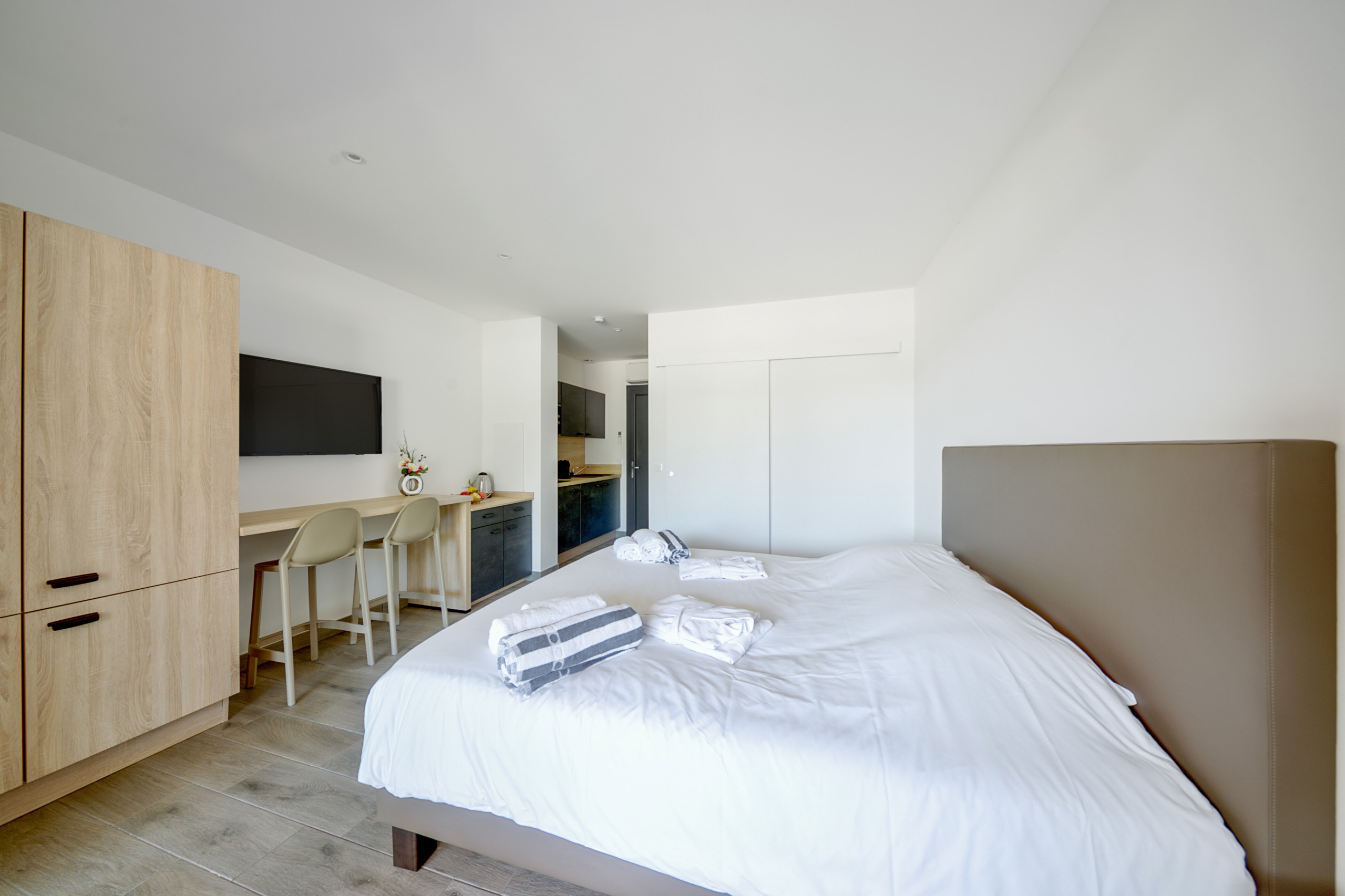 - Keuken: Uitgeruste open kitchenette (geïntegreerd met de woonruimte)