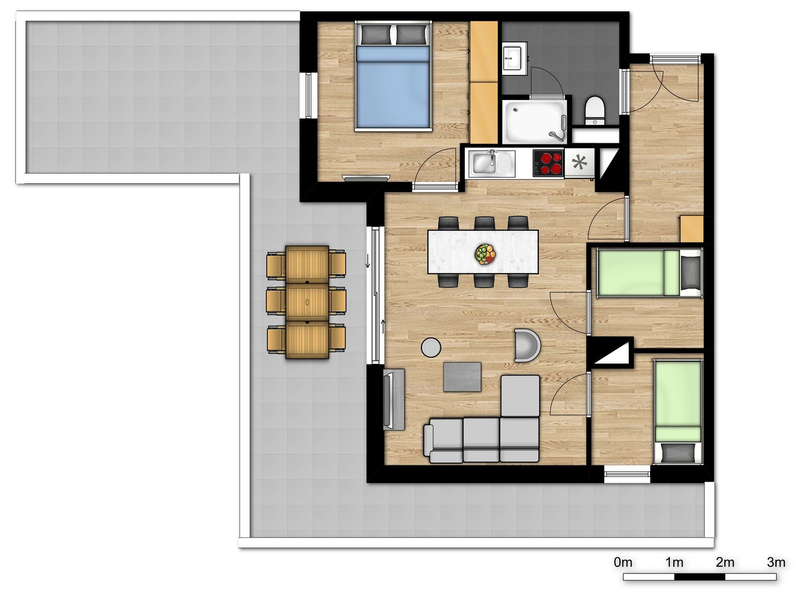 Dit nieuw deluxe vakantieverblijf voor 6 personen beschikt over een slaapkamer met dubbel bed en 2 slaaphoeken met telkens een stapelbed voor 2 personen. Het verblijf is van alle comfort voorzien en beschikt over een gezellige woonkamer met flatscreen televisie. De open keuken is volledig uitgerust (frigo, combi microgolfoven, 4 kookplaten, waterkoker, koffiezetapparaat, vaatwasser, potten en pannen, eetservies ,…). In de badkamer is er een douche en een lavabo. Het verblijf beschikt over een aparte WC. Er is eveneens een luxe terras