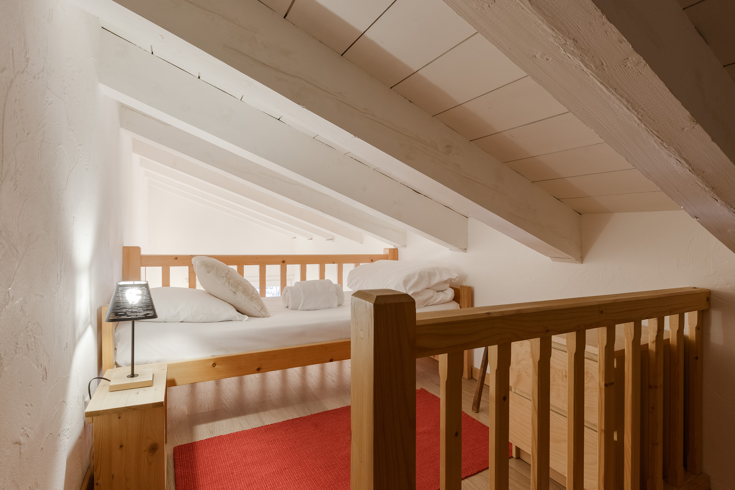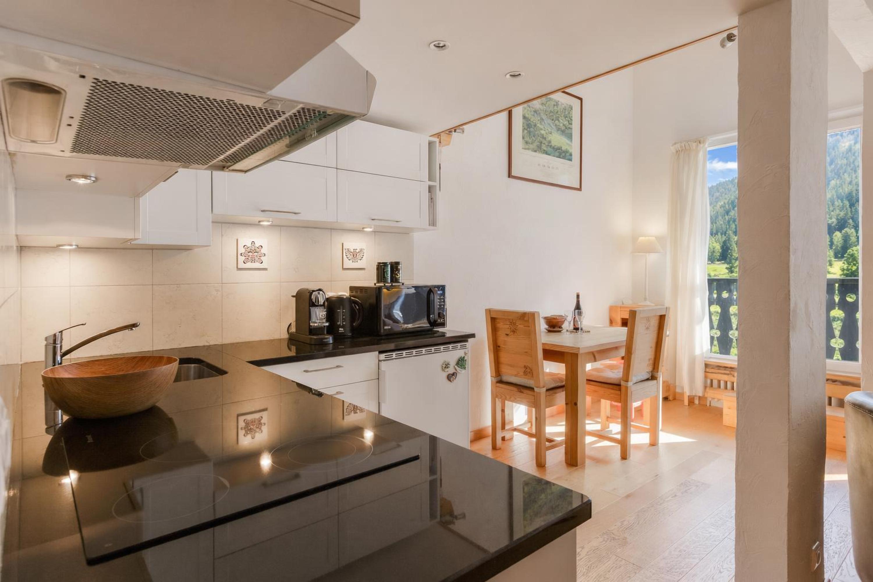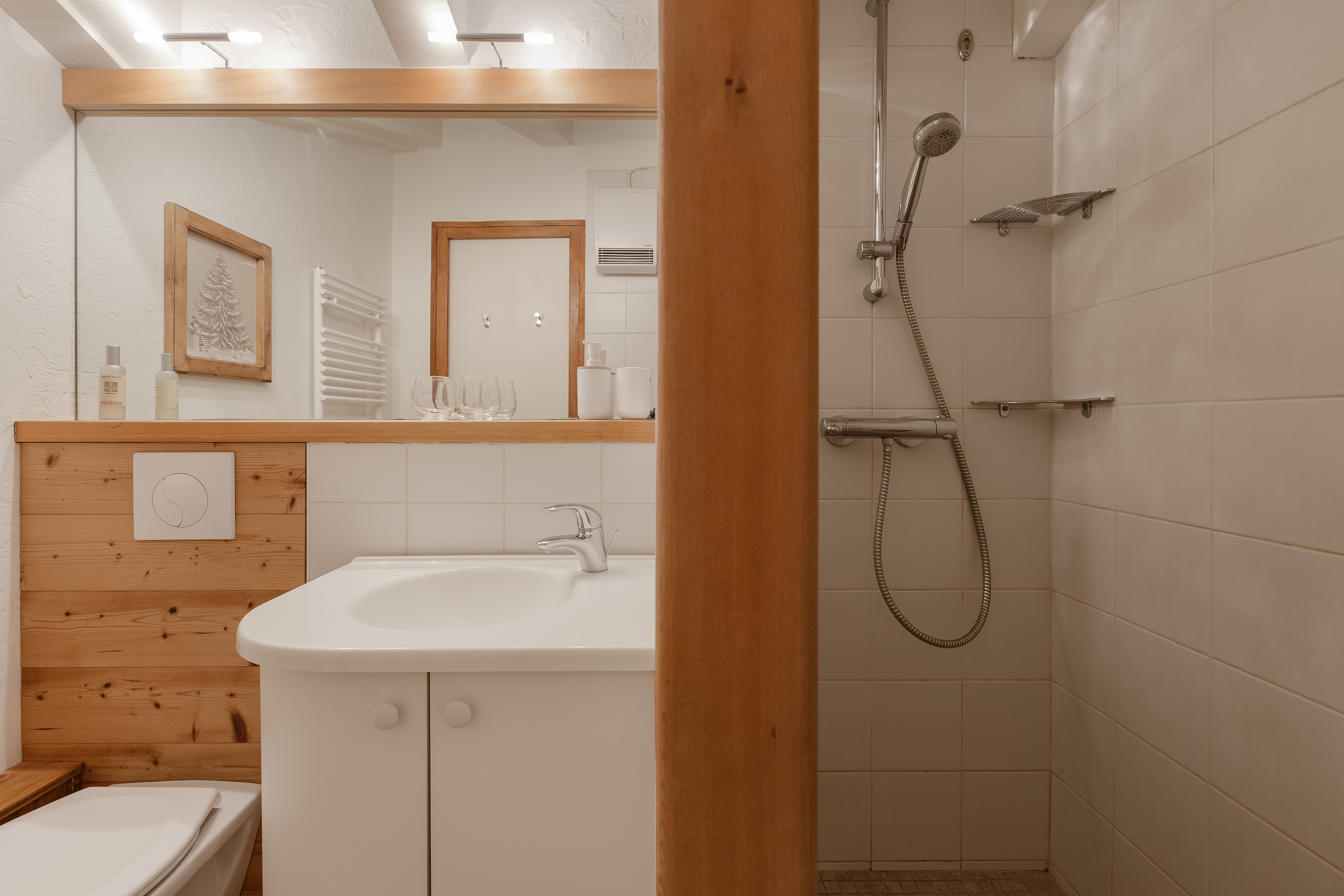 Het interieur van het appartement is een mix van alpine charme en chique elegantie. De open woonruimte is licht en ruim, met stijlvolle leren fauteuils, een bank en een flatscreen-tv. De keuken is modern en goed uitgerust, met een glazen deur die leidt naar een privébalkon met uitzicht op de bossen en de bergen. Er zijn twee slaapkamers: een gezellige, met hout beklede kamer met een tweepersoonsbed en een flatscreen-tv, en een open mezzanine slaapkamer met twee eenpersoonsbedden, ideaal voor kinderen. De badkamer is strak en modern, met een grote douche, wastafel en toilet.