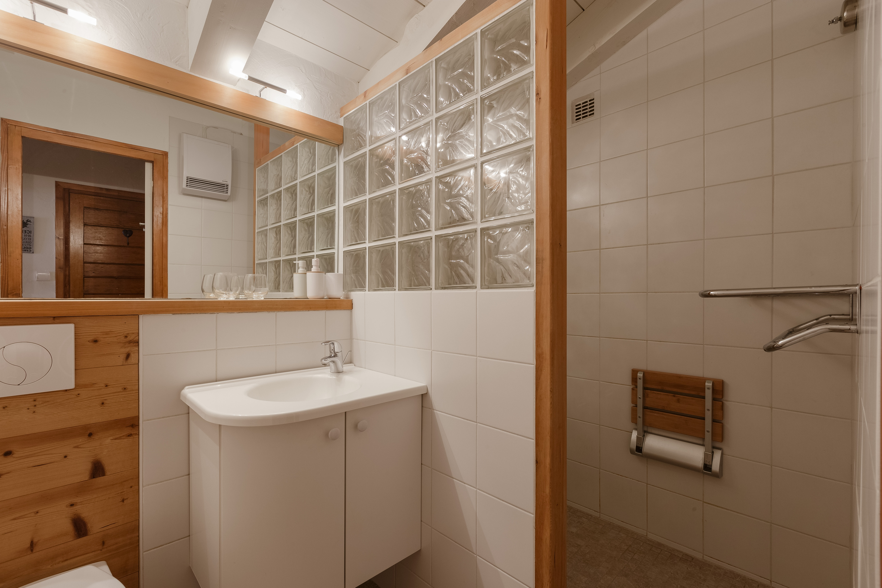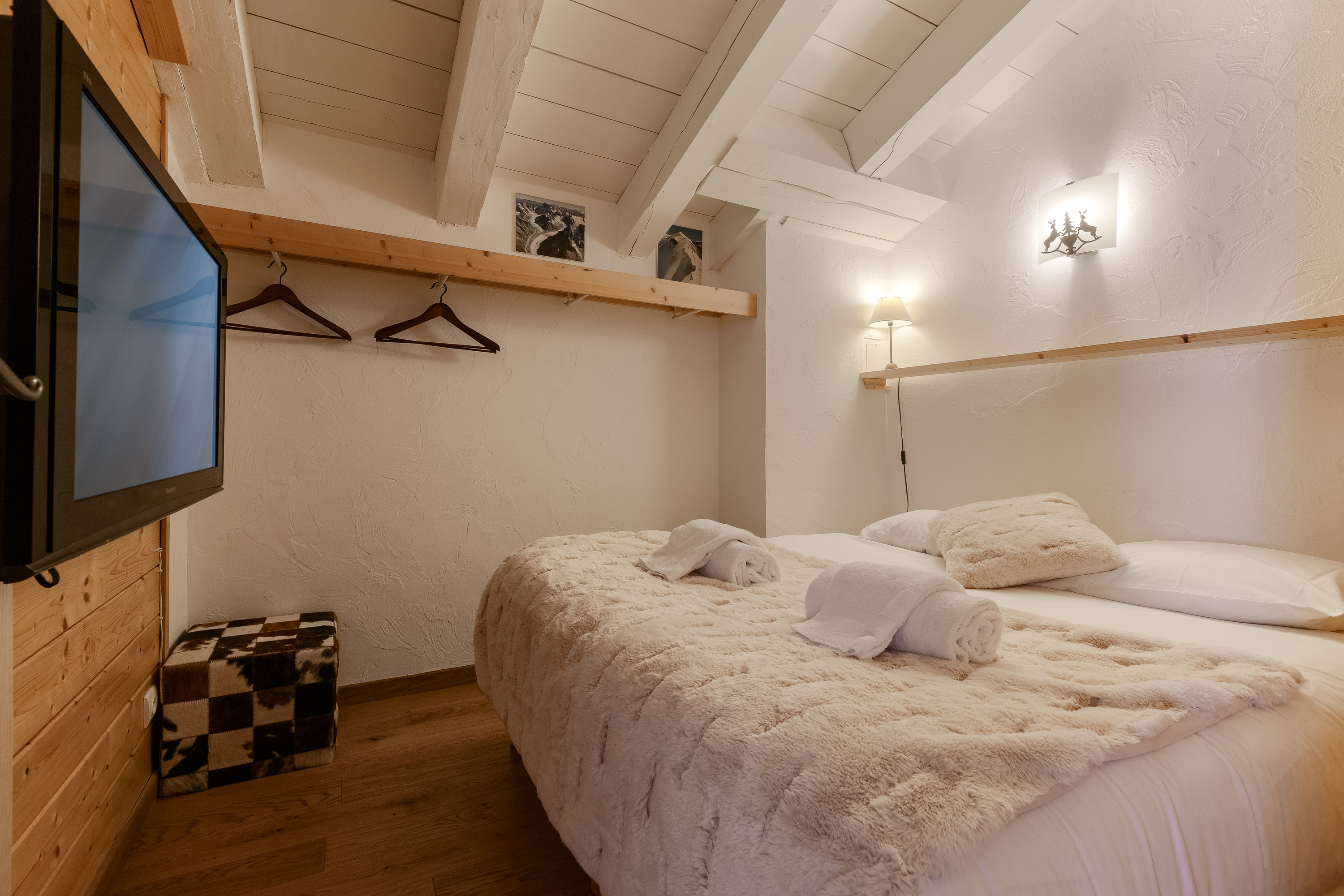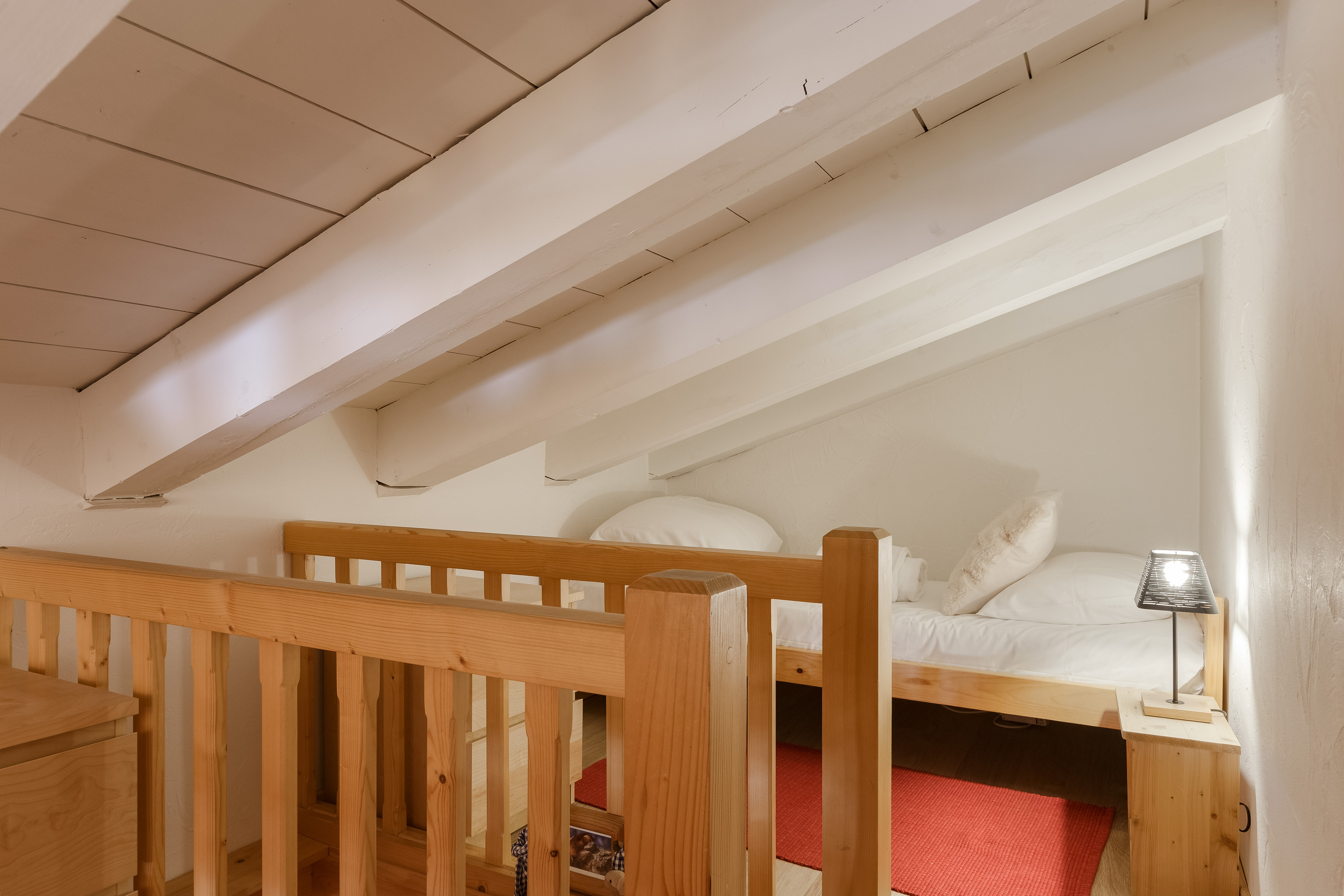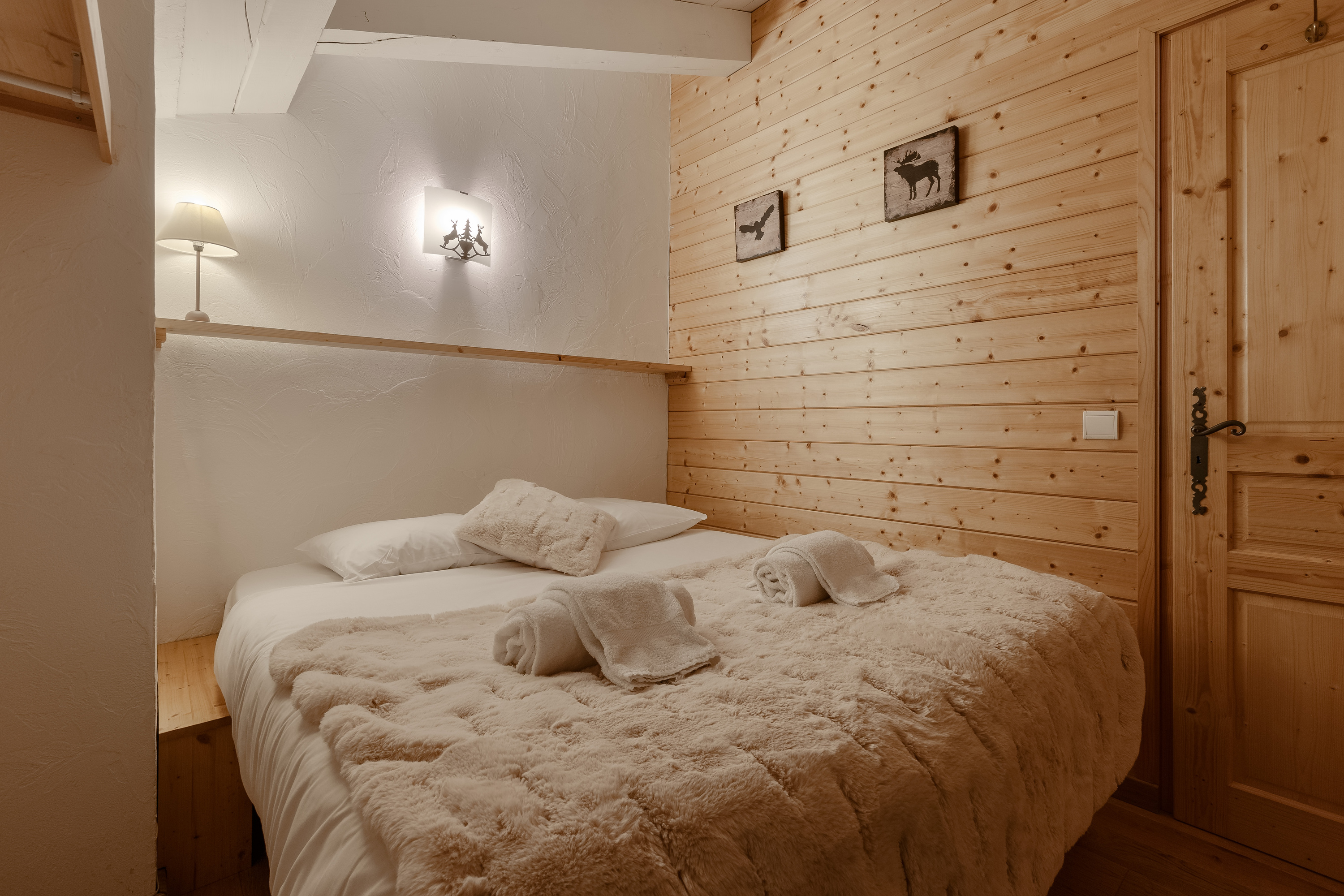 Het interieur van het appartement is een mix van alpine charme en chique elegantie. De open woonruimte is licht en ruim, met stijlvolle leren fauteuils, een bank en een flatscreen-tv. De keuken is modern en goed uitgerust, met een glazen deur die leidt naar een privébalkon met uitzicht op de bossen en de bergen. Er zijn twee slaapkamers: een gezellige, met hout beklede kamer met een tweepersoonsbed en een flatscreen-tv, en een open mezzanine slaapkamer met twee eenpersoonsbedden, ideaal voor kinderen. De badkamer is strak en modern, met een grote douche, wastafel en toilet.
