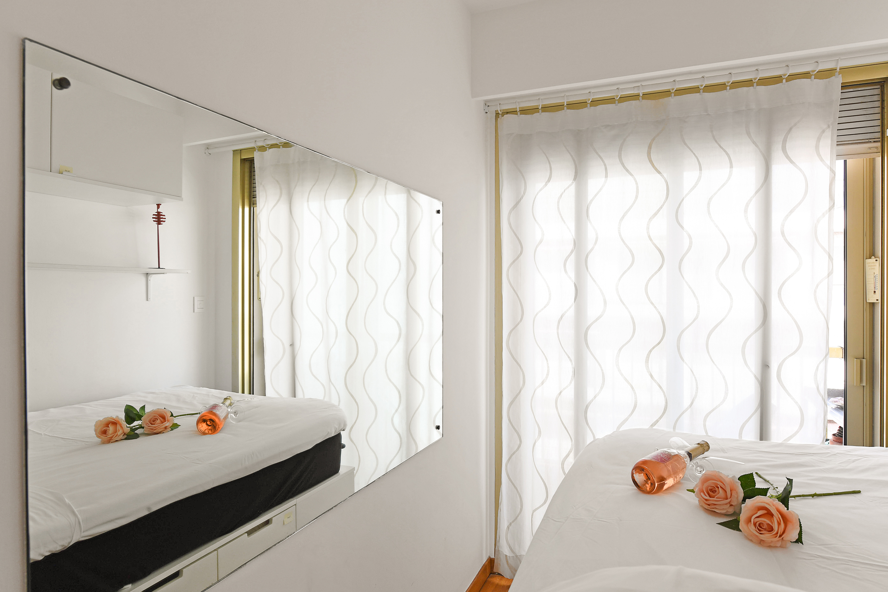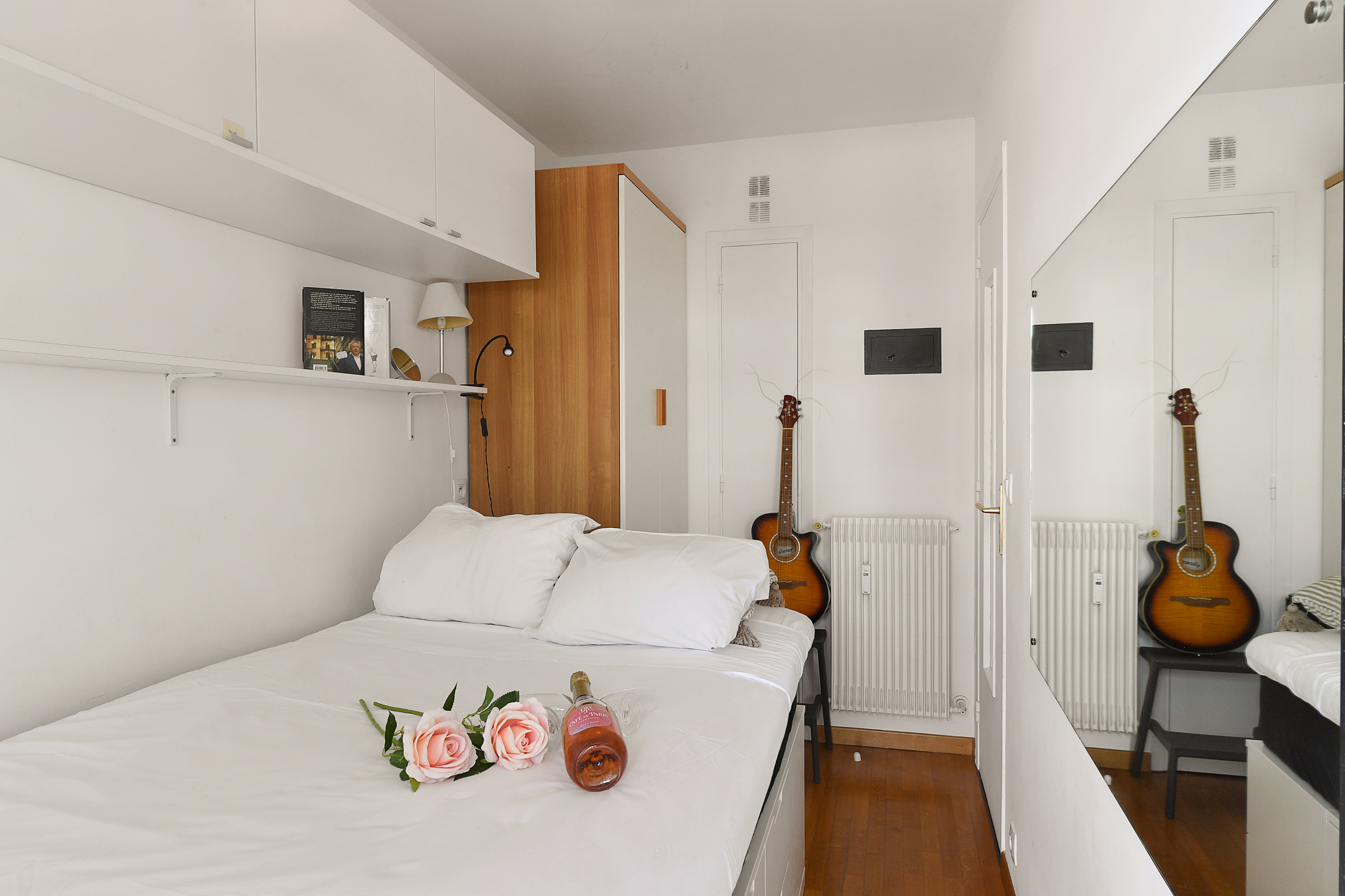 – Het appartement beschikt over een kleine slaapkamer met een groot eenpersoonsbed en een kledingkast.