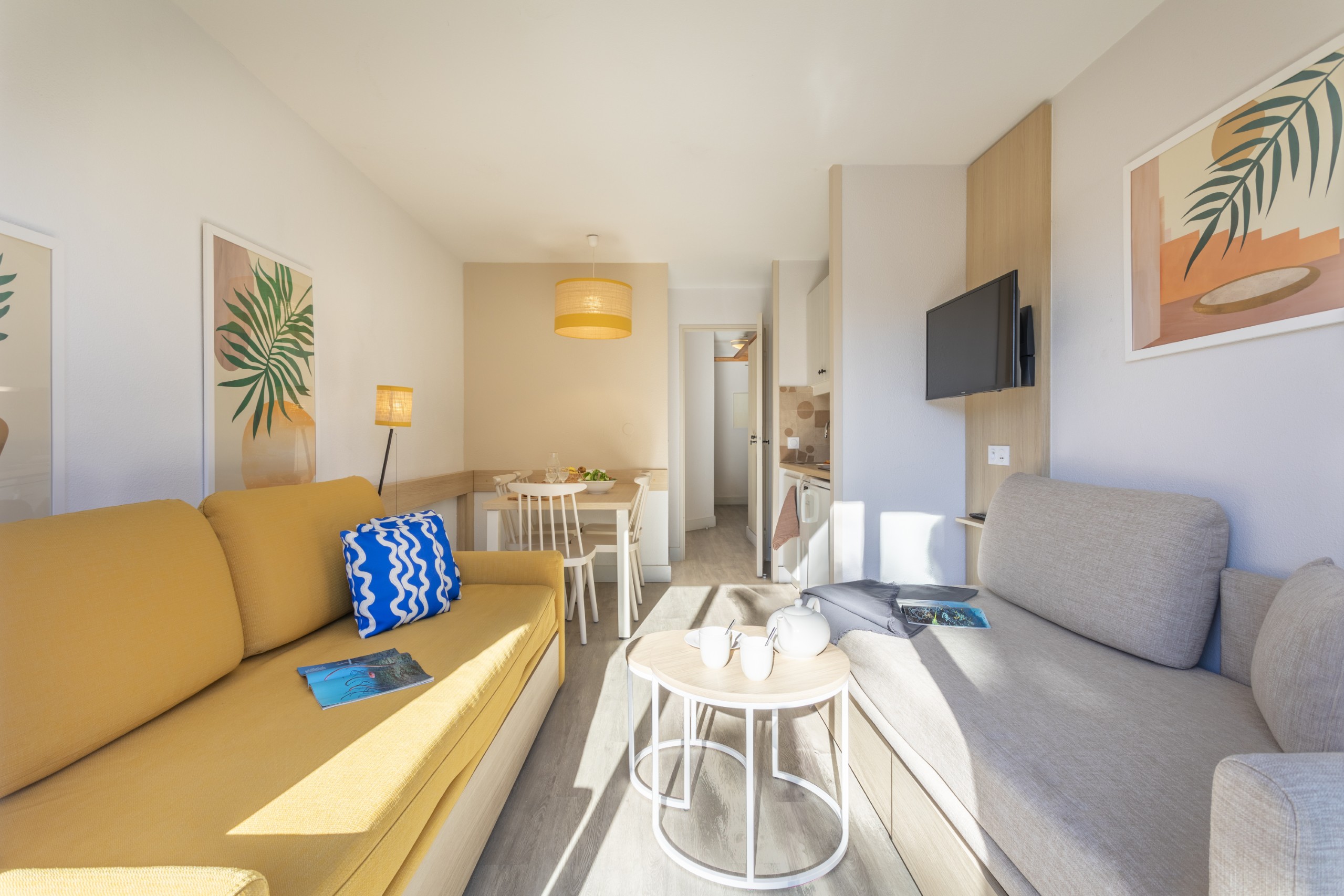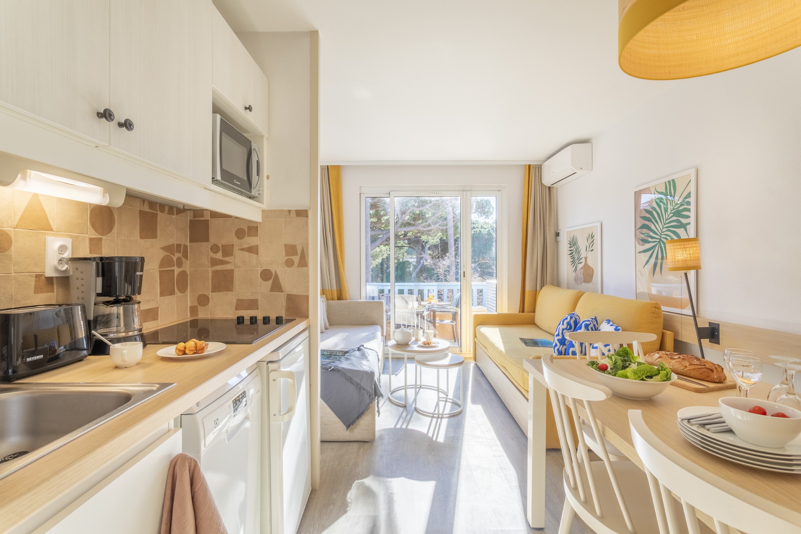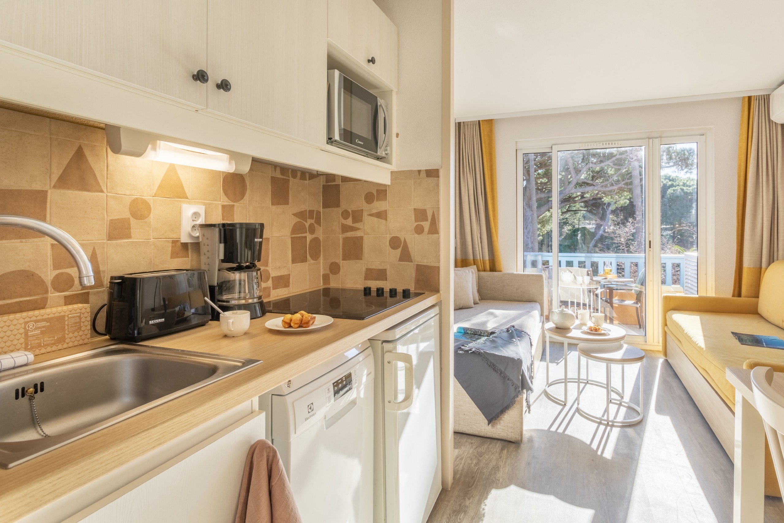 De open kitchenette is volledig uitgerust en geïntegreerd in de woonruimte. Afhankelijk van de ligging biedt het appartement uitzicht op het zwembad of het dennenbos.