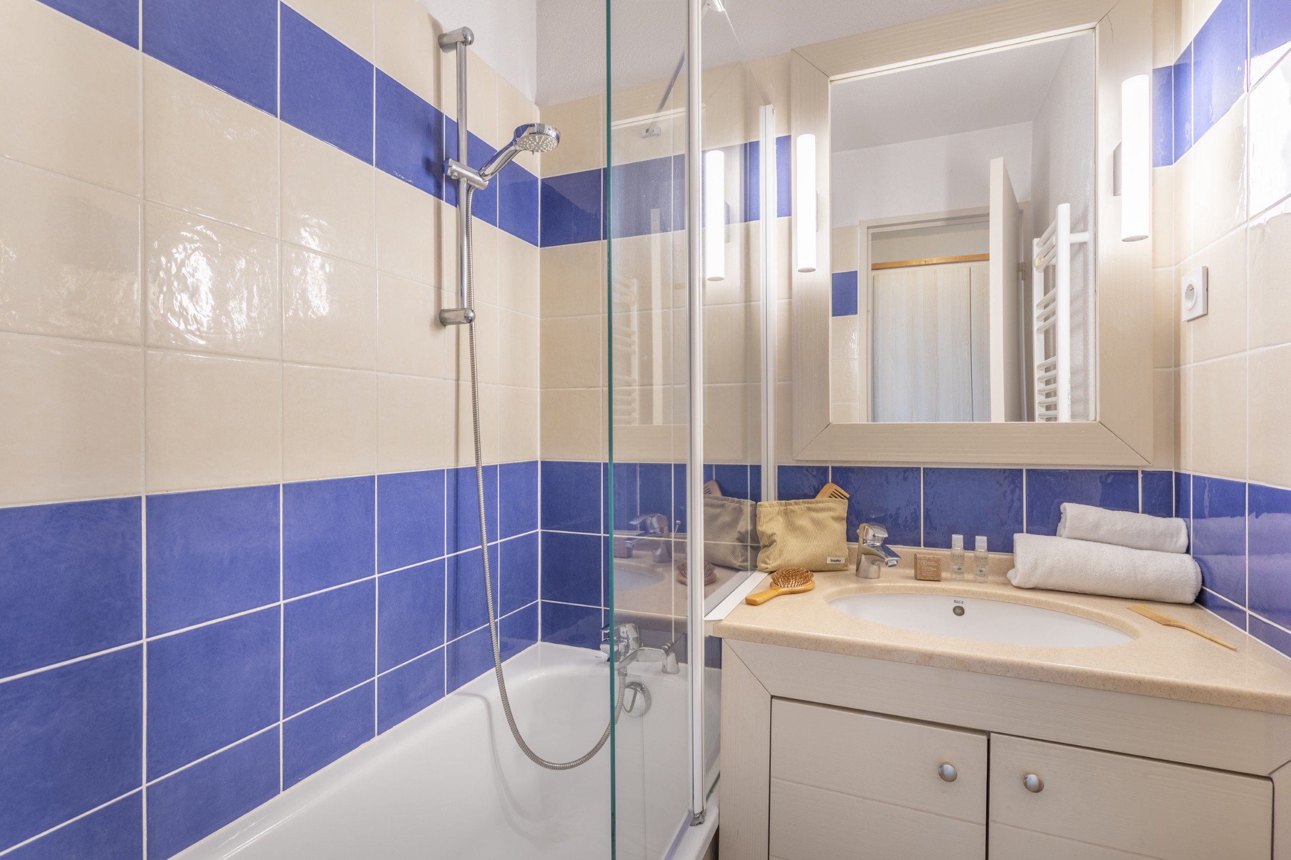 De woonkamer heeft twee eenpersoons slaapbanken, waarvan één met een onderschuifbed (aanbevolen voor kinderen). De slaapkamer is ingericht met een tweepersoonsbed. De badkamer heeft een ligbad, het toilet is apart.