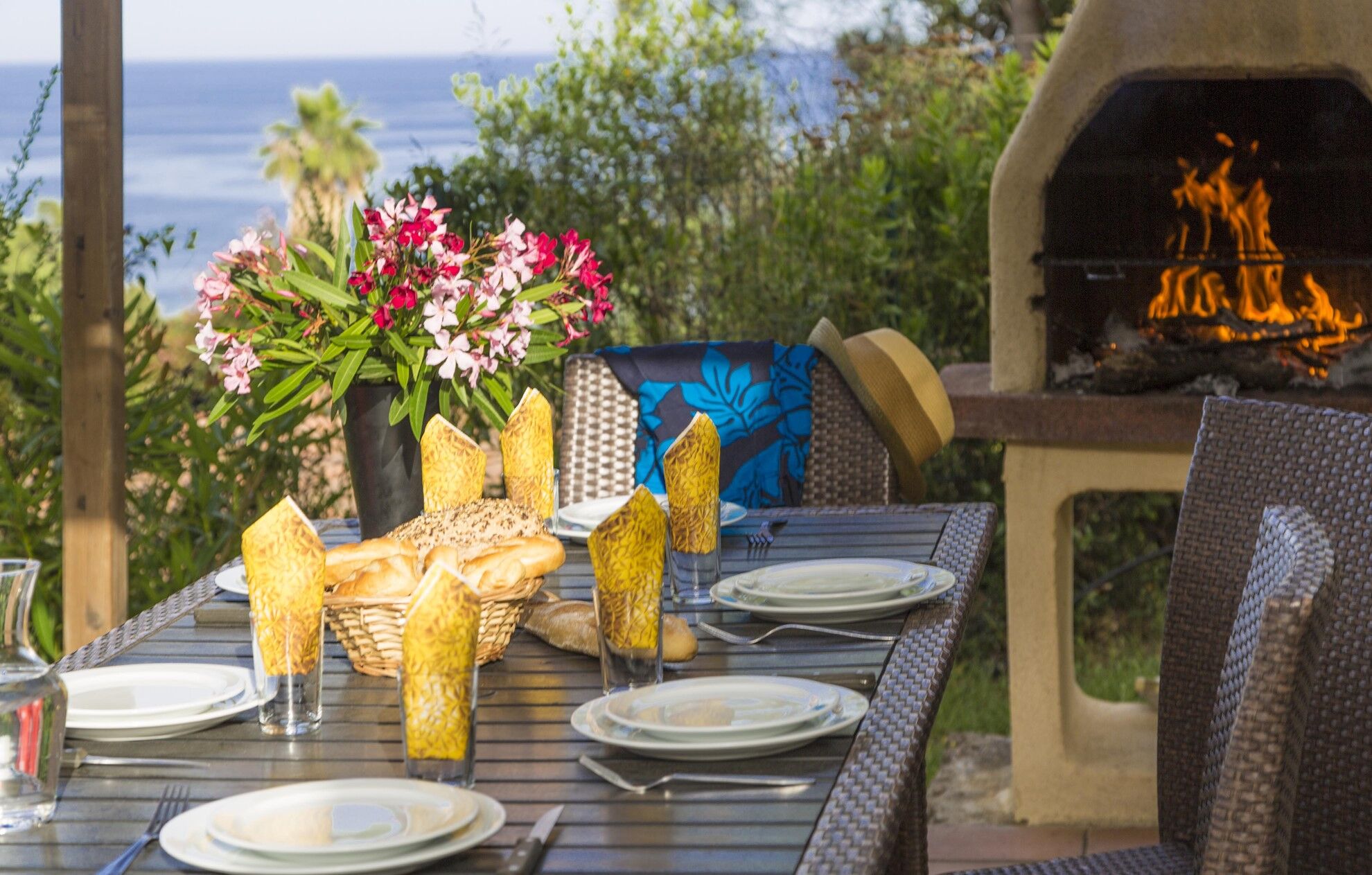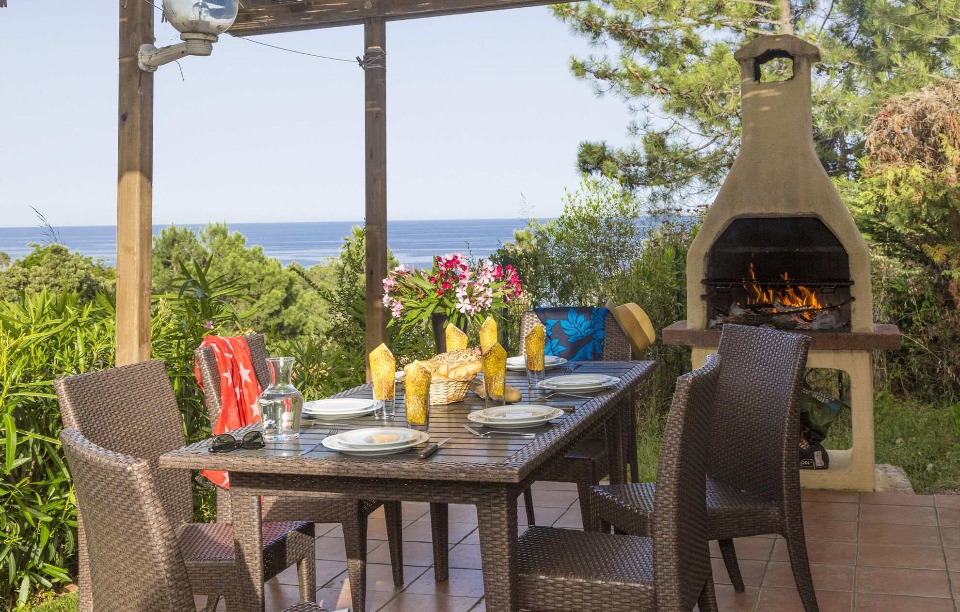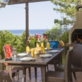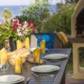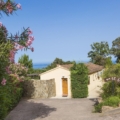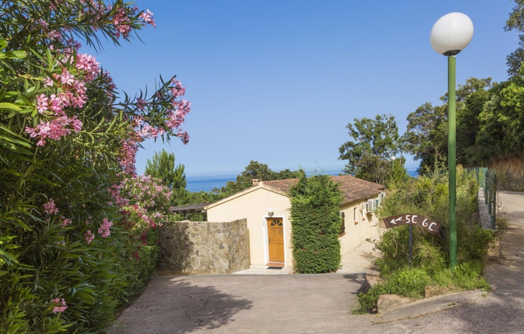 De huisjes, die deel uitmaken van deze vakantieverhuur op Corsica liggen in een prachtige omgeving, gegroepeerd in twee of drie, verspreid tussen de bomen en vegetatie, op een helling met uitzicht op zee.
