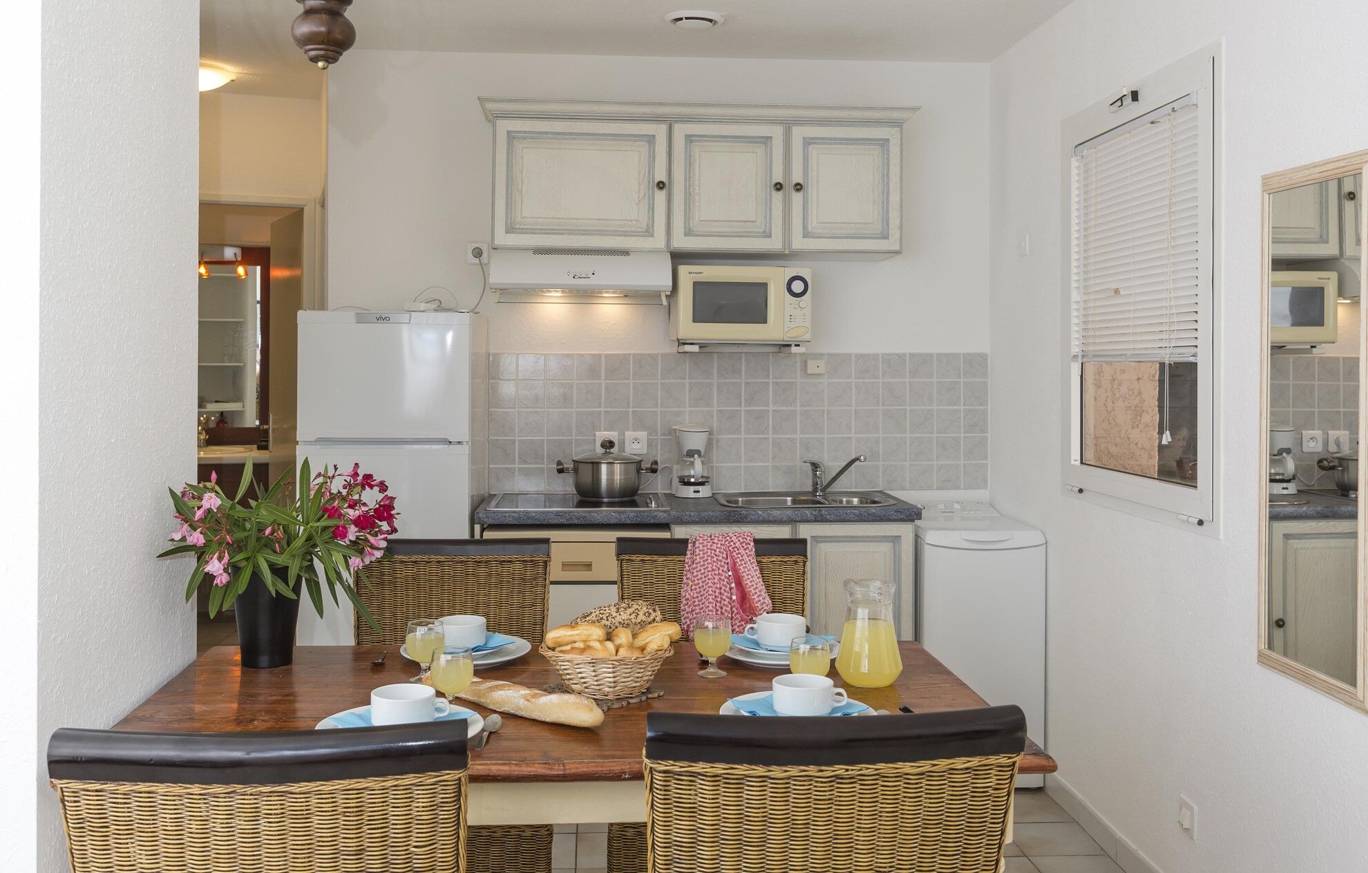 Moderne keukenhoek met keramische kookplaat, vaatwasser, magnetron, koel-vriescombinatie, wasmachine en elektrische koffiemachine