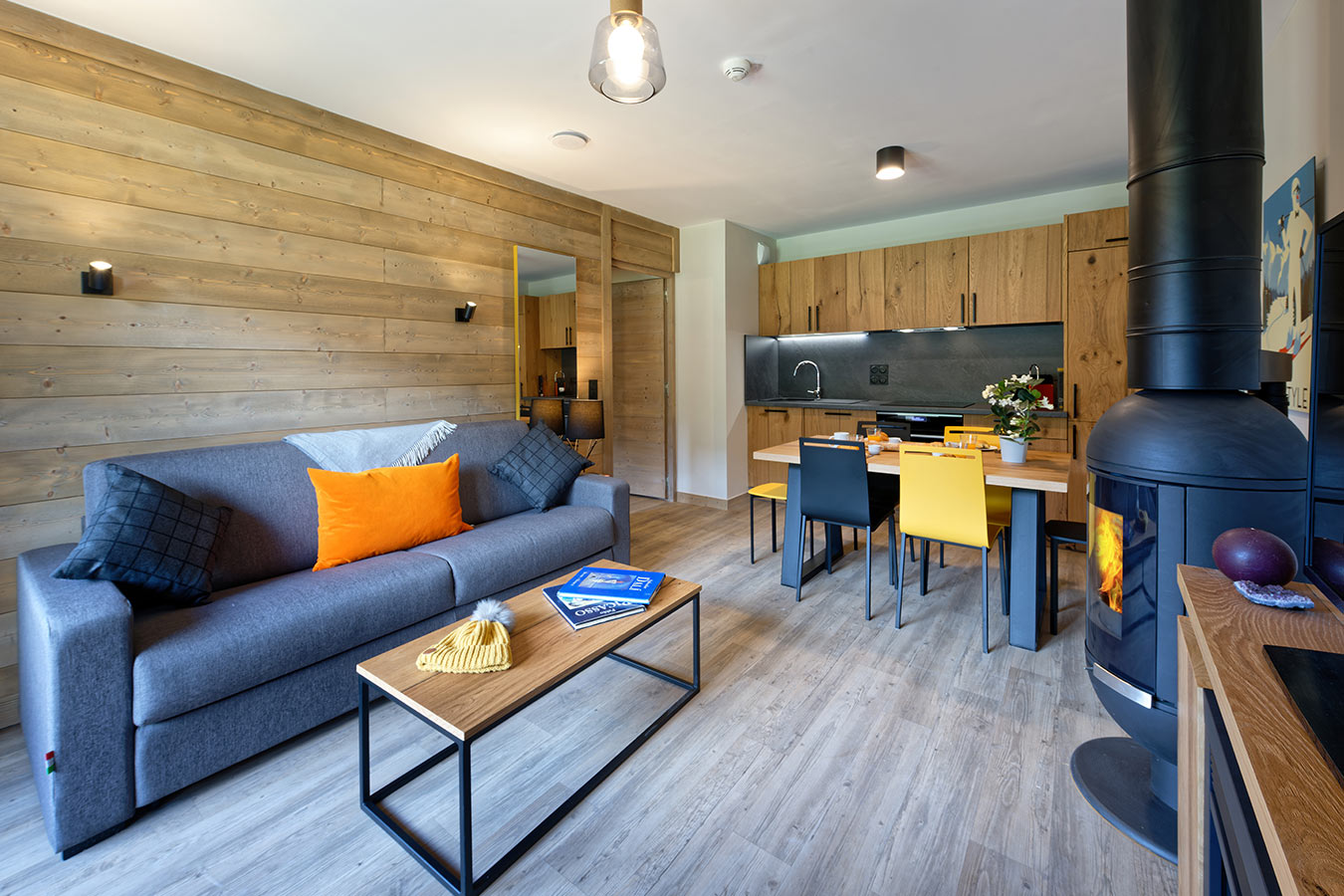 Appartement van grote oppervlakte met een woonkamer met open haard en slaapbank voor 2 personen.