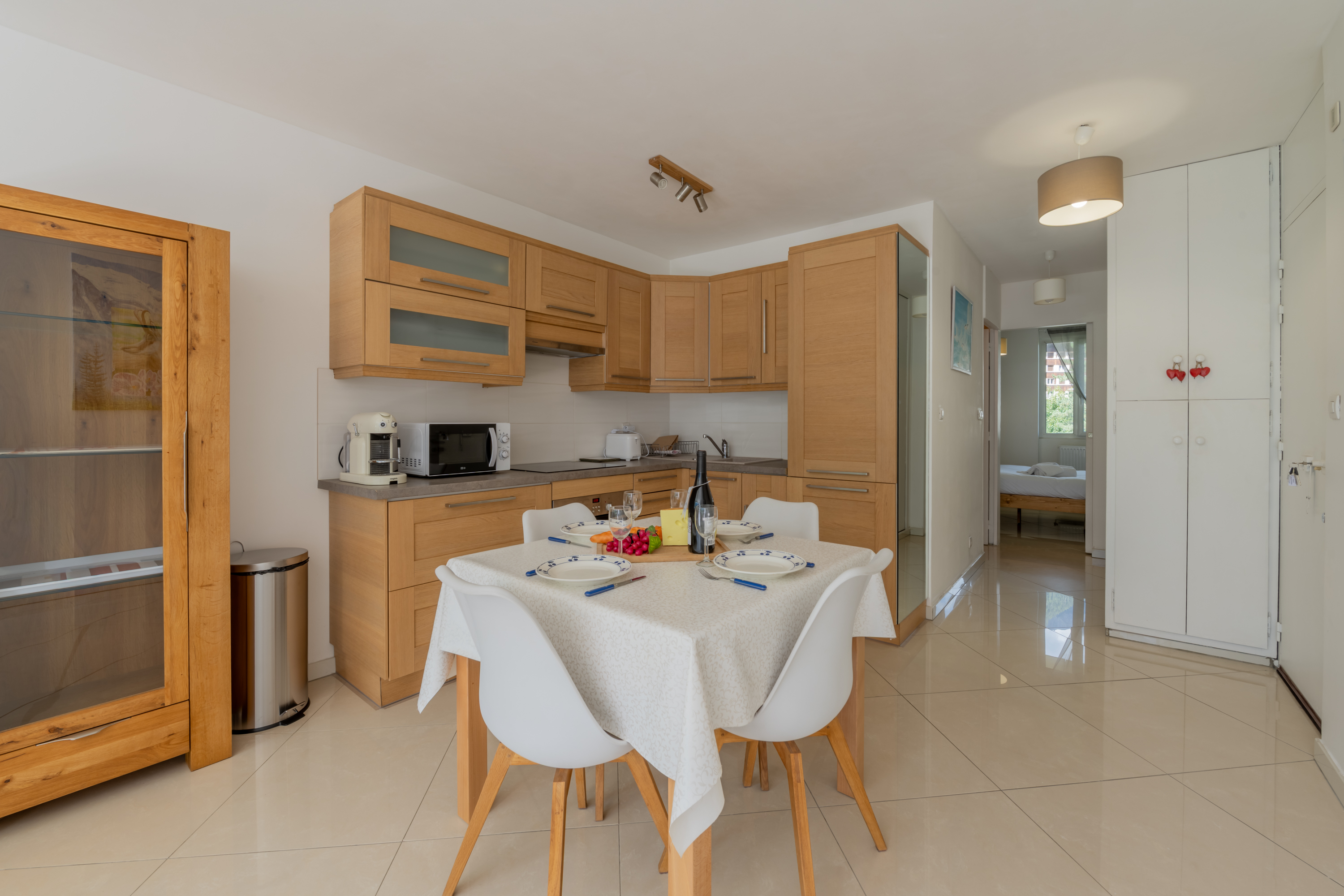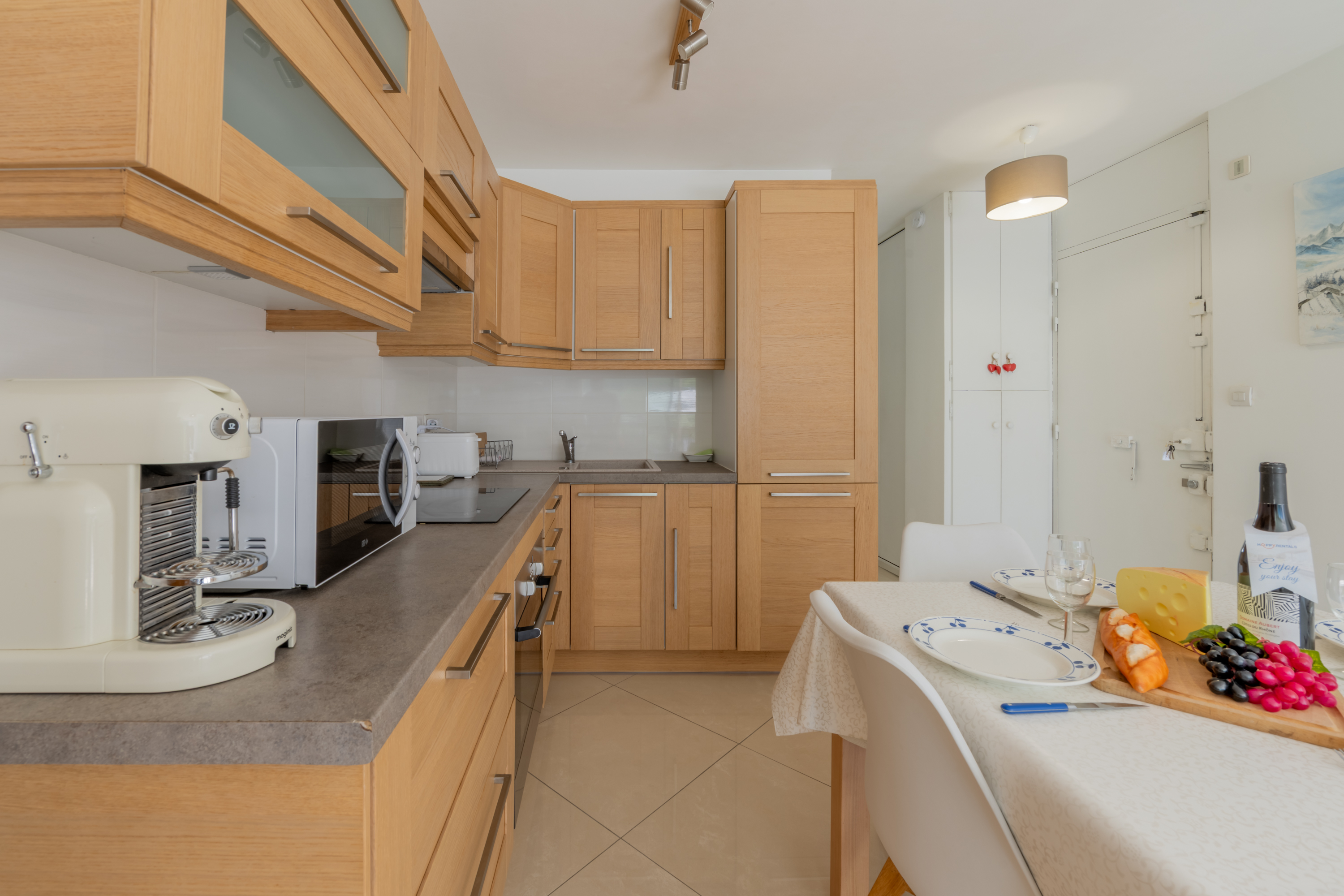 Het stijlvolle appartement beschikt over een open leefruimte die dankzij de glazen deuren naar het balkon volop licht is. Zoals de naam al doet vermoeden, kunnen gasten genieten van een panoramisch uitzicht op de Alpen. Binnen is het appartement ingericht met een aantrekkelijke bank en een flatscreen-tv. Naast de nette, ingerichte keuken staat een eettafel met grenenhouten stoelen. Deze is goed uitgerust met een kookplaat, oven, magnetron, koelkast en een Dolcegusto-koffiezetapparaat.
