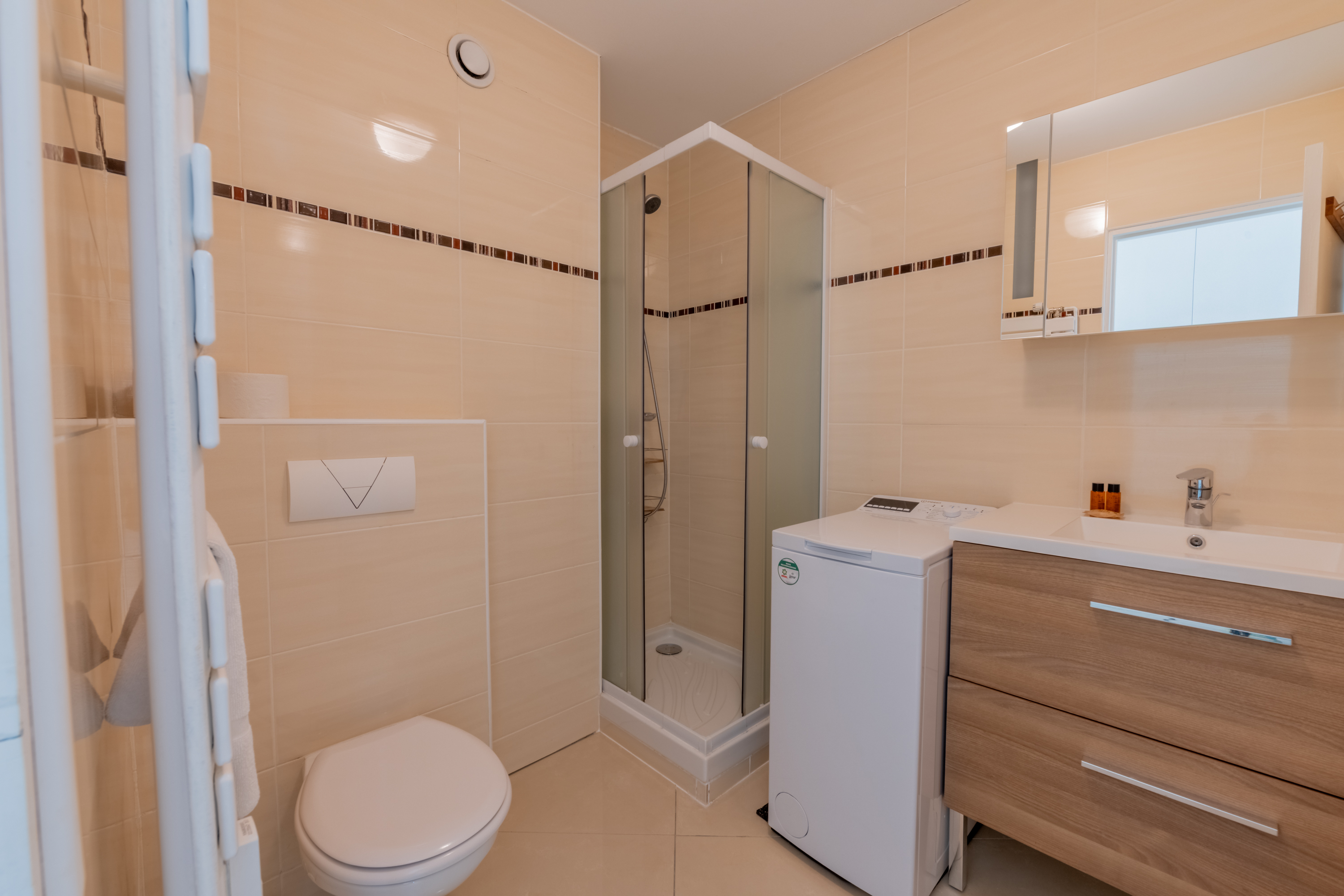 De betegelde badkamer beschikt over een glazen douche, een wastafel, een wasmachine en een toilet.