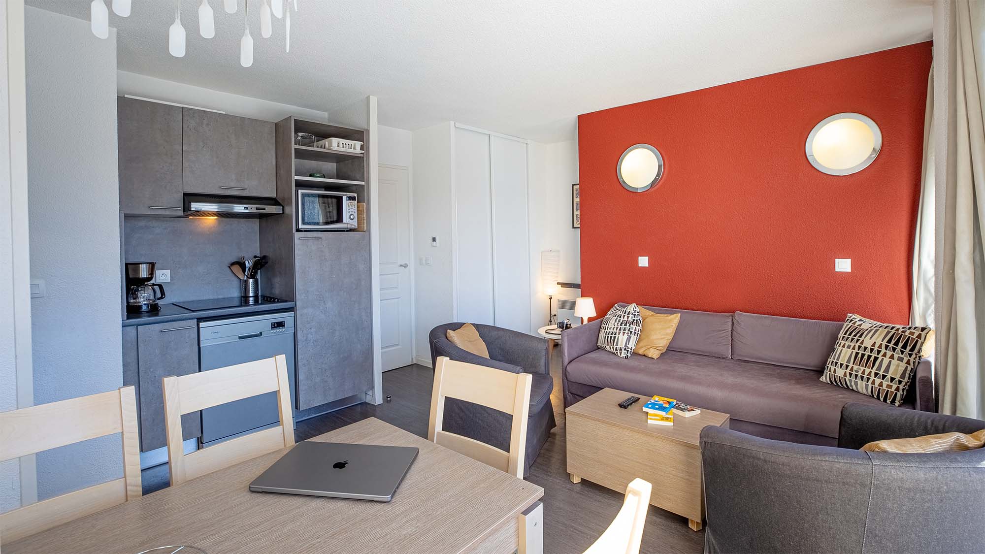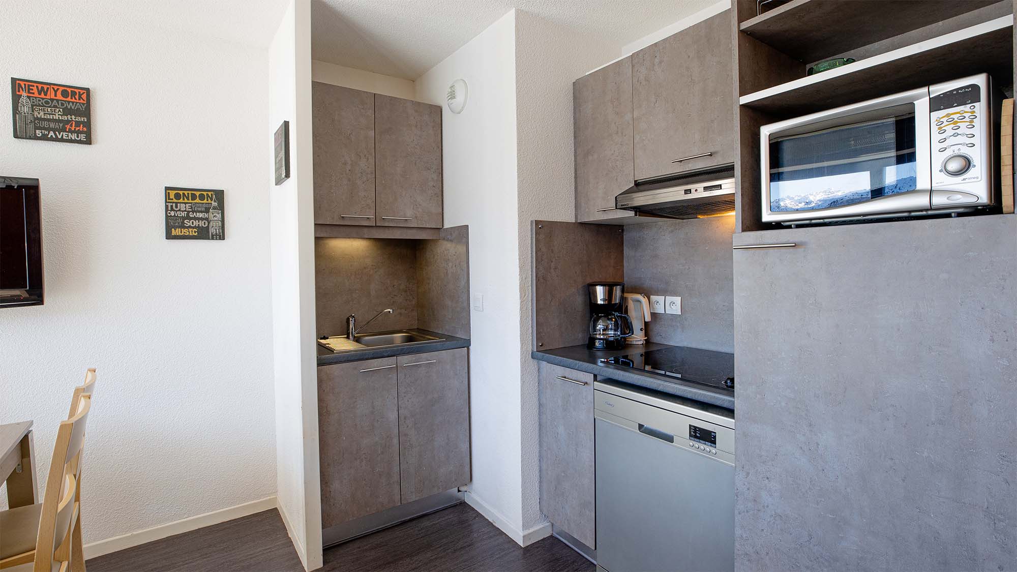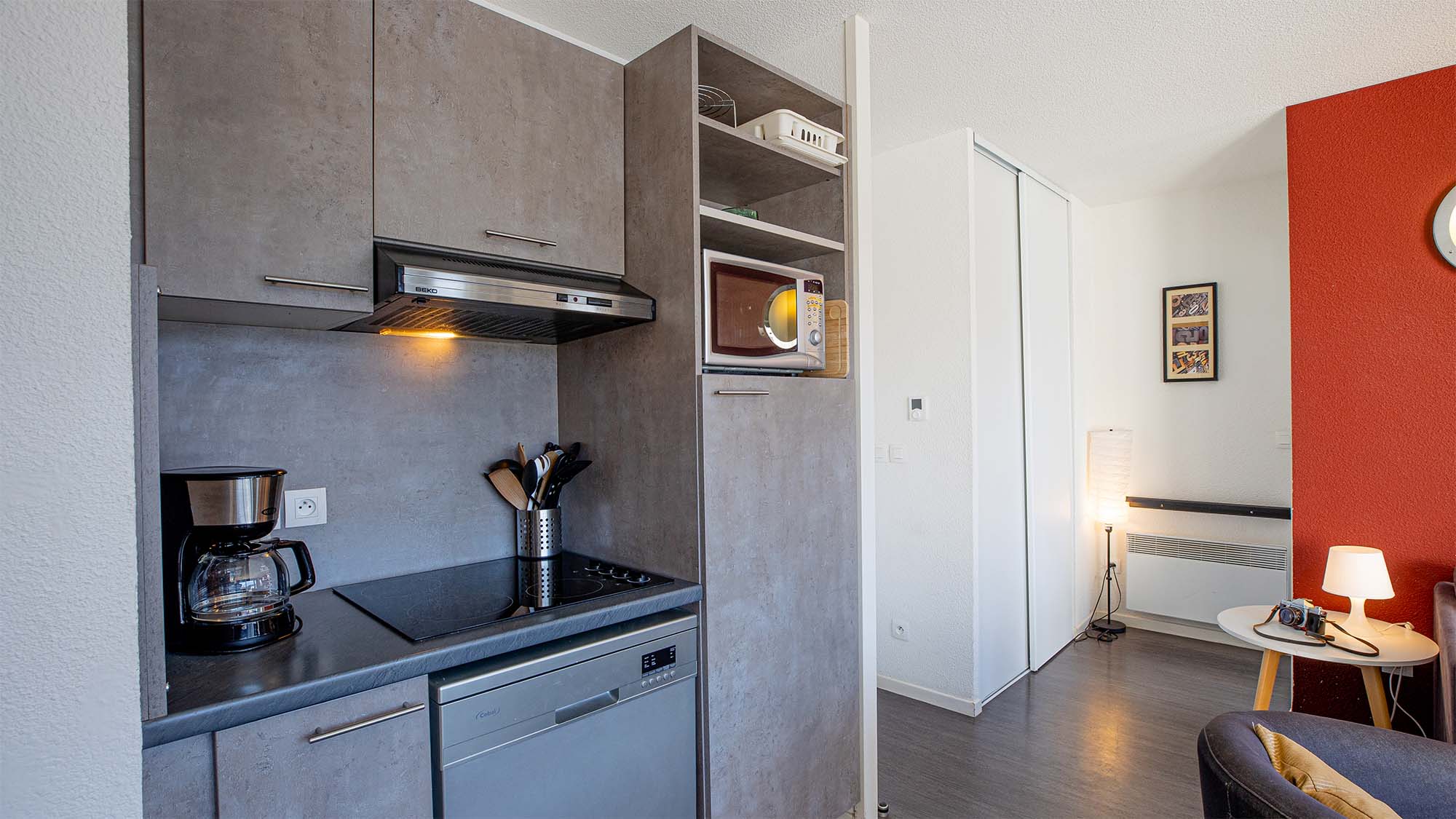 - Keuken: Volledig uitgerust met een vaatwasser, kookplaten, magnetron met grillfunctie en koelkast-perfect om zelf maaltijden te bereiden.