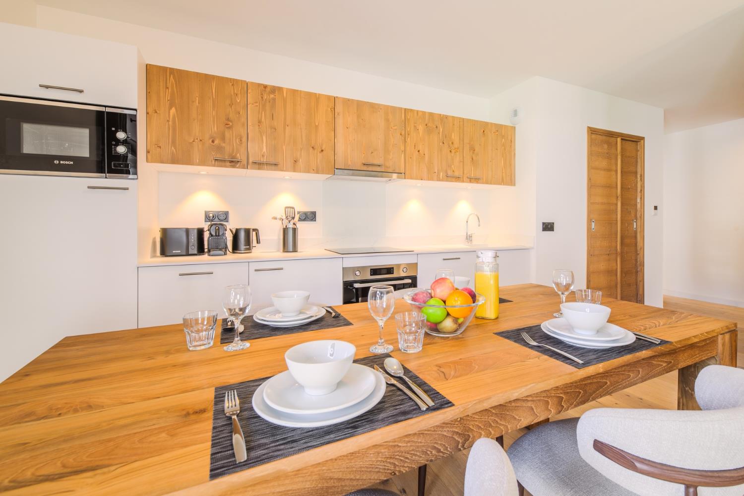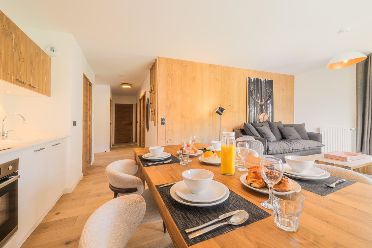 De residentie, gebouwd in harmonie met de lokale architecturale tradities, biedt een warme en intieme sfeer. De appartementen, variërend van één slaapkamer tot ruime vierkamerunits, beschikken over hoogwaardige afwerkingen en royale leefruimtes. De meeste hebben een balkon met vrij uitzicht op het Fiz-gebergte.