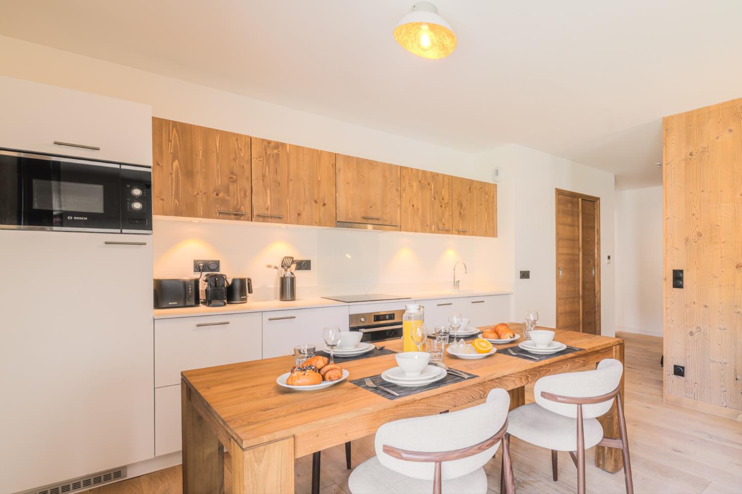De residentie, gebouwd in harmonie met de lokale architecturale tradities, biedt een warme en intieme sfeer. De appartementen, variërend van één slaapkamer tot ruime vierkamerunits, beschikken over hoogwaardige afwerkingen en royale leefruimtes. De meeste hebben een balkon met vrij uitzicht op het Fiz-gebergte.