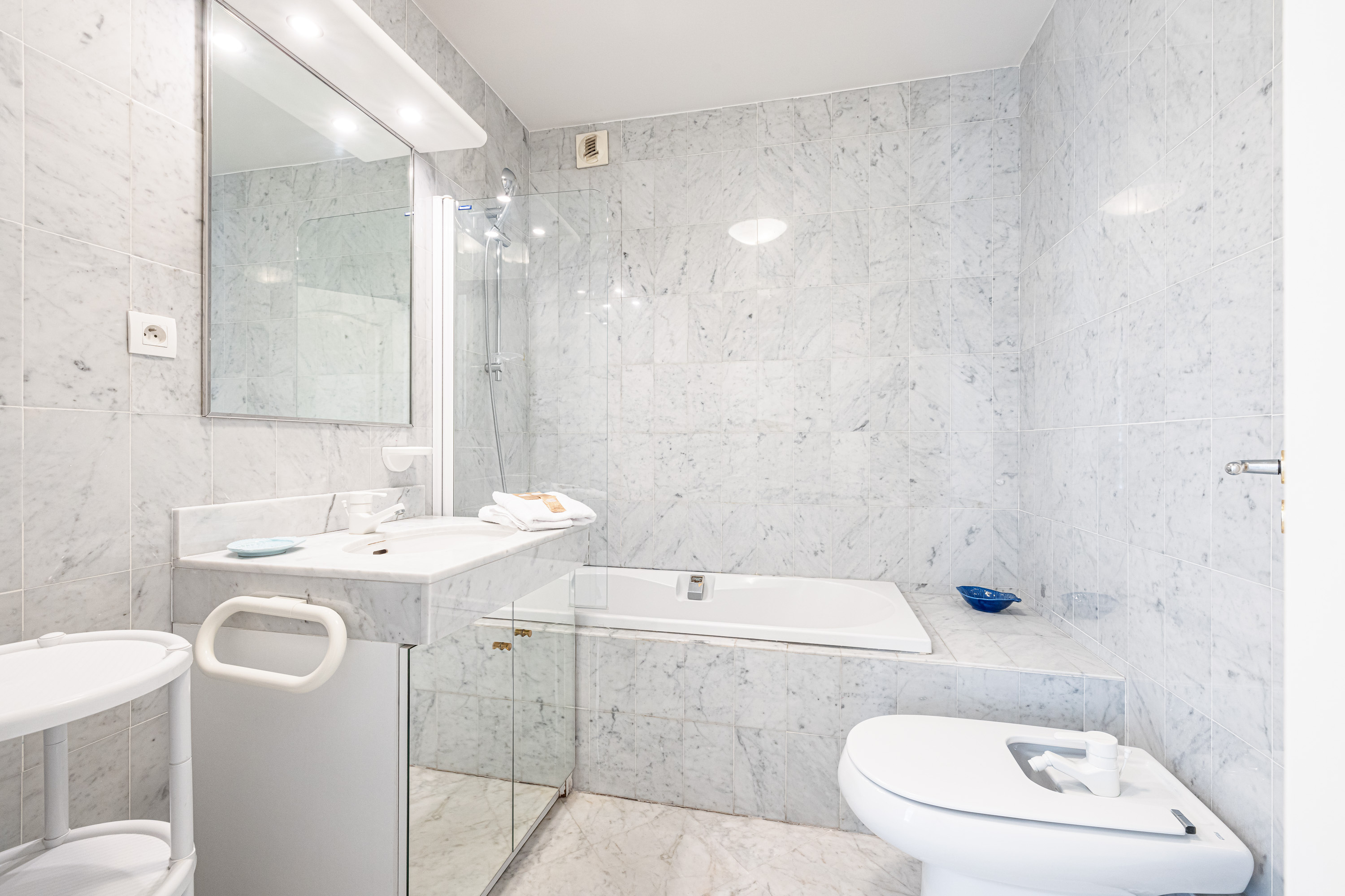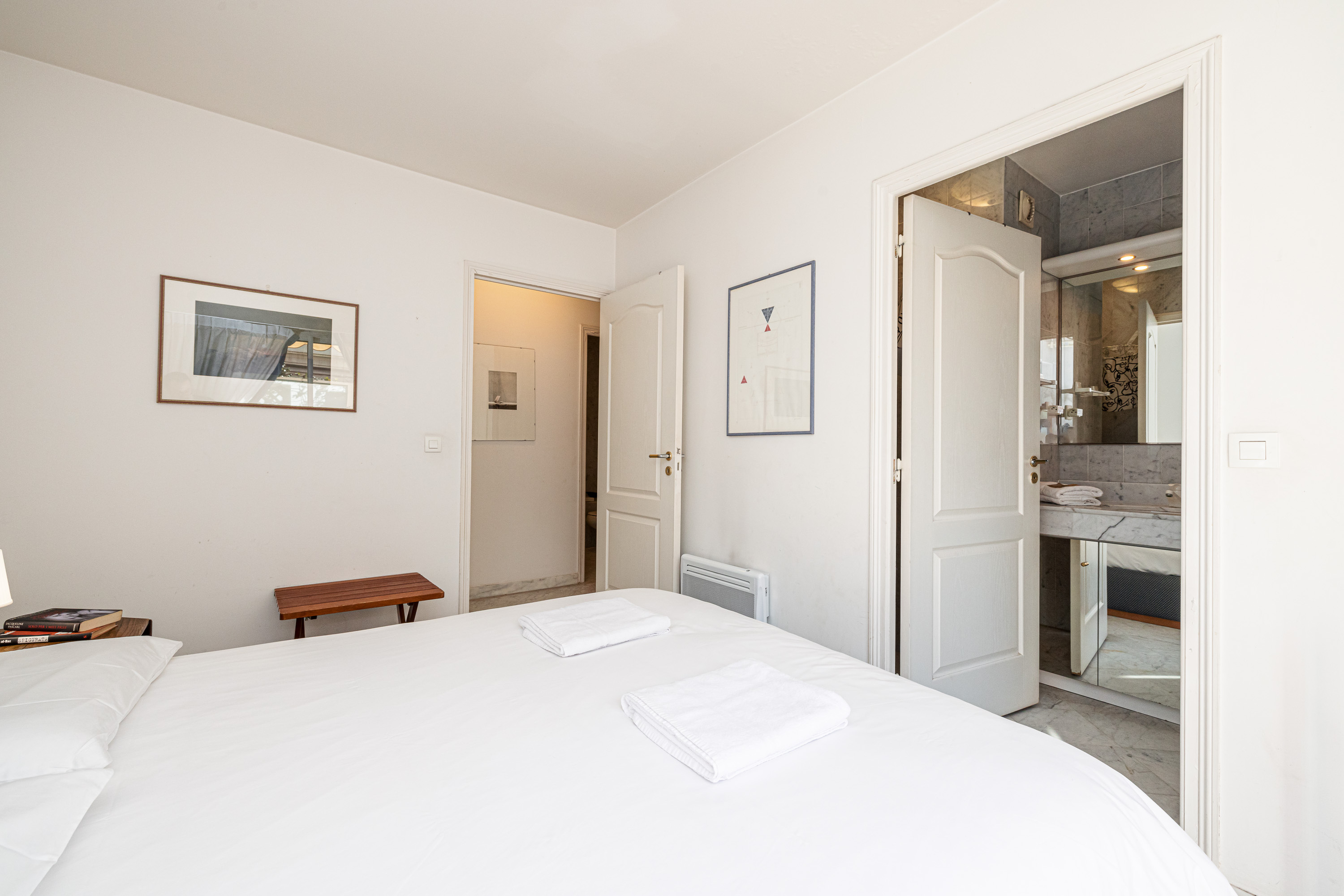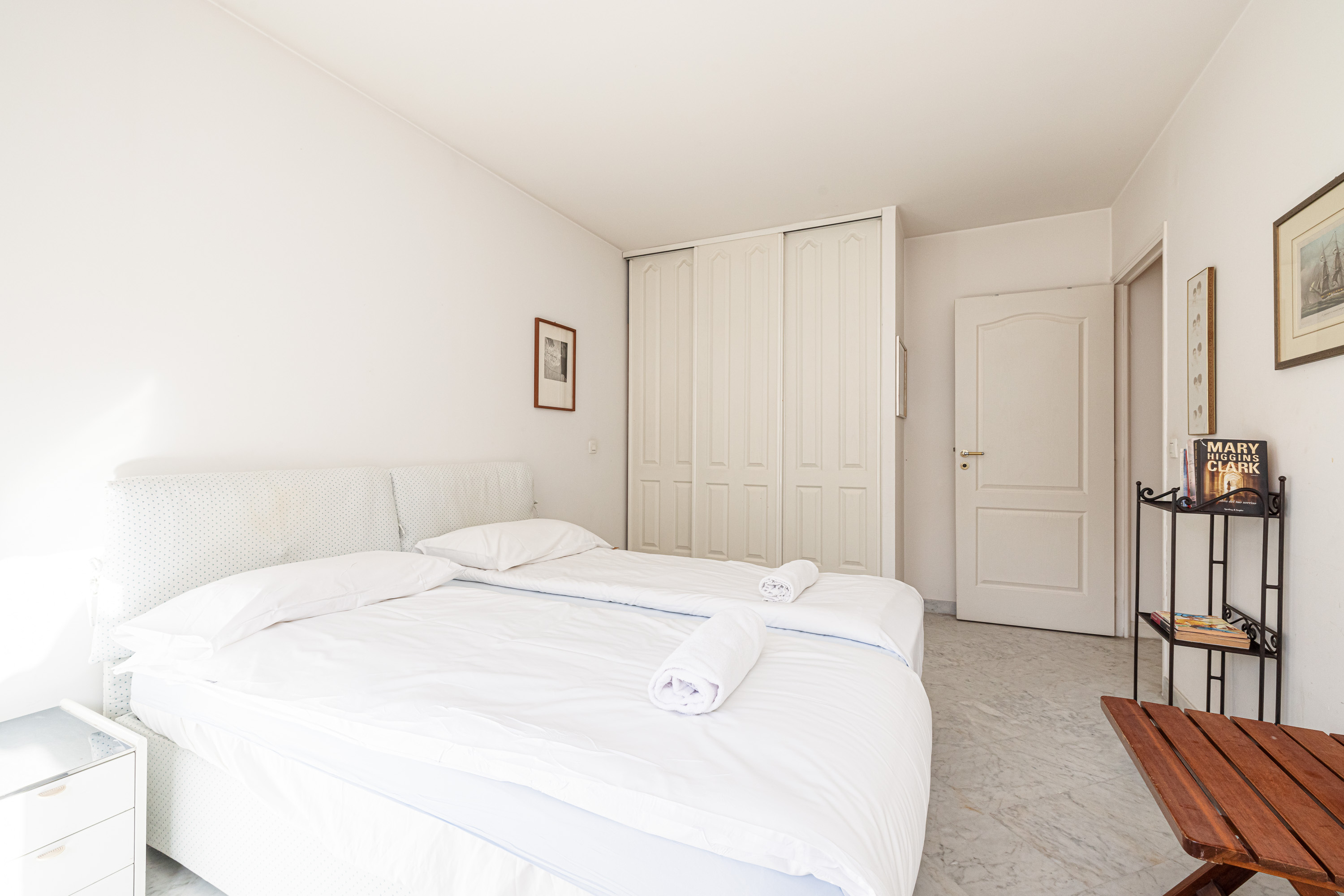 In het slaapgedeelte heeft de master bedroom een tweepersoonsbed, een eigen badkamer en een deur naar het balkon. De tweede slaapkamer is ingericht met twee eenpersoonsbedden en een kledingkast, en ook deze kamer opent naar het balkon. De elegante marmeren badkamer beschikt over een volledig bad met douche, evenals een wastafel, bidet en toilet.