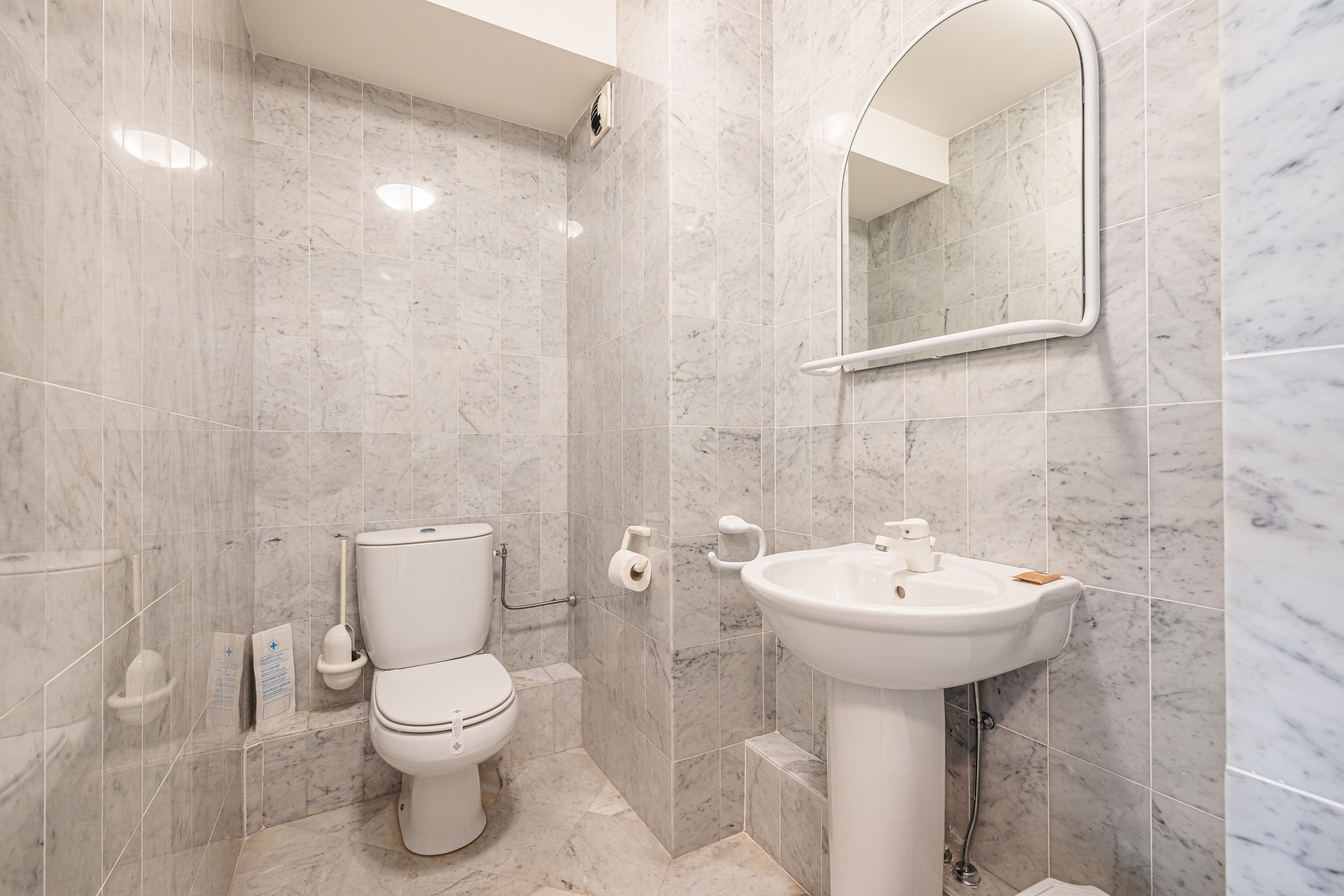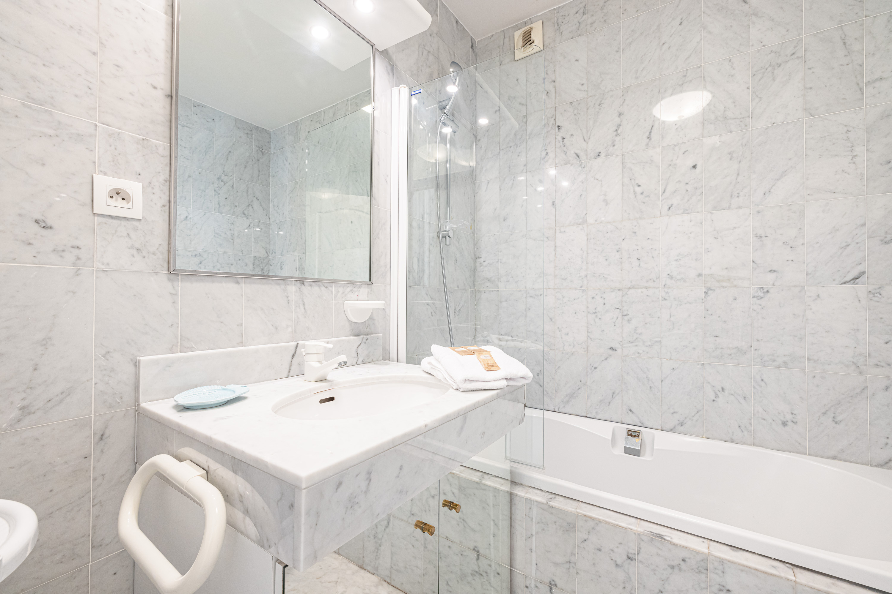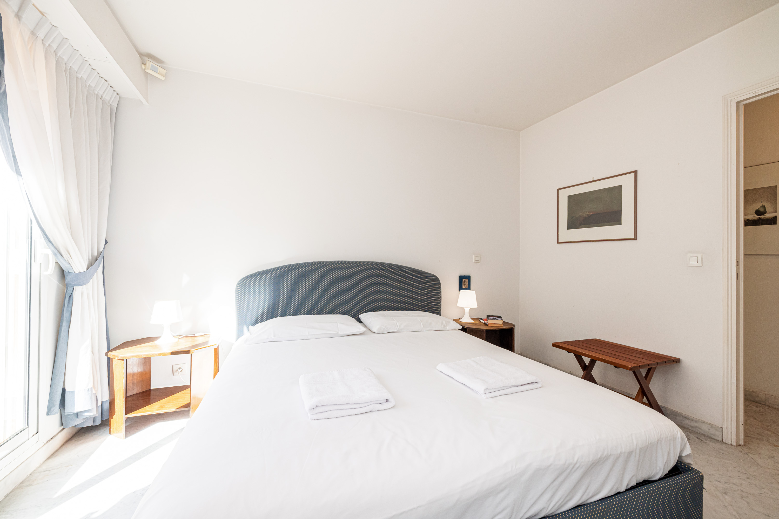 In het slaapgedeelte heeft de master bedroom een tweepersoonsbed, een eigen badkamer en een deur naar het balkon. De tweede slaapkamer is ingericht met twee eenpersoonsbedden en een kledingkast, en ook deze kamer opent naar het balkon. De elegante marmeren badkamer beschikt over een volledig bad met douche, evenals een wastafel, bidet en toilet.