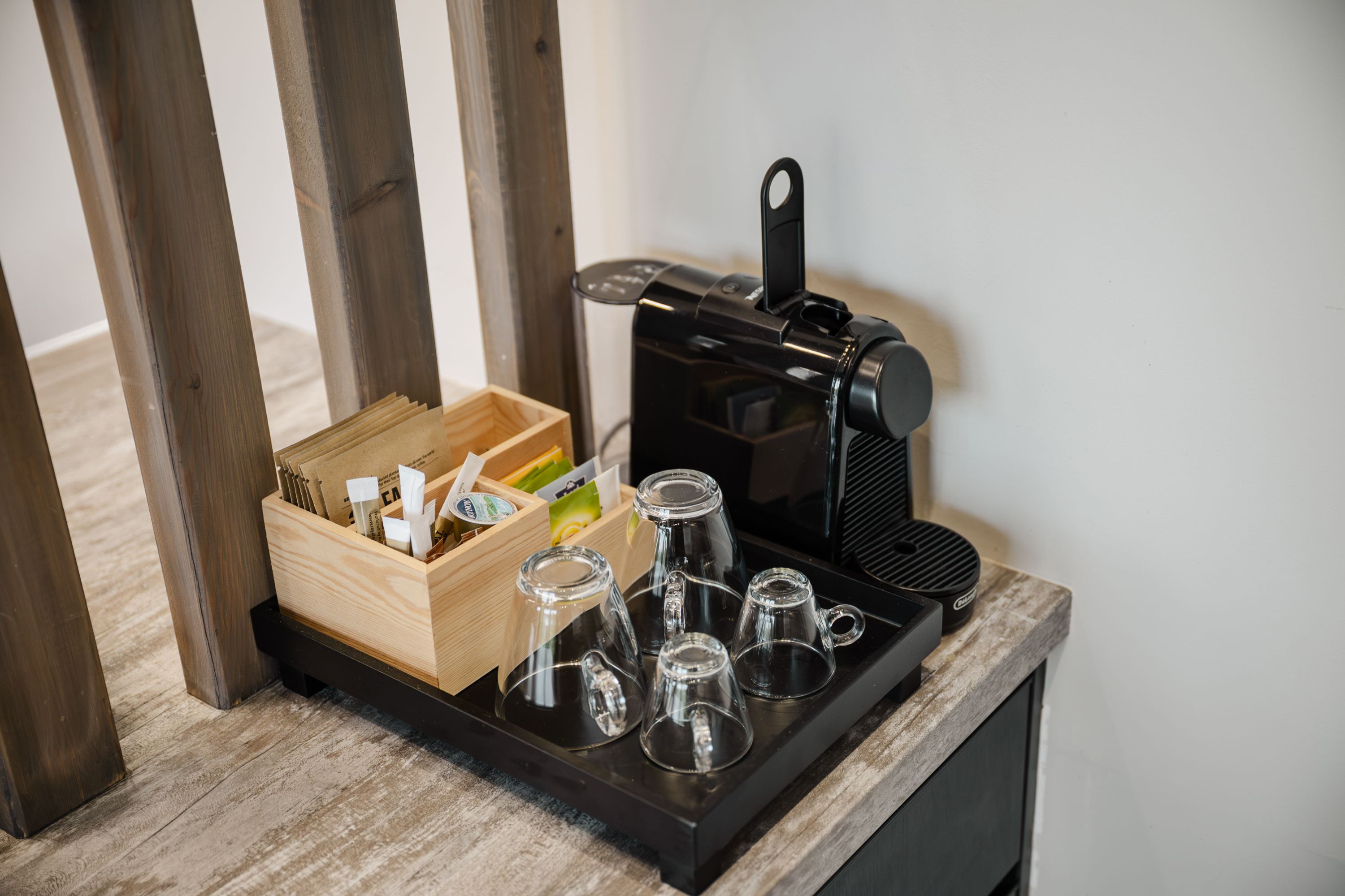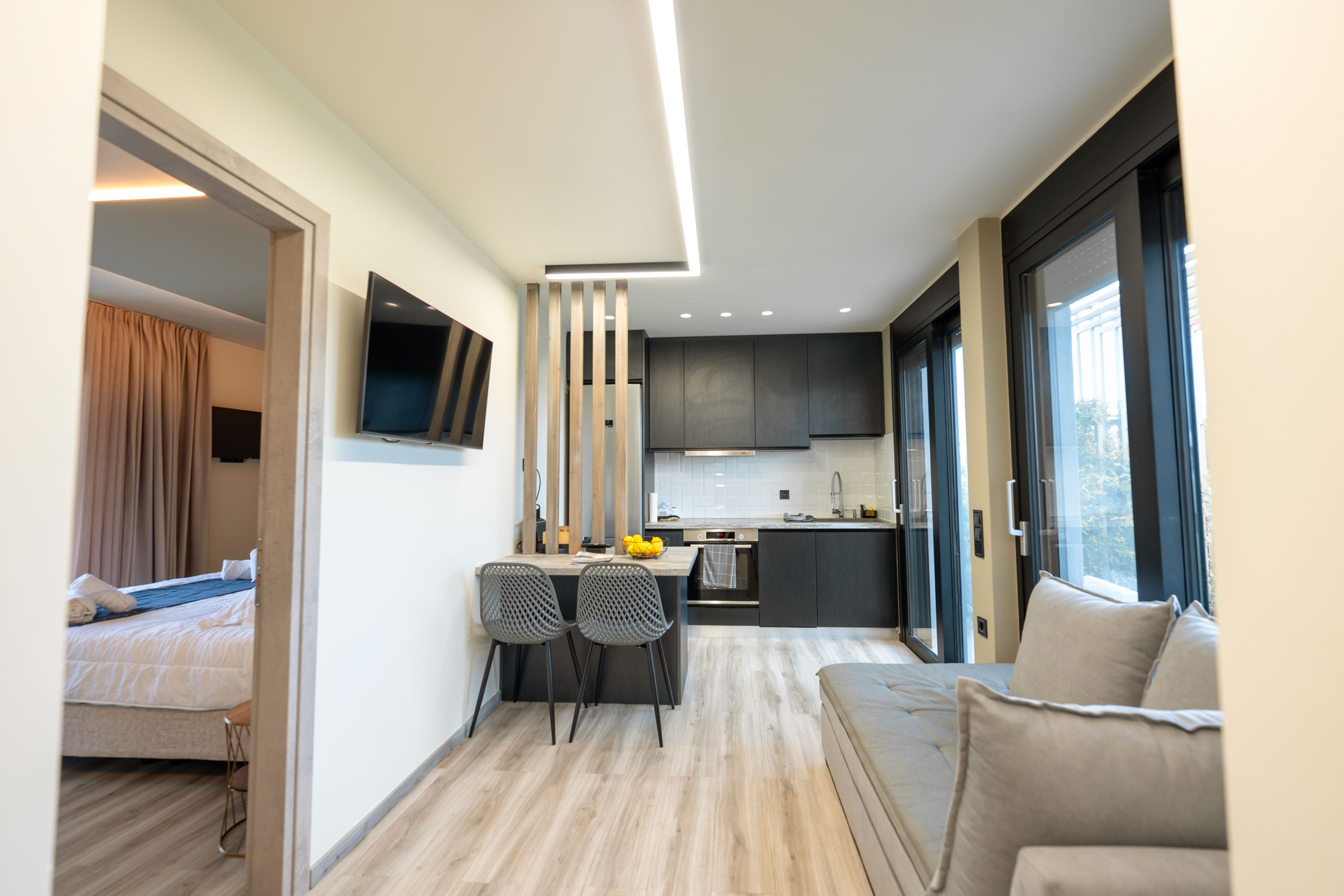 De open indeling omvat een volledig uitgeruste keuken, een gezellige eethoek en een stijlvolle woonkamer met een bank, een smart-tv en airconditioning. De badkamer is modern en functioneel, voorzien van een inloopdouche, een toilet en dubbele wastafels voor extra gemak en comfort.